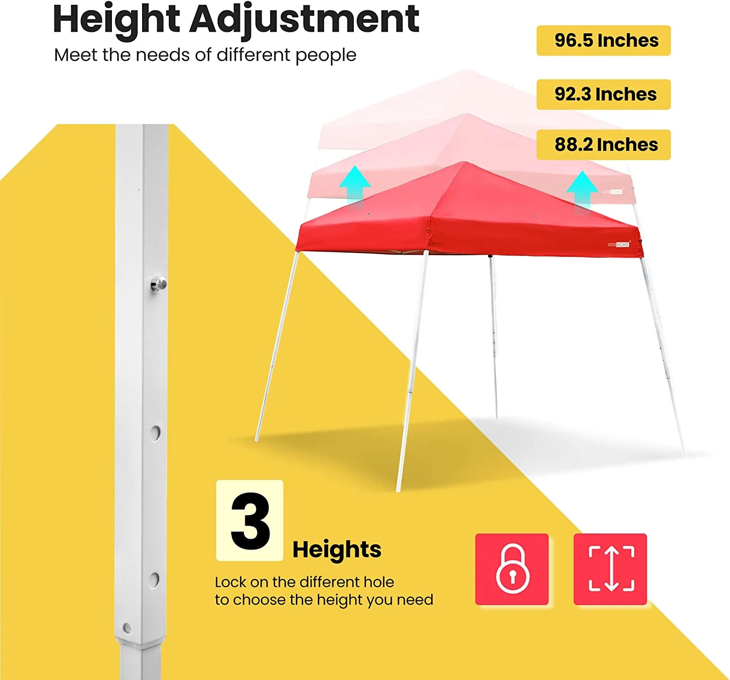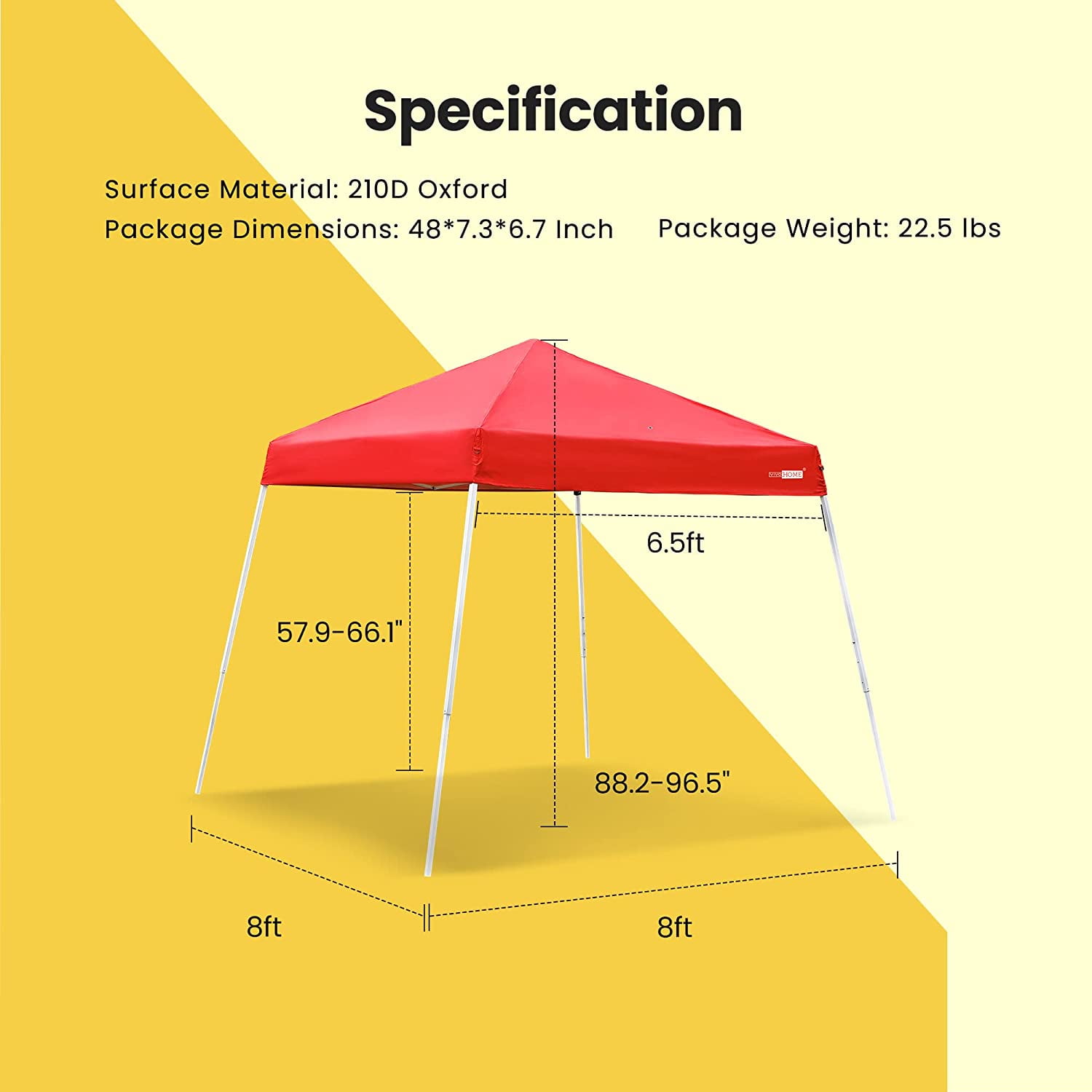 VIVOHOME Slant Leg Party Tent Beige 8 x 8 ft Instant Shade for Instant Enjoyment! Enjoy cooling shade with the VIVOHOME Slant Leg Instant Canopy. The tent shade is made with waterproof Oxford tough fabric and interior silver lining, which is of great help in blocking out UV Rays and sun exposure. A sturdy and high-quality steel frame with a white powder-coated finish is for preventing rust, corrosion, peeling, or chipping. During your next summer, enjoy the complete shade under the sun while camping, outdoor activities, golf, football, and so on. Equipped with easy handling adjustable small round buttons on the middle of the frame, which is easy to regulate different heights and does not influence the appearance of the tent. You can easily and quickly assemble or take down the tent with no hassle. Ideal for providing shade to protect you from sunlight and rain anytime and anywhere. This tent is suitable for various occasions such as family gatherings, picnics, barbecues and camping etc. The included anchor kit adds solid reassurance that your tent is always safe and secure. Know More About the Product Product Specifications: Material: Stainless Steel + 210D Oxford Fabric Color: Red Adjustable Heights: 70.9, 74.8 and 78.7 inches Centre-heights: 90.6, 94.5 and 98.4 inches Product Size: 8 x 8ft Item Weight: 18.7 lbs Note: Not suitable for use in extreme wind or rain weather Package Includes: 1 x party tent, 1 x carry bag, 4 x anchor ropes, 8 x ground stakes An excellent Canopy Tent for protection from the sun at parties, at beach, at park, in back yard, sporting events, etc. UV PROTECTION An excellent sunshade, whose inner silver-coated surface reflects sunlight to provide you with all-day UV protection. Water-resistant fabric makes it also a great rain shelter. FAST SET-UP Quick and easy pitching and take-down with included instructions; comes with ground stakes and ropes for added security. STABLE FRAME With a high-quality white-powder coated steel frame and unique push-button system, you can use this tent for years and adjust it as much as you want.
