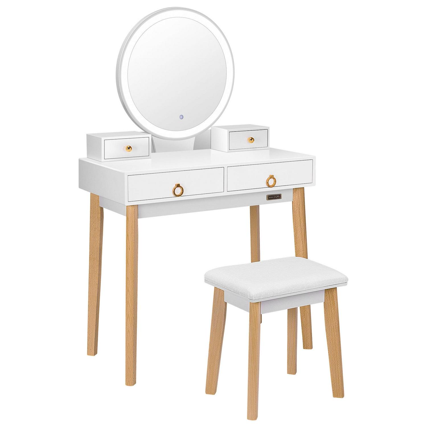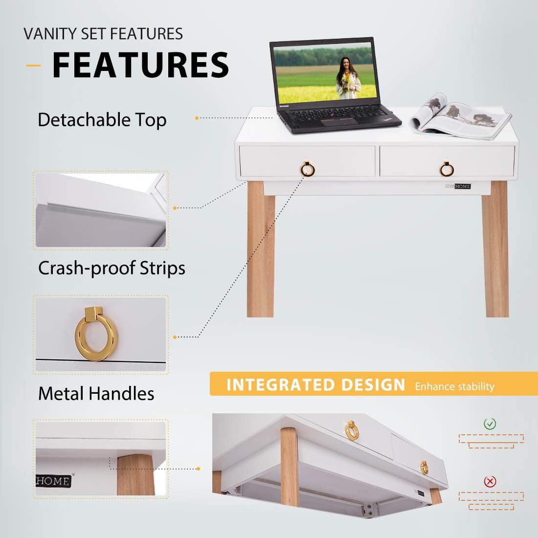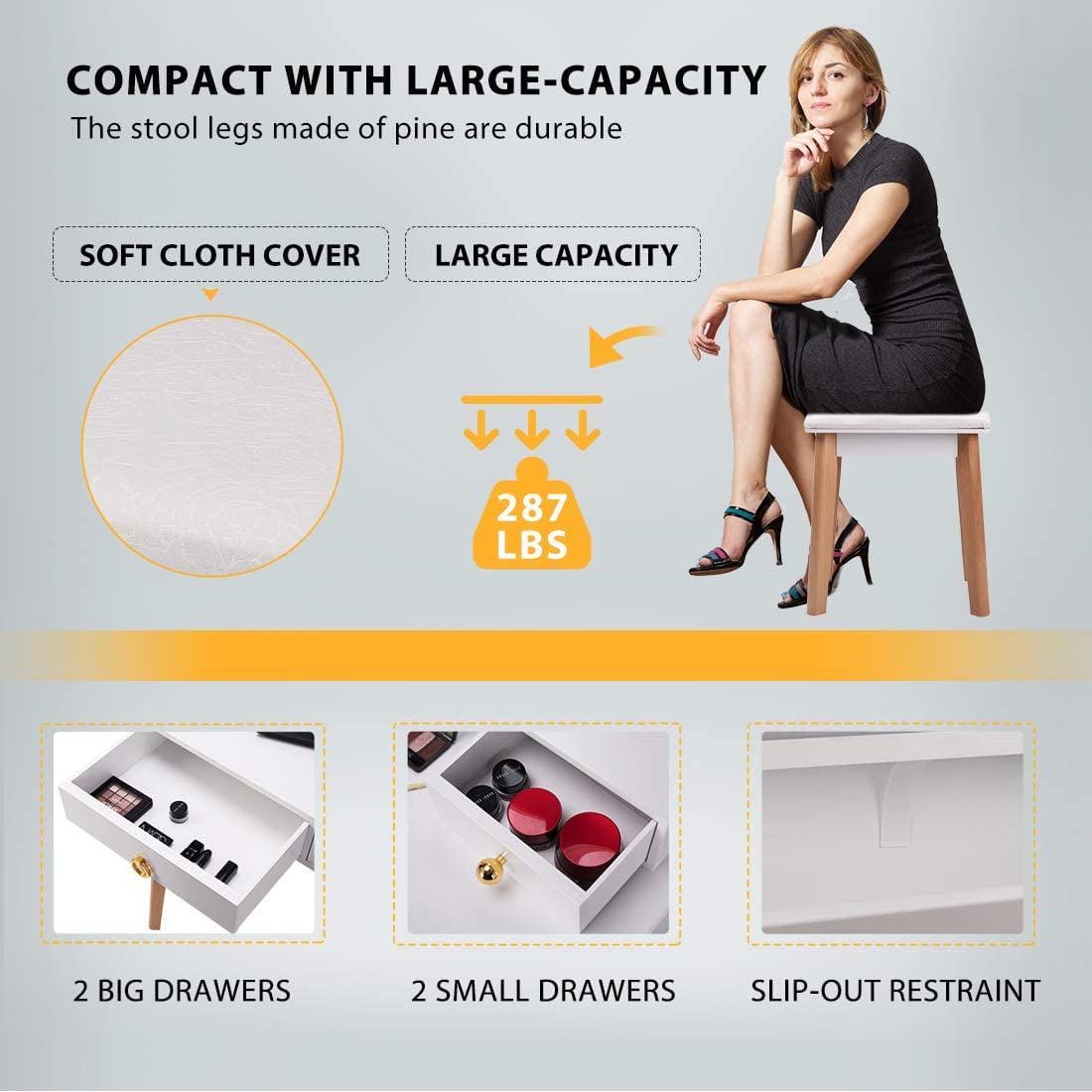 – PREMIUM QUALITY: The MDF table is made of 100% beech wood (legs) and is sturdy, durable, and scratch-resistant; Naturally-colored legs and supports create a beautiful aesthetic; Anti-slip drawers create zero noise and plastic clips inside the drawers prevent them from falling out; The padded stool is comfortable and aesthetically-pleasing, perfect for your home; And the mirror can be detached from the table so you can use it as a desk or use the mirror independently