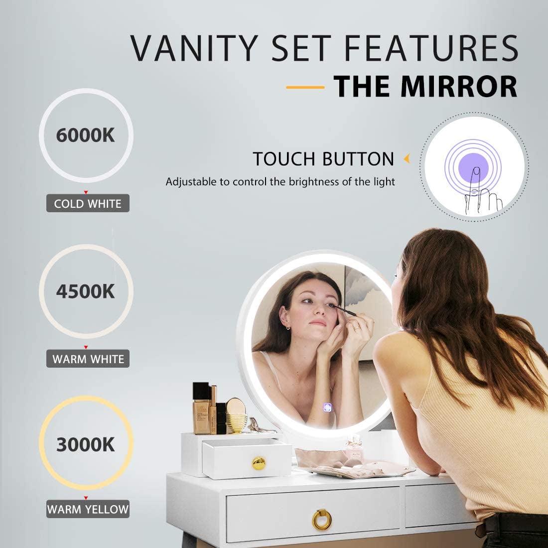 VIVOHOME Vanity Set with 3-Color Touch Screen Dimmable Lighted Metal Mirror, Makeup Table with Drawers, Padded Stool, White