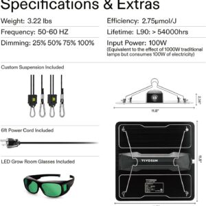 – Safe to Use: The pair of grow room glasses in the package can protect your eyes when the light is turning on; The VIVOSUN US-patented rope hangers are easily attached to the indoor tent or other tools; The IP65 rating surface can meet your demand in different indoor planting environments; We provide you with a 5-year after-sales warranty service, and if you have any problems with the item you received, please do not hesitate to contact us