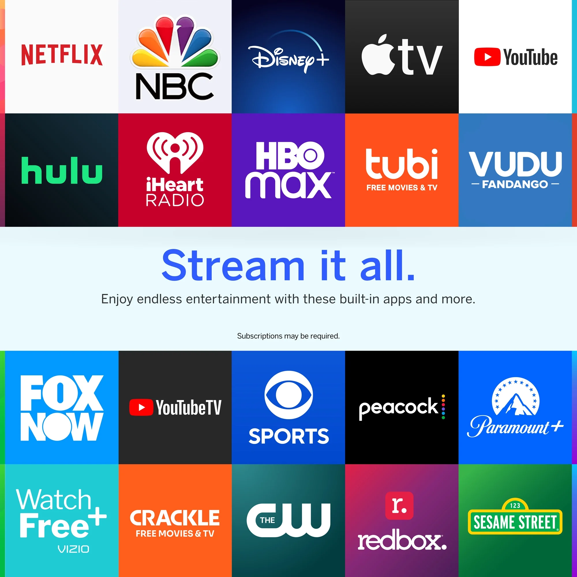 Versatility and performance collide with the new D-Series Full HD Smart TV that comes loaded with a full array backlight for better contrast and uniformity, brilliant 1080P Full HD resolution and an ultra-fast processor with support for immersive audio pass-through with Dolby Atmos and DTS:X. Game on with the V-Gaming Engine that enables next-level gaming performance with features like Variable Refresh Rate, auto game mode and lower latency gaming. D-Series blends power, speed and versatile size, while featuring VIZIO’s award-winning SmartCast platform. Enjoy the very best selection of built-in apps from top-tier streaming services combined with an unmatched user experience and interface. With hundreds of free channels together with Apple Airplay 2 and Chromecast built-in, the D-Series offers unparalleled entertainment in a size that fits your lifestyle.