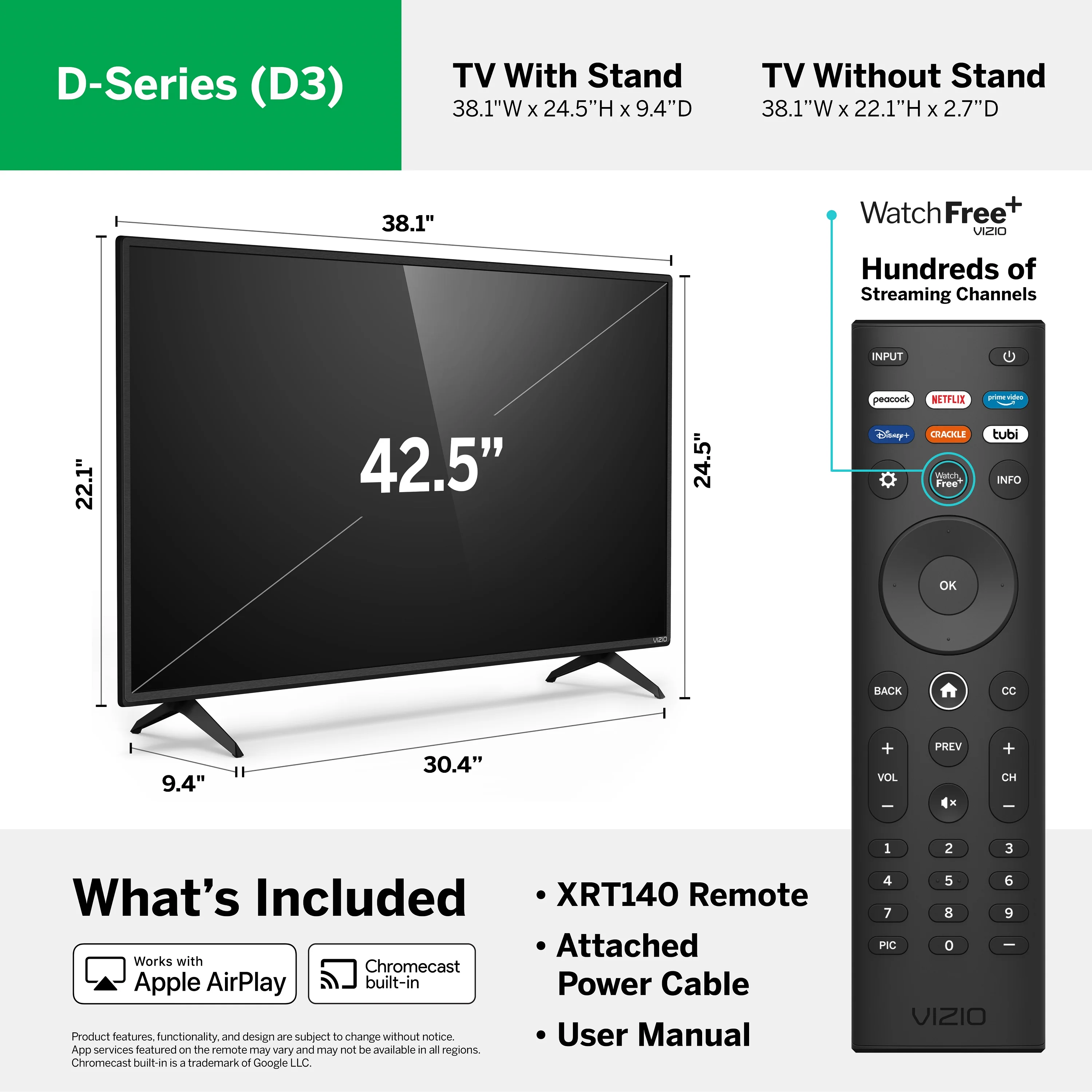 VIZIO D-Series® 43″ Class (42.5″ Diag.) Full HD Smart TV Full Array LED backlight Spatially distributed LEDs drive the screen’s backlight to deliver exceptional light uniformity, color consistency and a more responsive picture from edge to edge for an incredible high-definition image 1080p High-Definition Watch TV in crisp, clear 1080p Full HD resolution and experience a brilliant picture with the VIZIO D-Series. IQ Picture Processor Delivers superior picture processing, faster navigation, and quicker load times to get to your favorite content faster. V-Gaming Engine Automatically makes the latest console gameplay more responsive with Variable Refresh Rate,, Auto Game Mode, and the D-Series lowest input lag. VIZIO SmartCast With lightning-fast interface and intuitive navigation, enjoy instant access to the best selection of apps from top-tier streaming services like Netflix, Disney+, YouTube, and many more right on the TV. Watch Free Channels A cord-cutter’s dream. Unlimited free viewing from hundreds of specially curated channels – movies, TV shows, news and more. No fees, no logins and no subscription needed. VIZIO Voice It has never been easier to quickly and easily find what to watch. Just ask. Voice controls are available with the SmartCast Mobile app on iOS and Android devices. Apple AirPlay 2 and Chromecast built-In Stream, control, and share your favorite movies, shows, music, photos, and more from your Apple or Android devices directly to the TV. You can even wirelessly mirror content such as web pages and presentations from your iOS device or Chrome browser right to the big screen. Center of Your Smart Home Integrates seamlessly with Apple HomeKit, Google Assistant, and Amazon Alexa-enabled devices. Check on your front door camera, or control the lights and TV with a single voice command. With D-Series, the smart home possibilities are endless. 2 HDMI ports High-speed HDMI connectivity offers better video performance from all your favorite entertainment devices as well as Dolby Atmos and DTS:X passthrough for a more immersive audio experience. DTS Virtual: X Advanced virtual surround sound audio from the TV’s built-in speakers. USB Multimedia Play photos, music, and video right on the big screen using the built-in USB port. Quick Start Mode Enable Quick Start Mode to turn your TV on faster and automatically with a simple voice command or when using AirPlay or Cast. Enabling Quick Start Mode will change the energy consumption required to operate this TV.