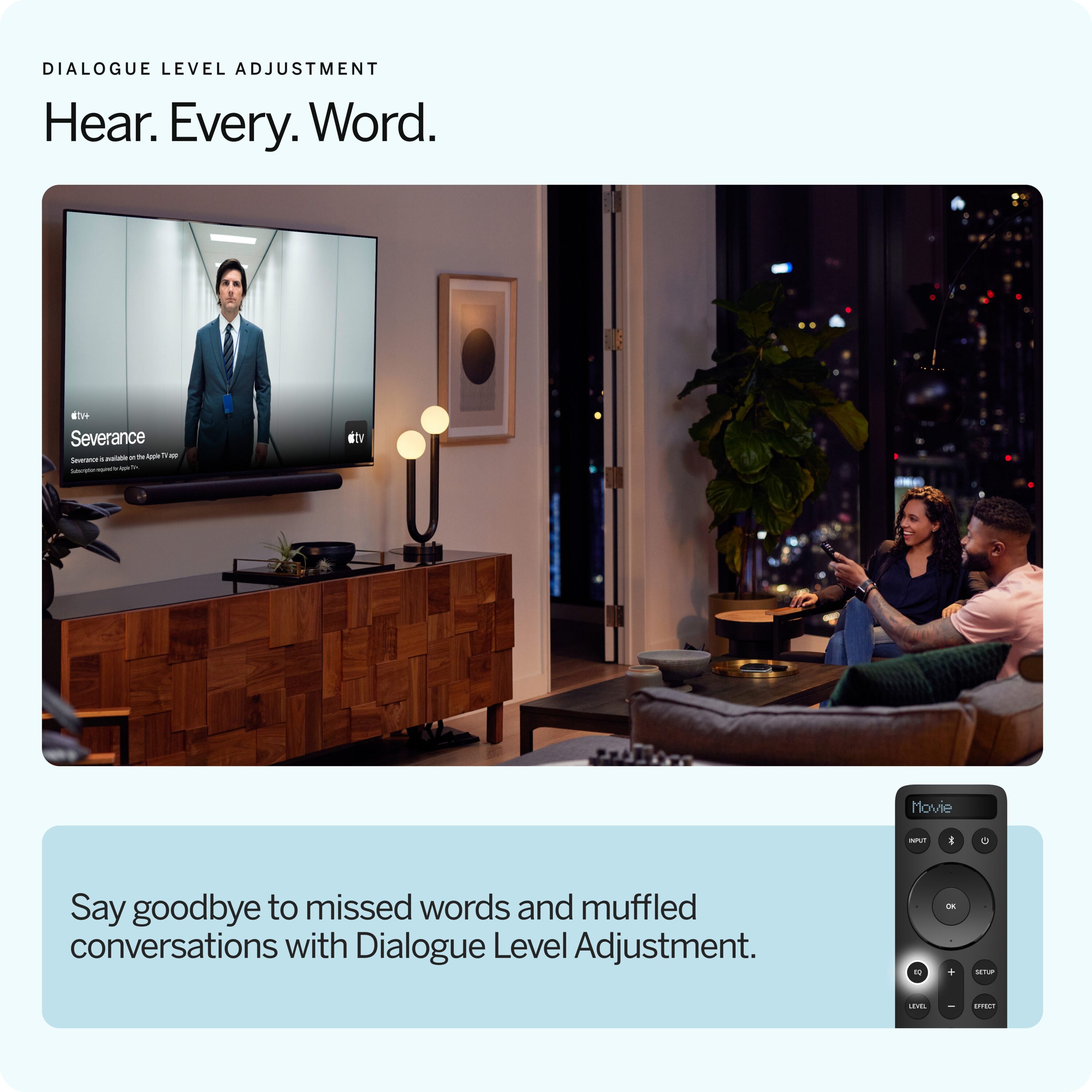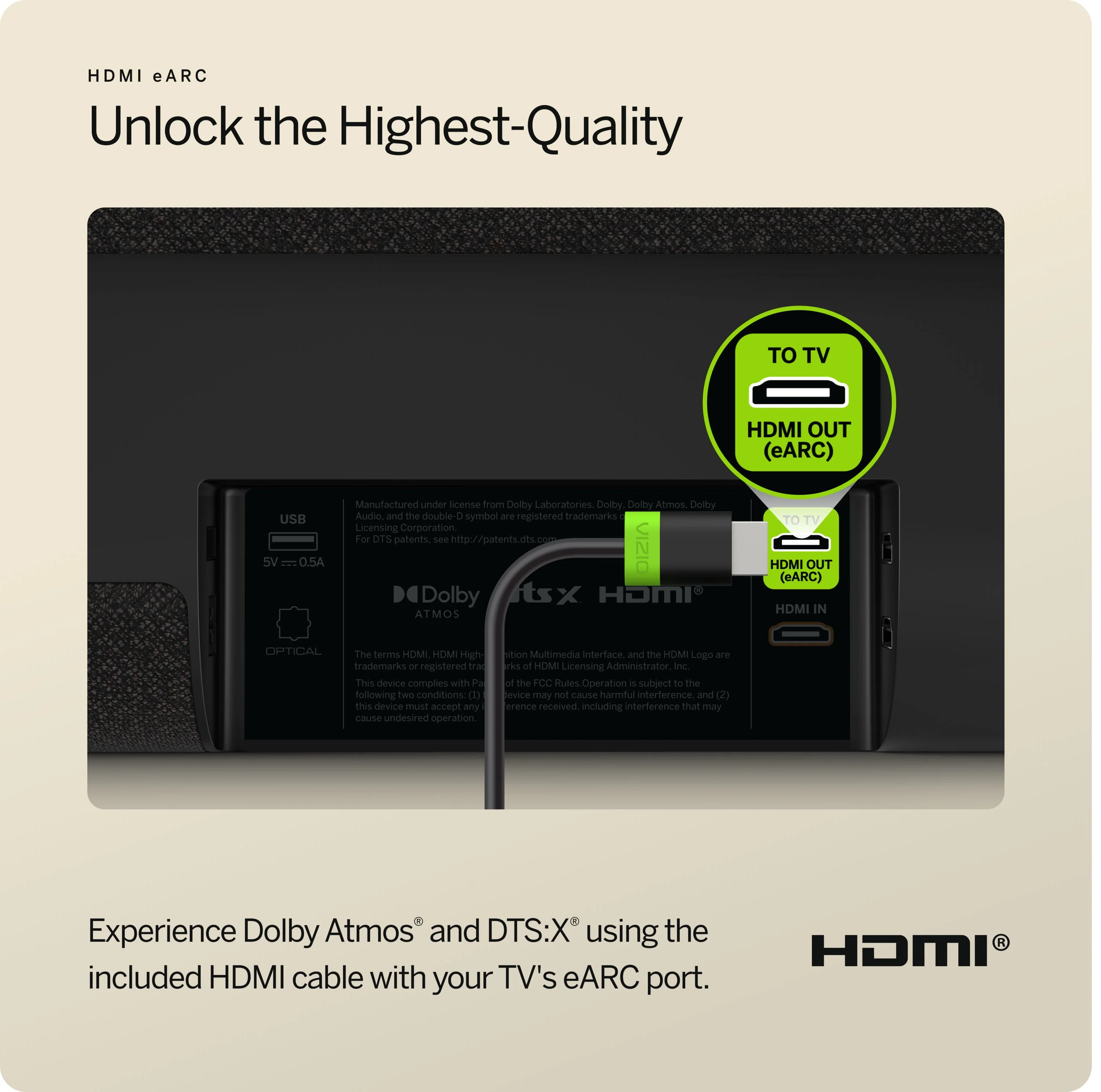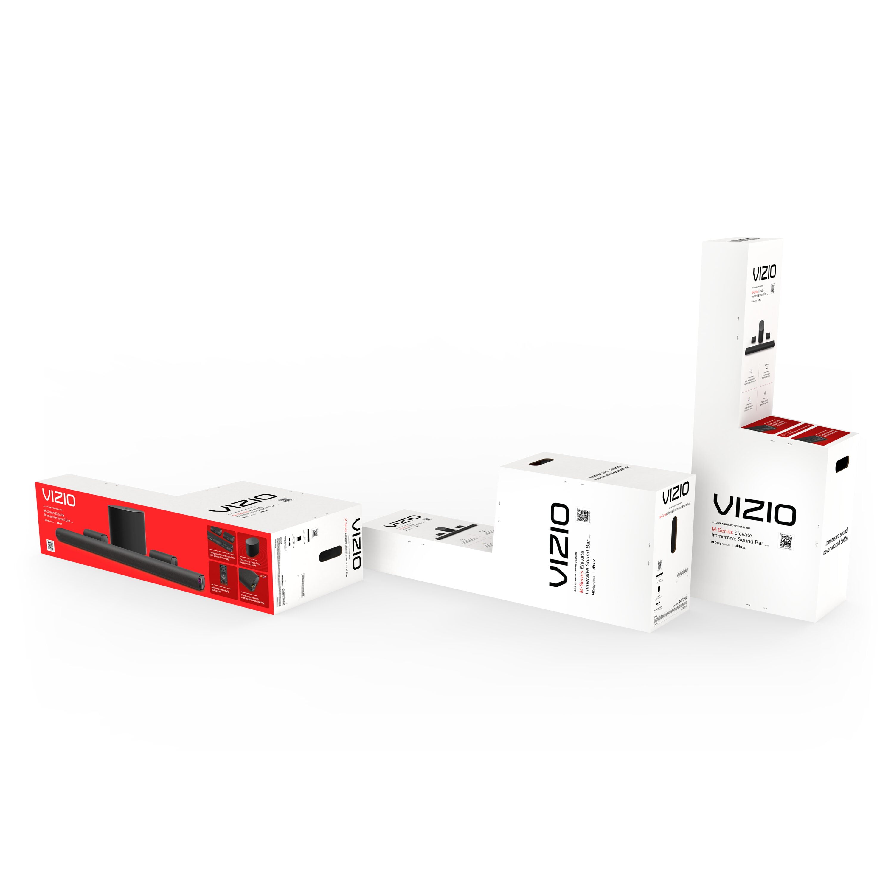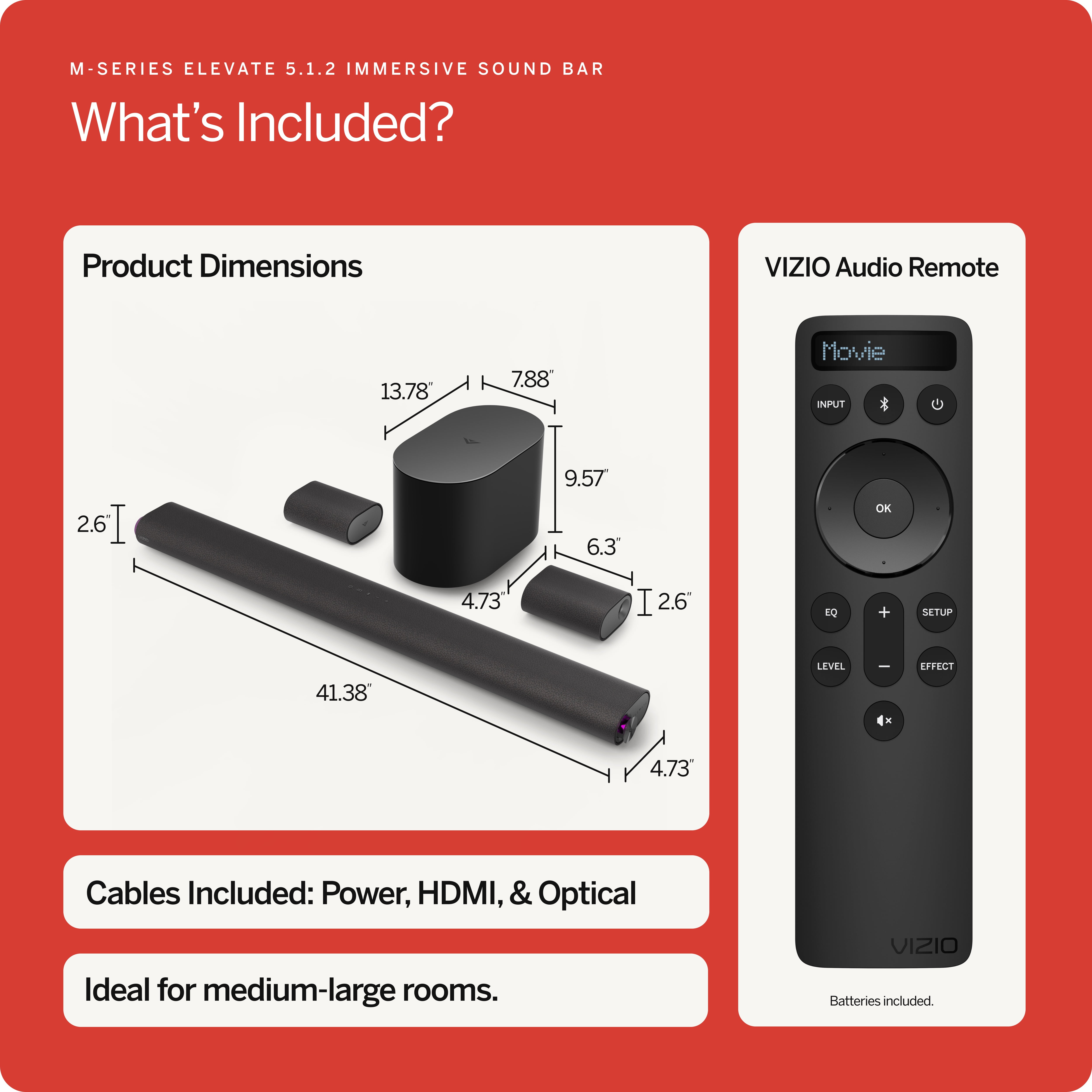 VIZIO M-Series Elevate 5.1.2 Sound Bar with Dolby Atmos and Wireless Subwoofer – M512e-K6 Evolved to revolve. Adaptive Height Speakers integrated into the sound bar automatically rotate up or forward to optimize the performance of the system. When rotated up, Dolby Atmos and DTS:X soundtracks are strikingly immersive. When rotated forward, the height speakers are repurposed to deliver music with breathtaking power and dynamics. Immersive sound, brought to you by people who love sound. Dolby Atmos and DTS:X audio technologies captivate your senses with realistic sounds above and behind you for performance that completely immerses you in the world of your entertainment. Your favorites, the way they were meant to be heard. Lean in and get lost in your favorite content with 103dB of premium audio powered by 13 high-performance speakers. With a newly designed wireless subwoofer and integrated tweeters and woofers, this sound bar delivers clarity, spaciousness, and impact down to an impressive 45Hz. Multi-dimensional masterpiece. Experience the thrill of sound that moves throughout your room with 5.1.2 channels of immersive audio. Each channel plays a pivotal role in the creation of a soundscape that places you in the middle of your entertainment. It’s psychoacoustics, but you can call it magic. An optical illusion for your ears, DTS Virtual:X technology delivers the sensation of speakers placed throughout your room, above and behind you, for a sonic landscape that’s remarkably lifelike. It’s OK to stare. Draped in a carefully selected charcoal-colored textile, the 42-inch low-profile enclosure is punctuated on either end by a pair of spun aluminum discs that subtly catch and reflect the light when in motion. One wire. Many talents. Unlock the highest-quality audio formats like Dolby Atmos and DTS:X with the simplicity of a single HDMI eARC connection. This one-wire connection also enables you to control the sound bar with your TV remote. Connectivity without compromise. Marvel at the stunning picture quality Dolby Vision has to offer. Featuring full support for 4K HDR and Dolby Vision passthrough, the sound bar is ready with an HDMI input should you need one. Pair. Connect. Stream. Bliss. Wirelessly stream your favorite playlists, podcasts, audiobooks and more directly to your sound bar from a compatible mobile device using the included Bluetooth functionality. It’s the Bluetooth you know and love, only better, because it sounds fantastic. Google. Siri. You’re free to choose. Connect your preferred voice assistant via the 3.5mm input (or Bluetooth) to amplify your favorite household companion. It’s always on and ready for a command and will automatically lower the volume of your content so you can hear voice feedback clearly. Set the mode that suits your mood. Take control with the included backlit remote featuring one-touch access to preset EQ modes for gaming, movies, music and more. It’s comfortable in the hand and easy to navigate. Even in the dark. Hear. Every. Word. No need to turn it up. And down. And up again. Dialogue Level Adjustment makes it easy to understand what people are saying. Better together. Enjoy easier installation, setup, and operation when paired with select televisions from VIZIO. The dual-purpose stand found on M-Series televisions was engineered to quickly accommodate the M-Series Elevate sound bar. The integrated audio menu makes fine tuning audio settings a breeze when connected via HDMI. We worked hard to make it this easy. From unboxing to setup to daily use, VIZIO products are refreshingly easy to use. We’re here for you. Need a hand with your new sound bar? Have a question about the television you purchased last year? Lifetime technical support comes standard on every VIZIO sound bar and television model. Our award-winning support team is here to help! A match made in Southern California. VIZIO televisions and sound bars are designed in Irvine, California with an obsessive attention to detail. We carefully tune each model to ensure your home entertainment experience is a spectacle of sight and sound.