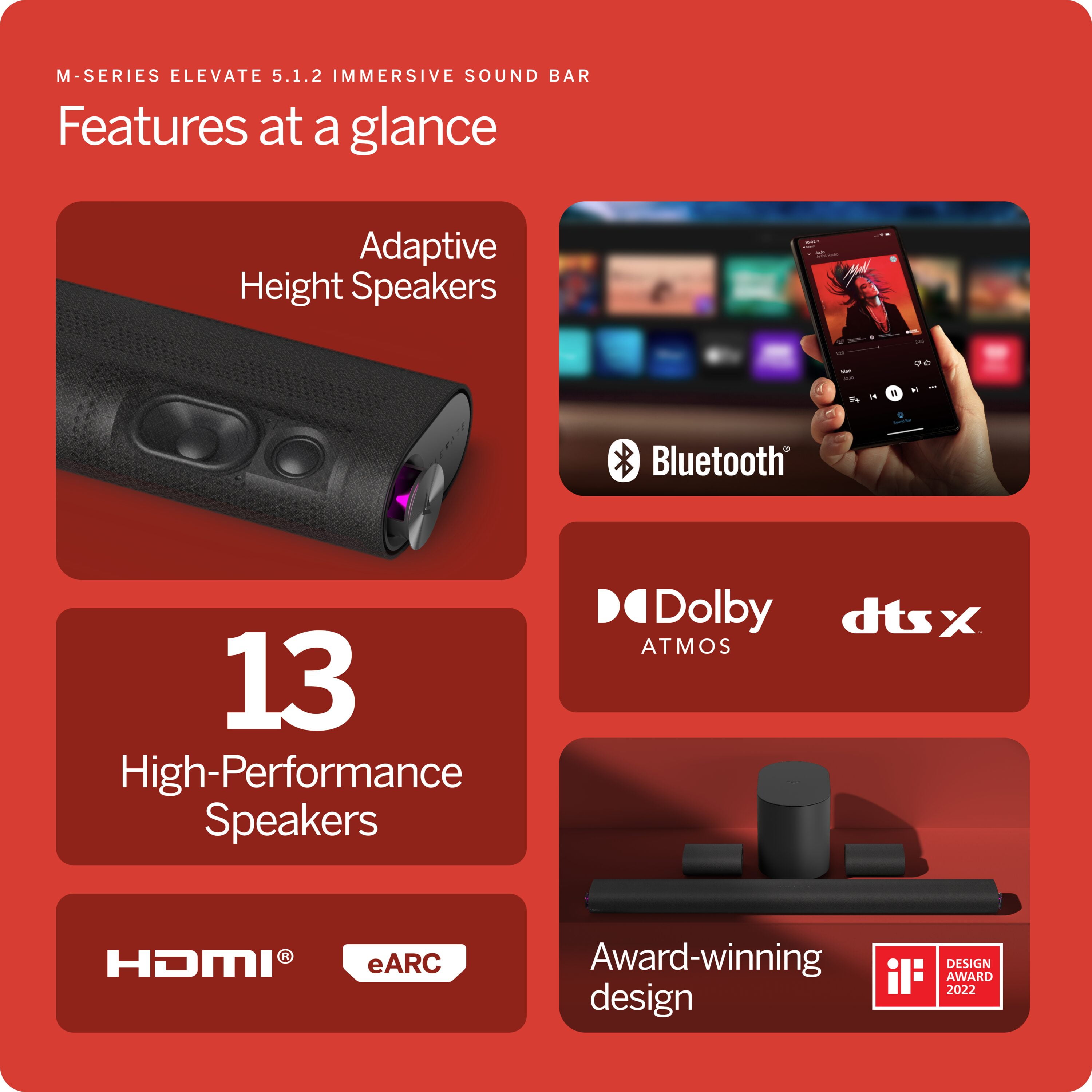 A revolution in design, the M-Series Elevate 5.1.2 Immersive Sound Bar from VIZIO combines thrilling Dolby Atmos and DTS:X sound, patented Adaptive Height Speakers that automatically rotate to optimize performance, and advanced connectivity like HDMI eARC into an elegant system designed to blend harmoniously with your home decor. Immersive sound never looked better.