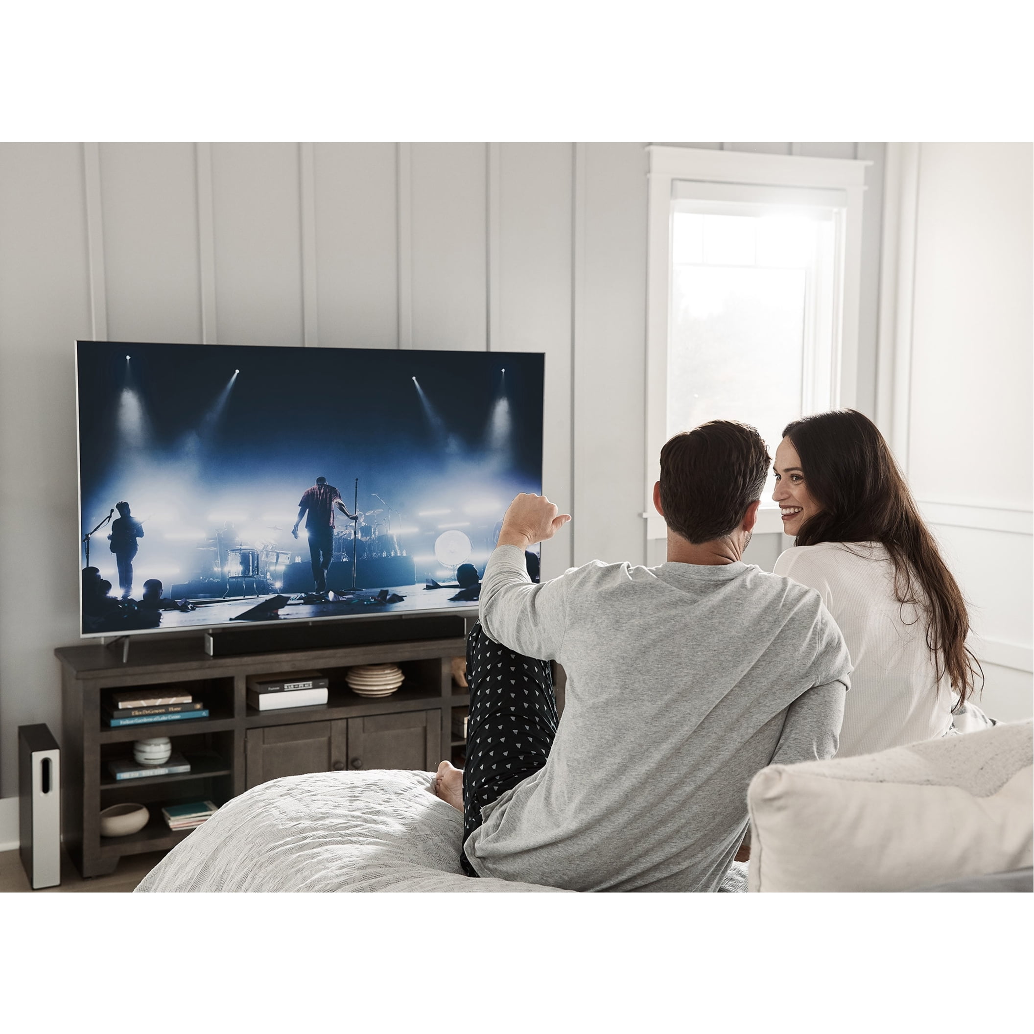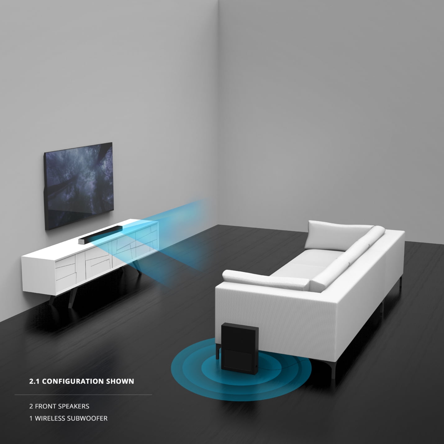 The perfect sound for any space. LivingRoom. Provides the optimal sound performance. Bedrooms. A clearer, more balanced sound to complement the TV experience in any type of bedroom. Den & Playroom. The perfect system configuration for a place where clean and simple is key. Upgrade Your Home Entertainment High-Performance Audio Full-range speakers in the sound bar, and a wireless subwoofer featuring a 5.25″ driver deliver a premium sound experience. New Wireless Slim Subwoofer. All-new design that’s built to fit discreetly in more spaces, in a corner of a room or even under a couch to deliver even more room-rumbling bass. Great Sound. Made Even Better. The VIZIO 36″ 2.1 sound bar system is engineered with DTS Virtual:X technology – adding a virtual element of sound height and depth to all your favorite content for a wider, more immersive audio experience. Stream your favorite artists and apps with Bluetooth.