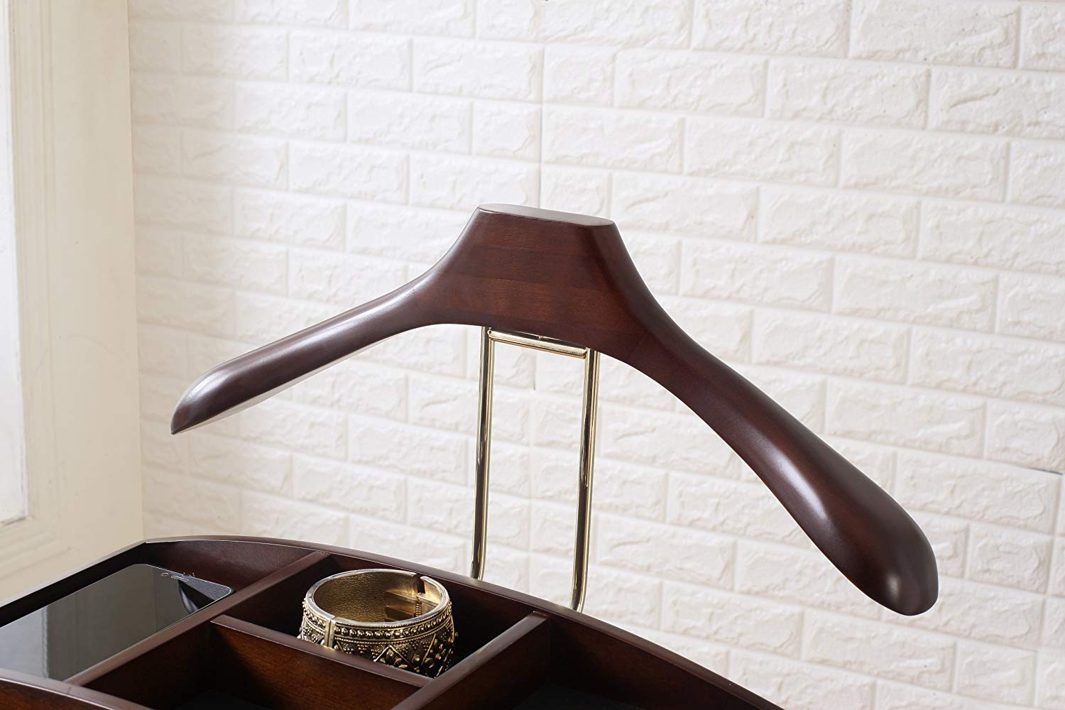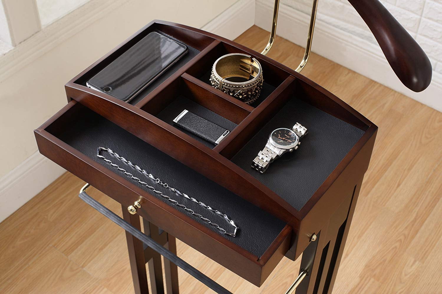 Beautiful contour hanger, hand shaped and hand polish Divided top tray with felt lining. Center drawer for additional storage with bronze hardware Dark Walnut Finish