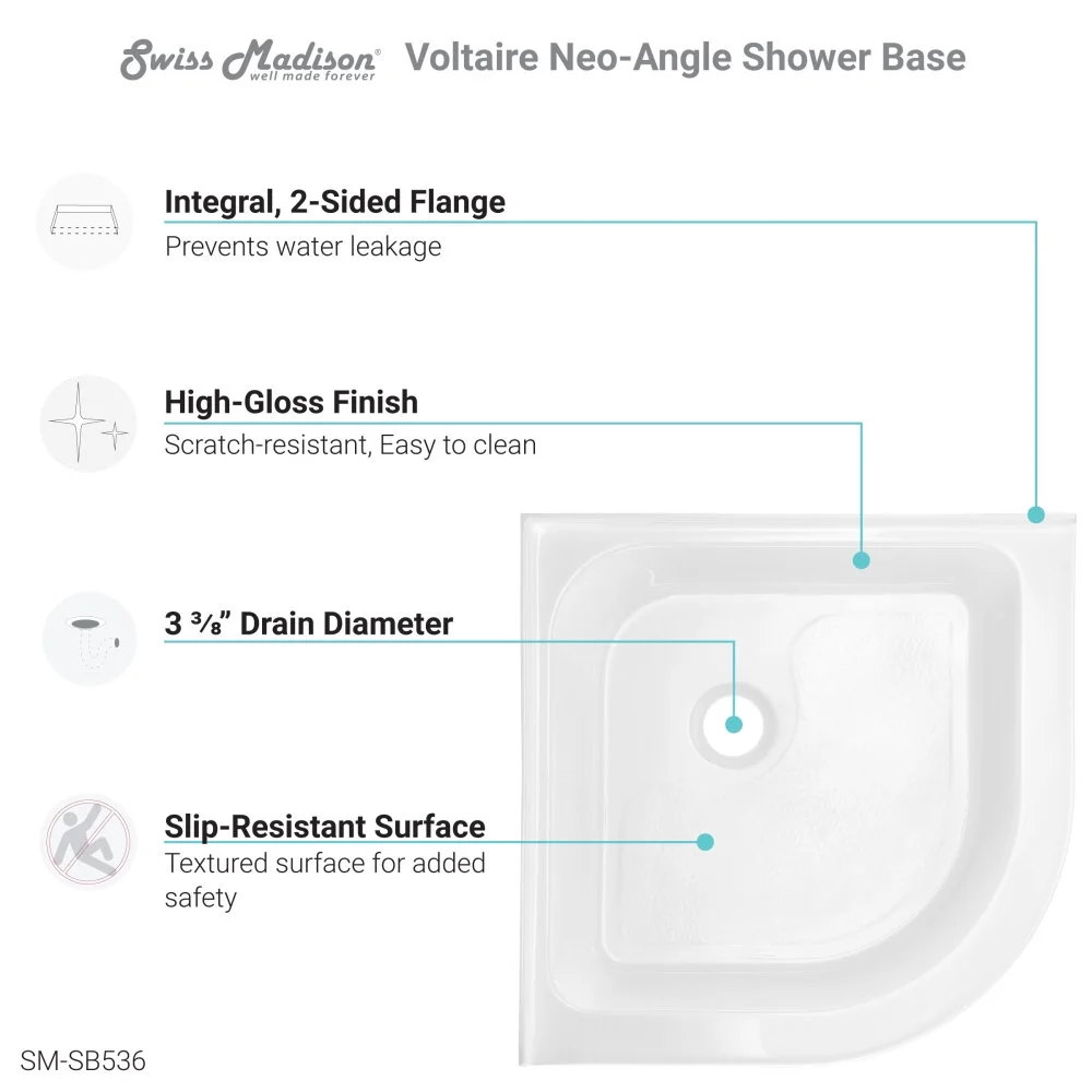 Neo-Angle: Designed to optimize smaller bathroom layouts. Fiberglass reinforced acrylic: Provides a low-maintenance option that provides ease of cleaning and durability. High-gloss finish: Shower bases featuring a high gloss finish offer a sleek appearance, ease of cleaning, and durability. Integral 2-side flange to prevent water leakage: Shower bases with a two-side flange offers superior waterproofing and structural support. Center drain: Installation for a center drain location. Sold Separately: Shower drain is not included. Collection: Part of the Voltaire Collection, explore additional products in this collection to complete the room.