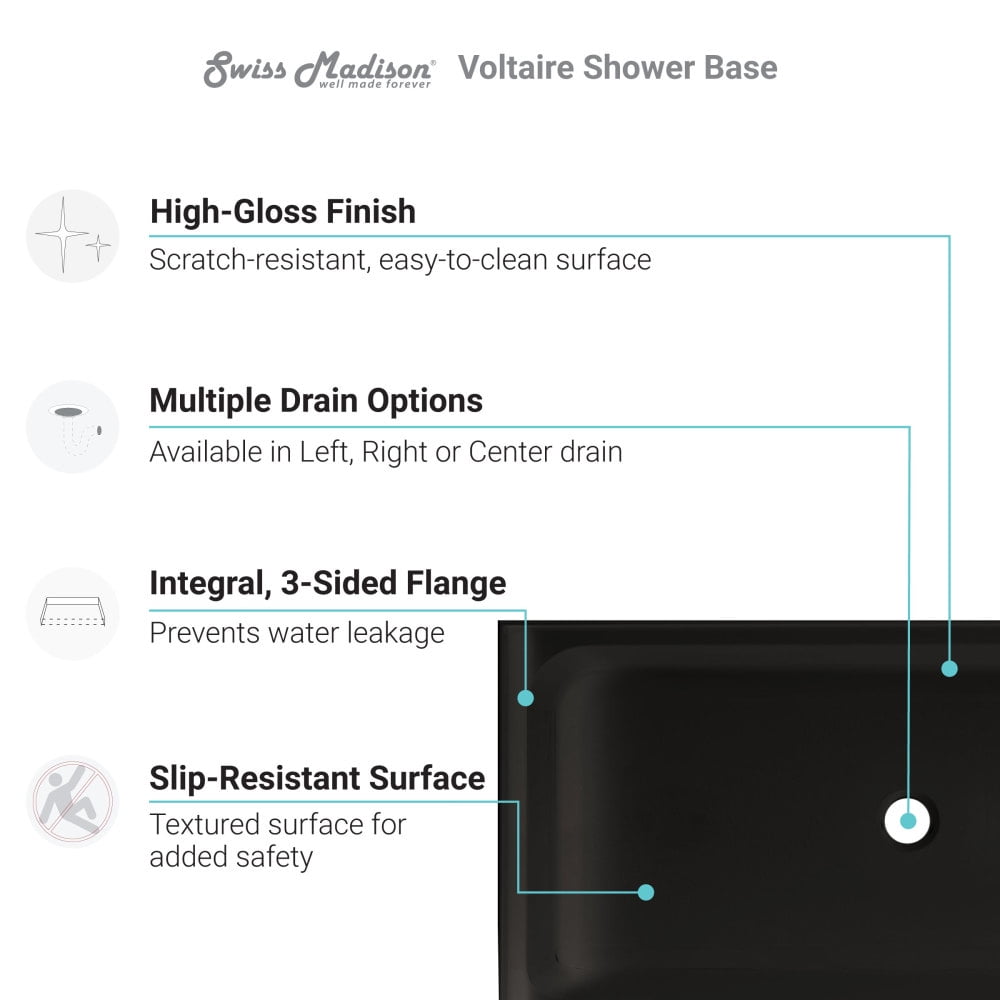 Low Single Threshold: Shower bases featuring a low single threshold offer consumers versatility, enhanced safety, and superior accessibility. Fiberglass reinforced acrylic: Provides a low-maintenance option that provides ease of cleaning and durability. High-gloss finish: Shower bases featuring a high gloss finish offer a sleek appearance, ease of cleaning, and durability. Integral 3-side flange to prevent water leakage: Shower bases with a three-side flange offers superior waterproofing and structural support. Right-hand drain : Installation for a right-hand drain location. Sold Separately: Shower drain is not included. Collection: Part of the Voltaire Collection, explore additional products in this collection to complete the room.