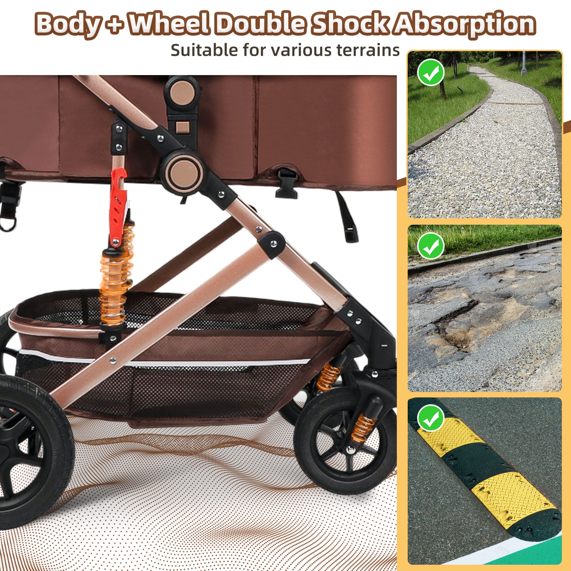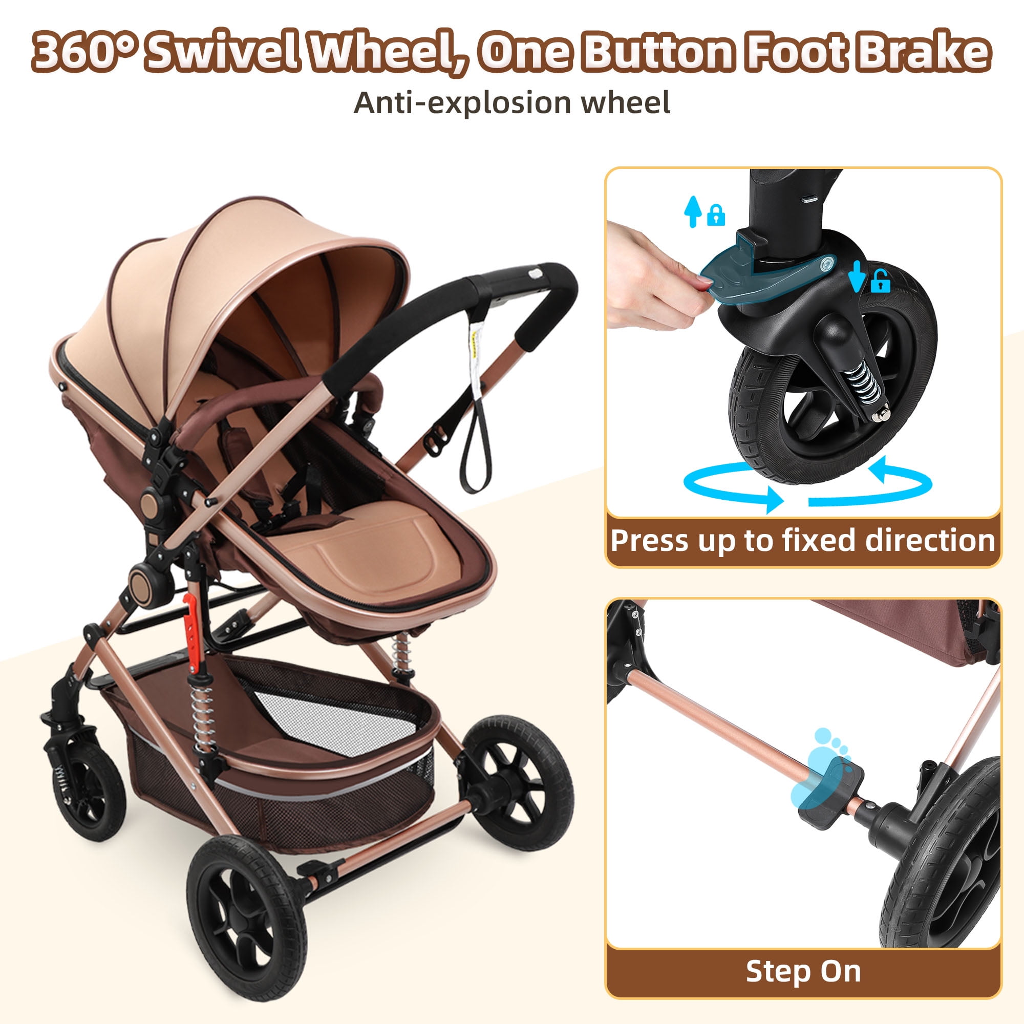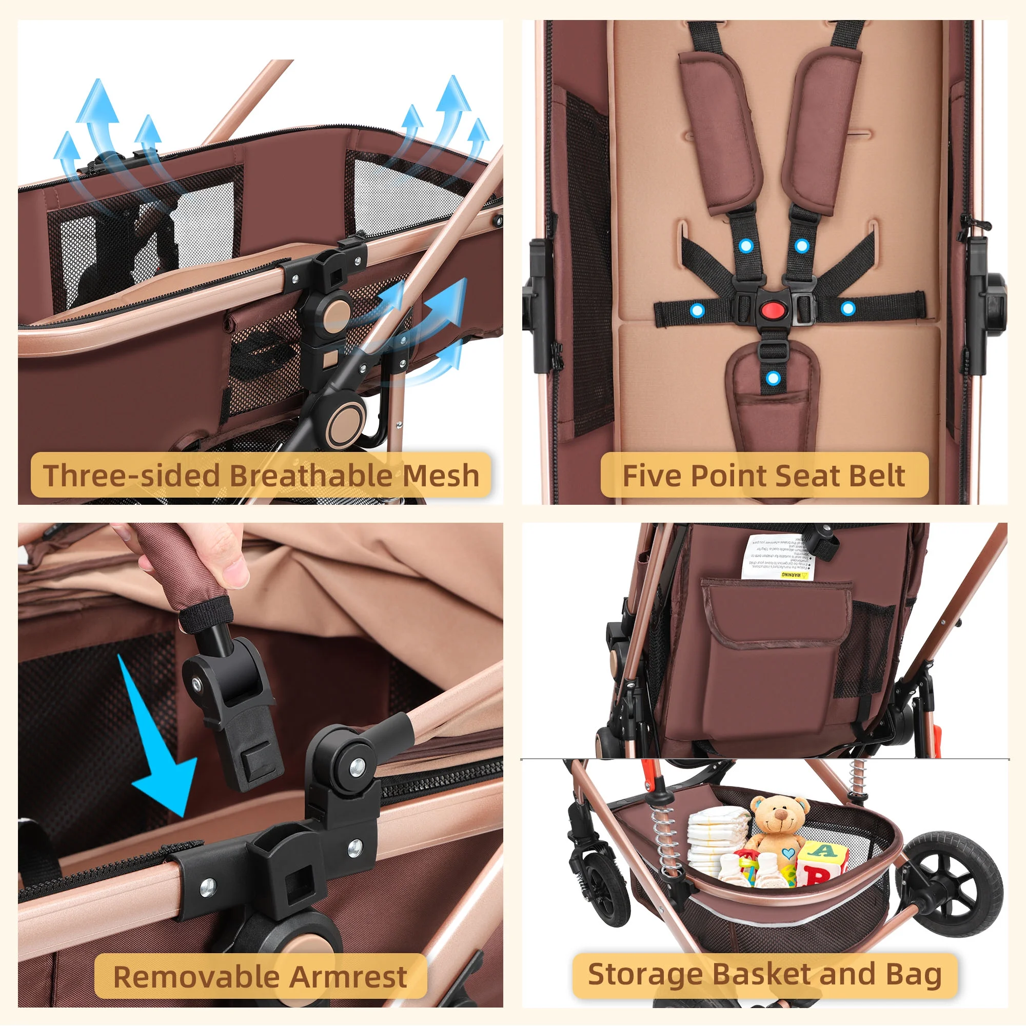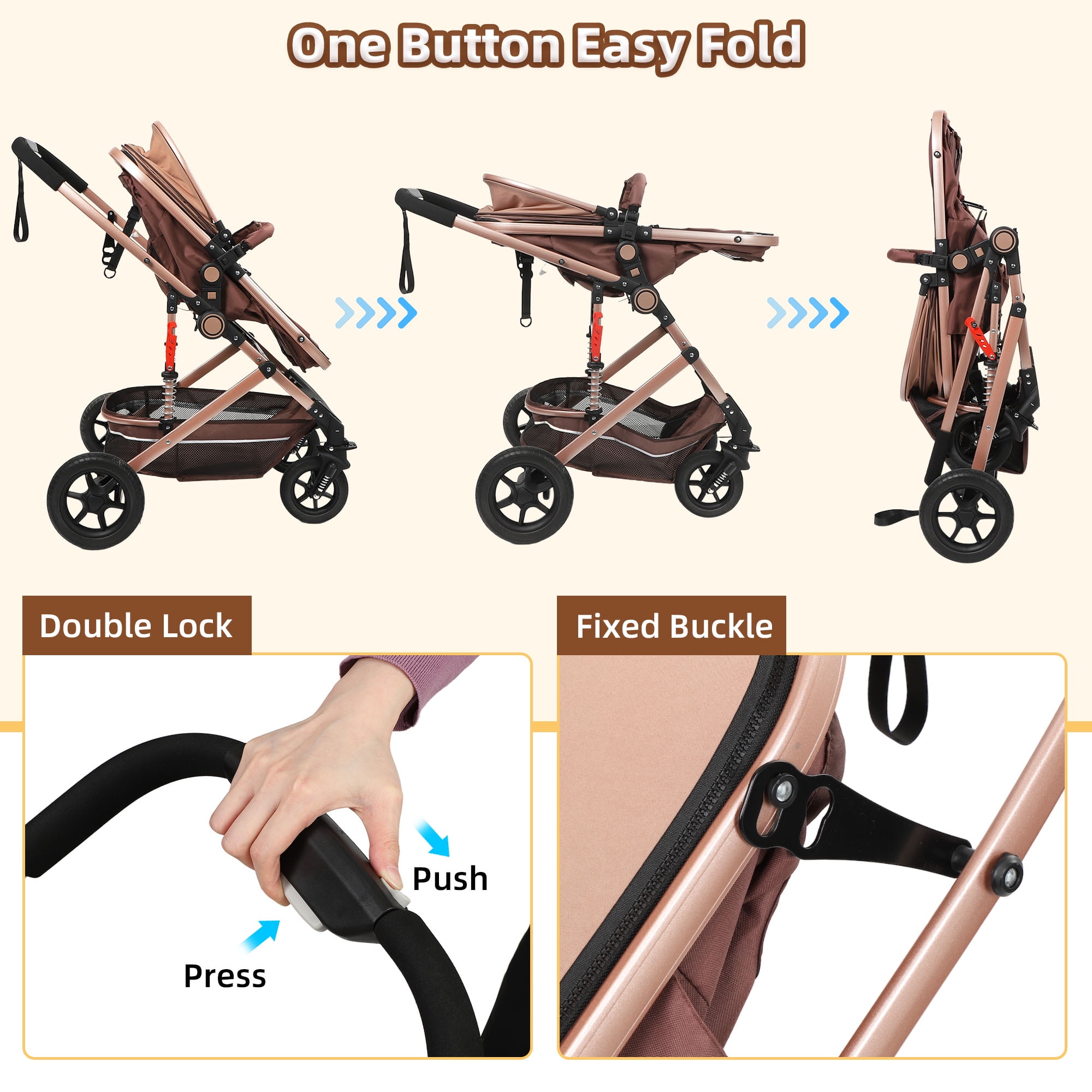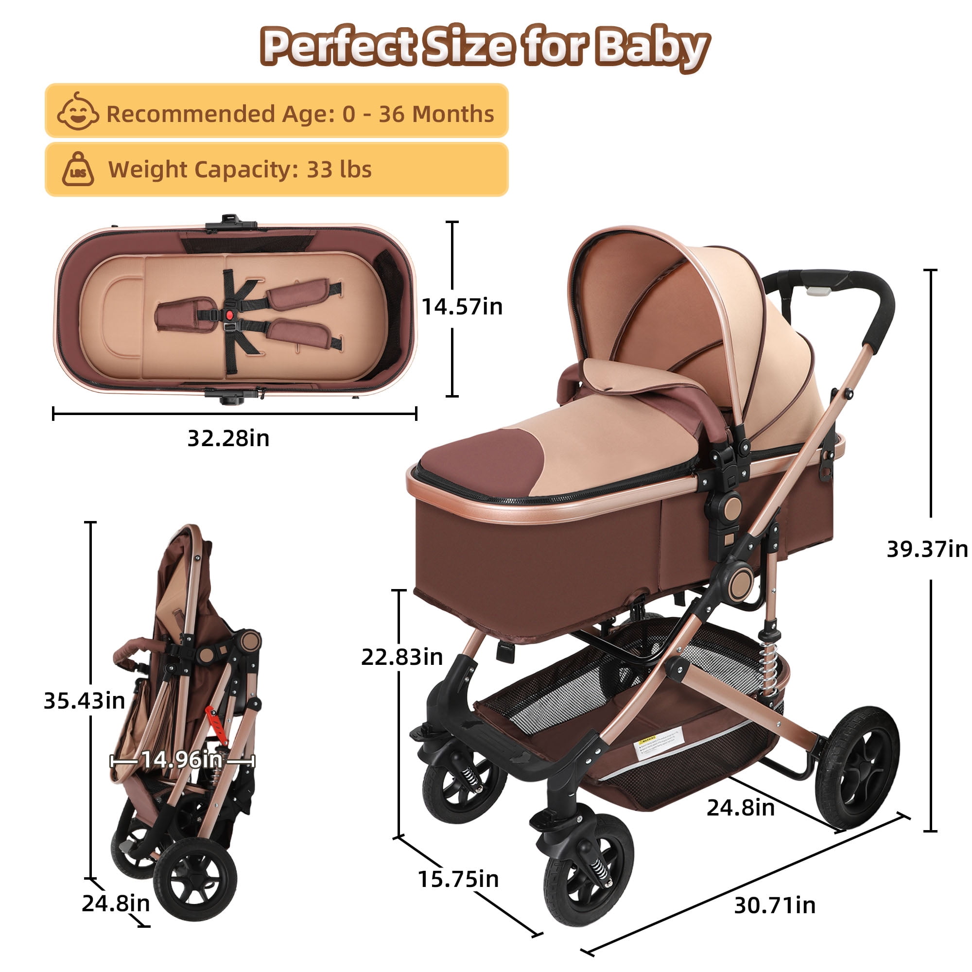 Vomeast Baby Stroller, Foldable Baby Stroller Reversible Bassinet, Travel Stroller for Newborn, Khaki & Brown