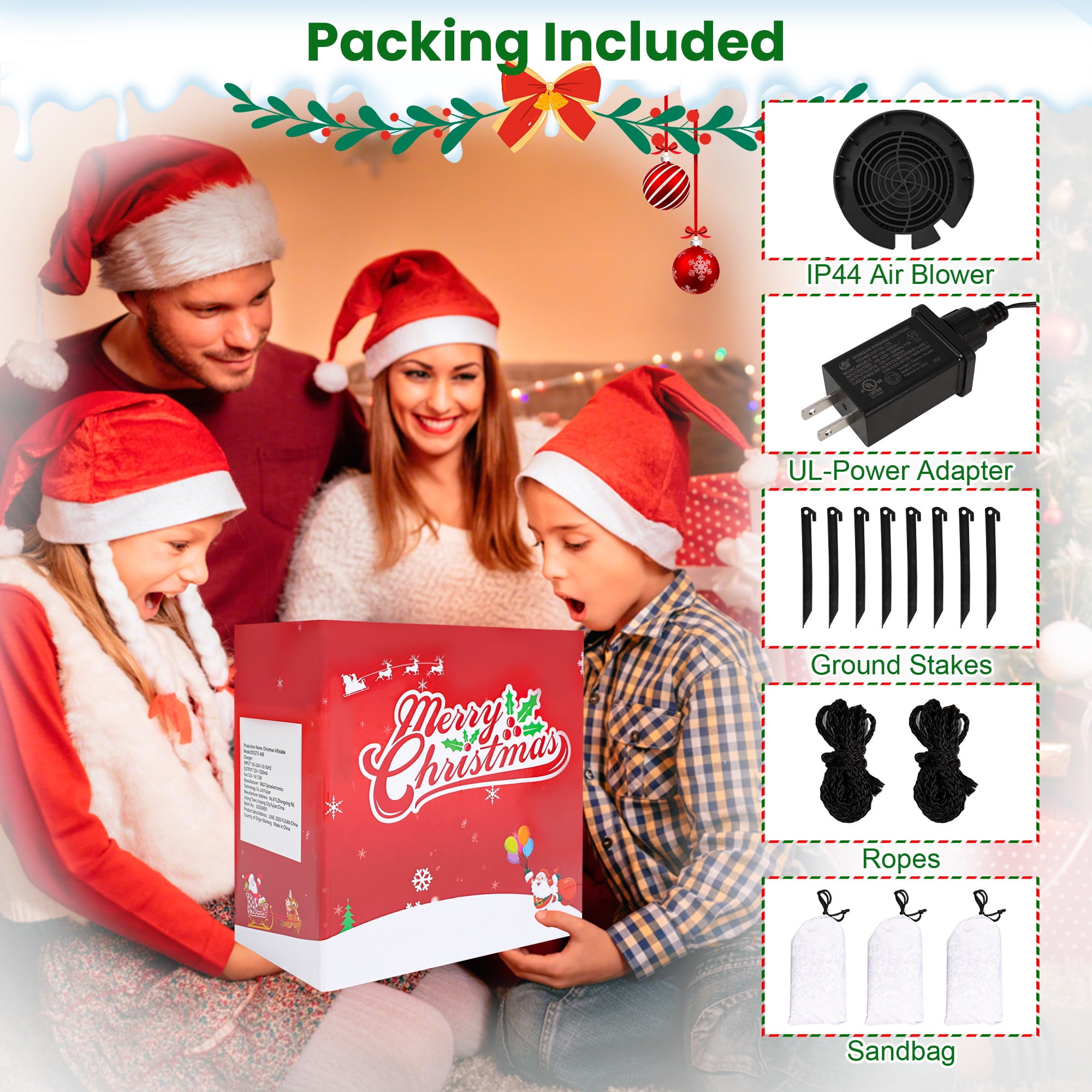 Unique Christmas Decoration: Unique and cute eye-catching design and perfect size, loved by children. Perfect for your patio, garden, party and indoor. LED Lights: With bright and energy-saving LED lights, create a brilliant light effect to attract the attention of neighbors and friends. The long power cord makes it easy to use this inflatable decoration outdoors. Waterproof Fabric: Made from waterproof 210T polyester fabric, this one is durable enough for indoor and outdoor use. In addition, built-in sandbags (load sand yourself), ropes, and wooden stakes for stability, and can withstand all kinds of wind and snow weather. Quick Inflation: Built-in high-speed fan, it can be easily inflated. You just plug it in and it quickly inflates to become an eye-catching addition indoors or out. Easy to Store: Designed with a bottom zipper, this Christmas decoration deflates easily so you can easily store it to save space in your home when the holidays are over. Note: 1. Tighten the bottom zipper when inflating to prevent air leakage. 2. Avoid putting other objects into the blower or decorations, otherwise damage may occur. 3. When deflating, open the zipper to deflate quickly and easily.