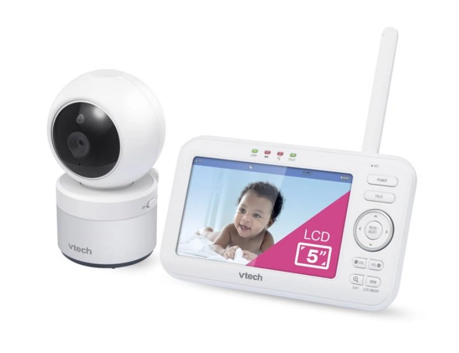VTech 5″ Digital Video Baby Monitor with Pan and Tilt and Night Light, VM5263. Check in on your little one with a large, 5-inch LCD screen on the VTech VM5263 Digital Video Pan Scan Baby Monitor with Night Light. This video monitor lets you pan and tilt to get a better look at every angle in the nursery using the long-range parent unit. Soothe your baby using the adaptive multi-color night light that adjusts to the lighting of the nursery and lullabies and soft sounds that play right from the baby unit. Plus, you can make sure your infant is cozy by monitoring the nursery temperature that’s displayed right on the 5″ LCD screen. Best of all, you can check in during nap time or after dark, thanks to automatic infrared night vision.