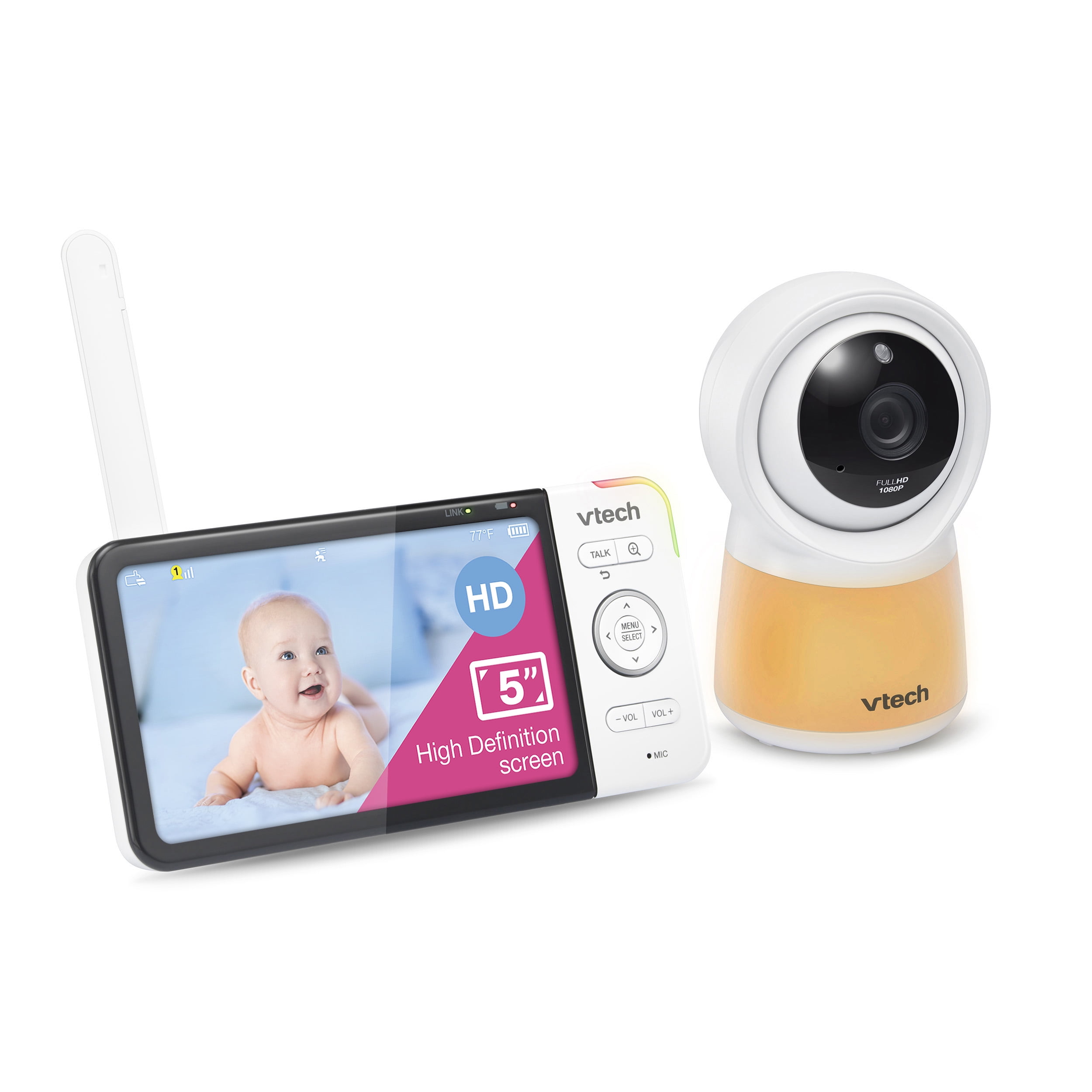VTech Smart Wi-Fi Video Baby Monitor with 5” High Definition Display and 1080p HD Camera, Built-in night light, RM5854HD (White) allows you to check in on your little one from virtually anywhere—at home or remotely on your smart device. Watch your child in real time on the 5” parent unit in High Definition, or on the MyVTech Baby app. When viewing on your iOS or Android device, experience crystal-clear, high-definition video. A built-in night light, soothing sounds and lullabies that play right from the camera unit to help baby sleep tight. This fixed baby camera has a wide-angle viewing up to 110 degrees to watch over your little one from anywhere in the house or out in the yard. The built-in temperature sensor will let you know with an alert if the nursery is getting too hot or too cold so you can adjust the thermostat.1080p high-definition video, so you can clearly see your little one the parent unit, your smartphone or tablet. • Free live remote access via smartphone and tablet to remotely listen, talk-back and view on multiple devices, even outside the home. • High-definition, 5-inch color LCD screen to clearly see every single move right from the parent unit. • Night light on baby unit – A soothing light on the baby unit gently illuminates a dark nursery. Choose from three different colors. Enable the Auto-on feature to turn the night light on when noise is detected to help soothe your baby back to sleep. • On-board recording set for motion detection or on demand for special momemnts. • Wide-angle viewing up to 110 degrees • Soothing sounds and lullabies – Five calming melodies and four soft ambient sounds, including a trickling stream and white noise, help your baby slip into a sweet slumber.