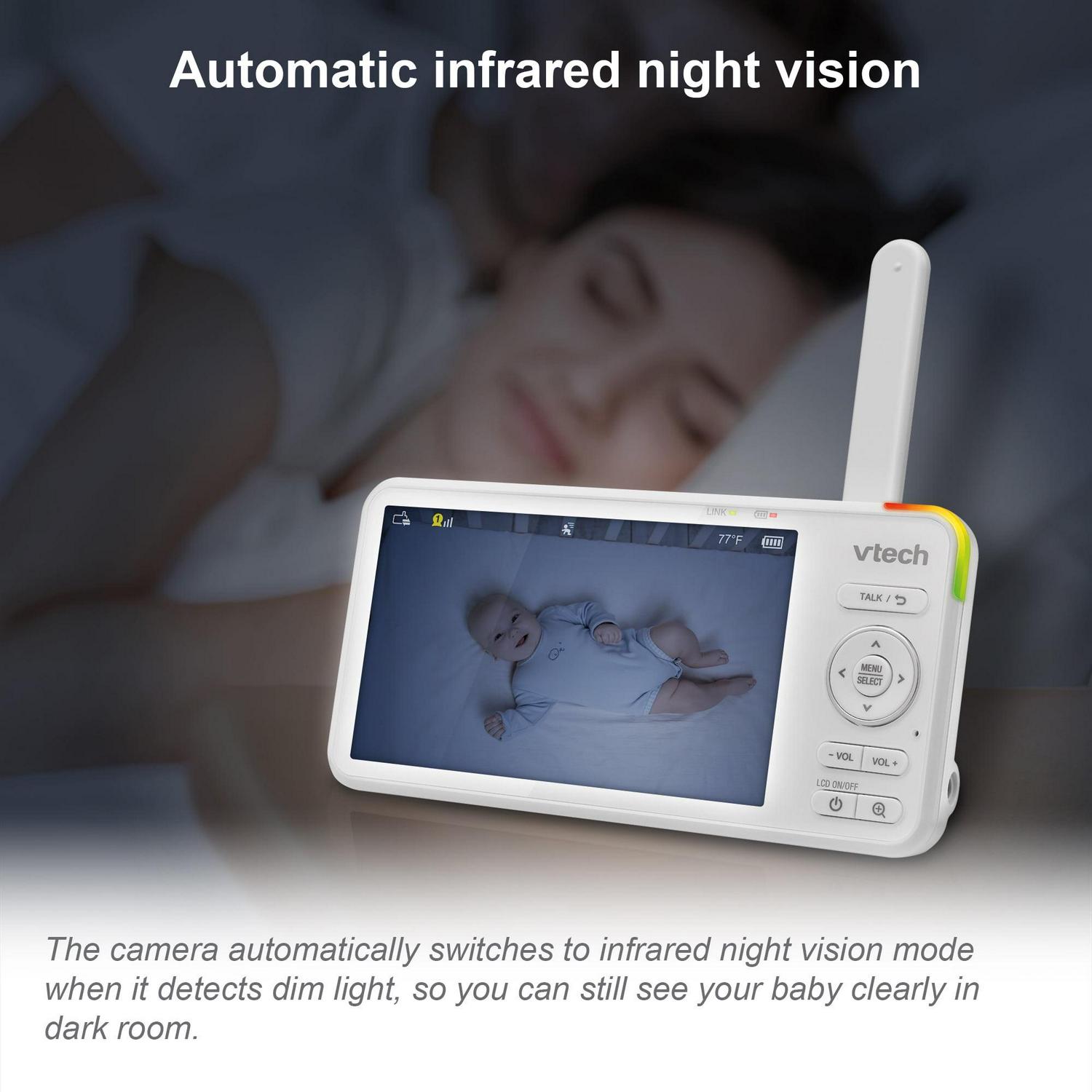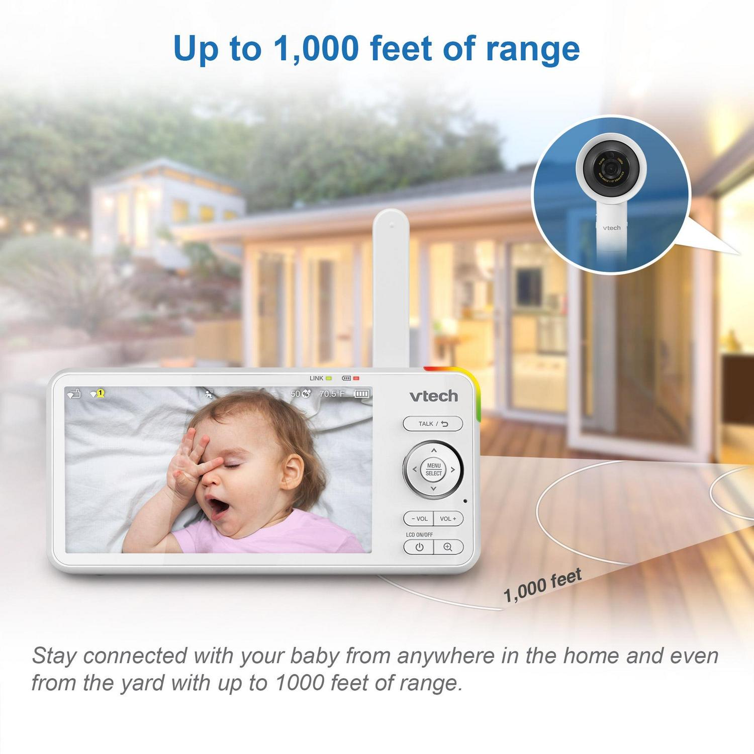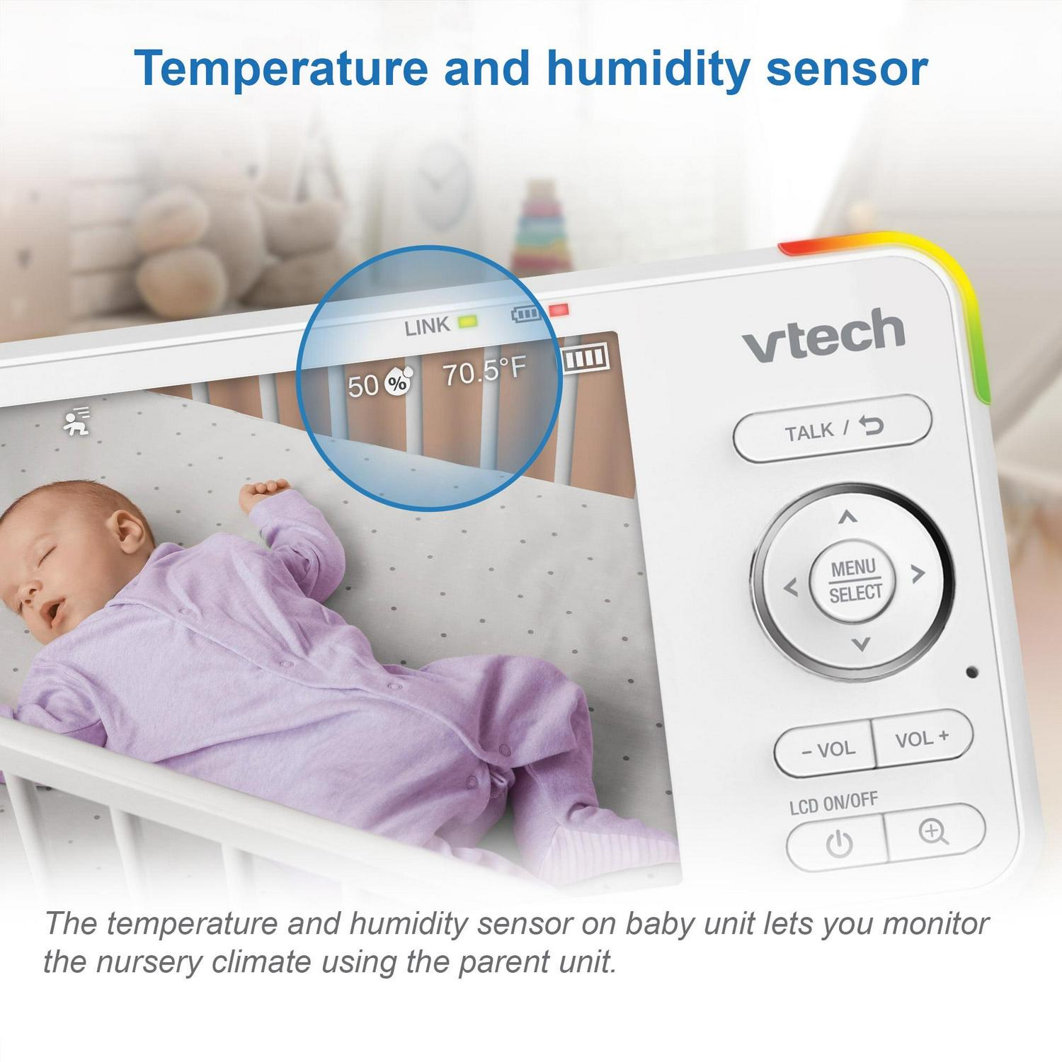 Watch your child in real time on the 5″ parent unit in High Definition, or on the MyVTech Baby 1080p app. When viewing on your iOS or Android device, experience crystal-clear, high-definition video. A built-in night light, soothing sounds and lullabies that play right from the camera unit to help baby sleep tight. This over-the-crib baby camera has a wide-angle viewing up to 110 degrees to watch over your little one from anywhere in the house or out in the yard. The built-in temperature sensor will let you know with an alert if the nursery is getting too hot or too cold so you can adjust the thermostat.