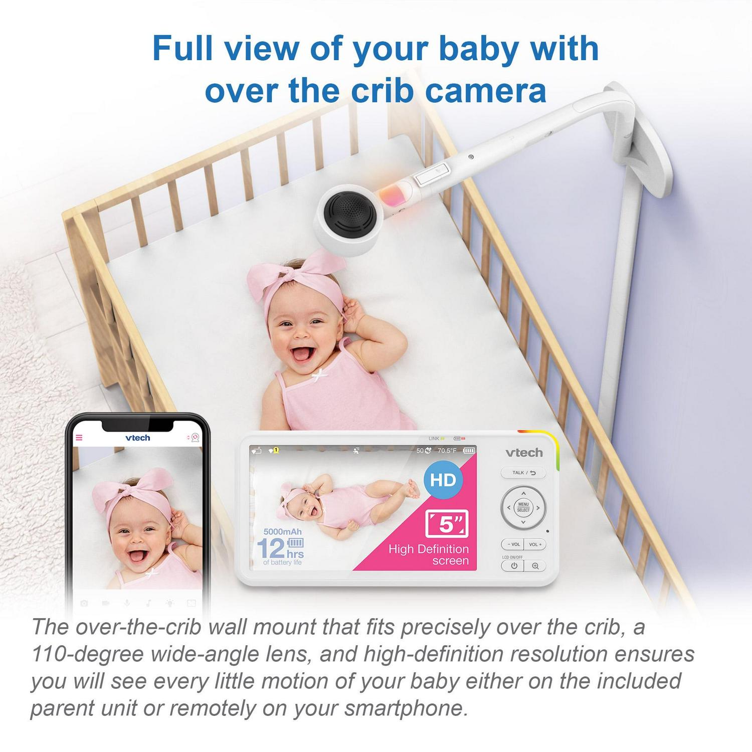 – Over-the-crib view – Clearly see every single move right from the 5 inch parent unit in high definition. When you check in on your baby, you ll feel like you ve never left the room.