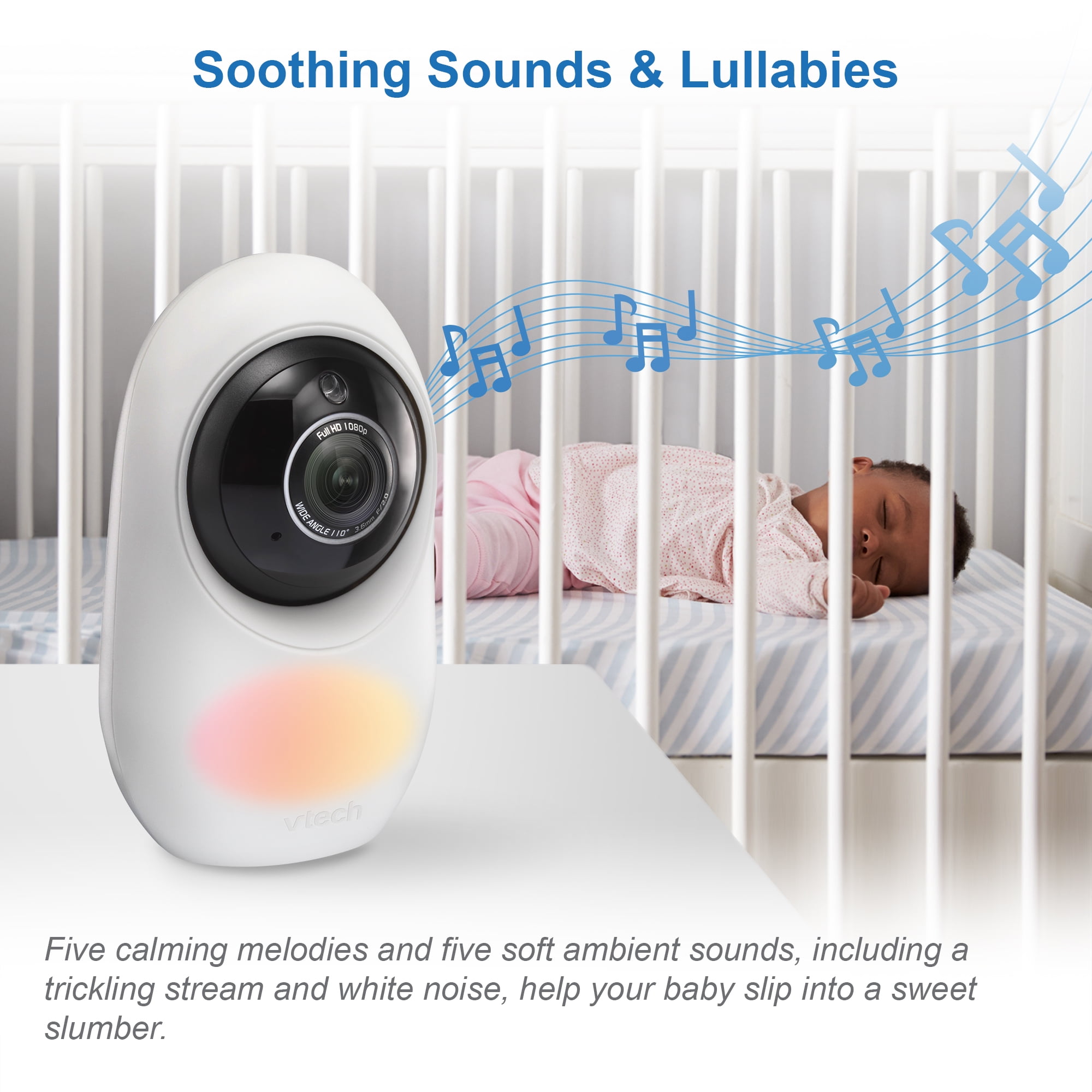1080p high definition video, so you can clearly see your little one on your smartphone or tablet Free live remote access via smartphone and tablet to remotely listen, talk-back and view on multiple devices, even outside the home High-resolution, Super-slim 2.8 inch color LCD screen – Clearly see every little move right from the high resolution 2.8″ parent unit. When you check in on your baby, you’ll feel like you’ve never left the room. Adaptive night light – the 7 color night light automatically adjusts brightness for ideal lighting Soothing sounds and lullabies – Five calming melodies and four soft ambient sounds, including a trickling stream and white noise, help your baby slip into a sweet slumber Local and Remote Two-way, talk-back intercom – Sometimes all your baby needs is to hear the sound of your voice. Comfort your infant from any room with the built-in intercom on the portable parent unit or from your smartphone using the MyBabyPro app.