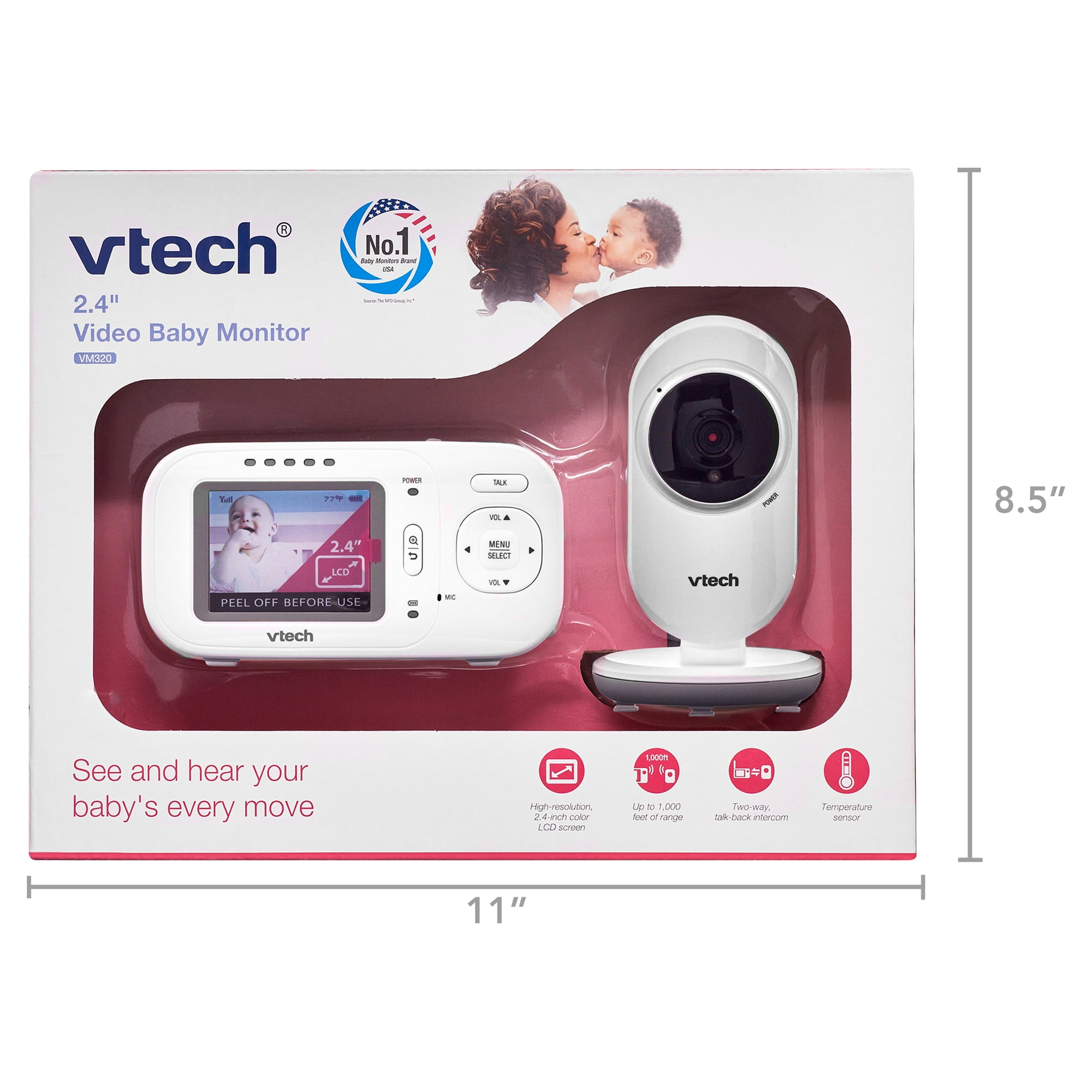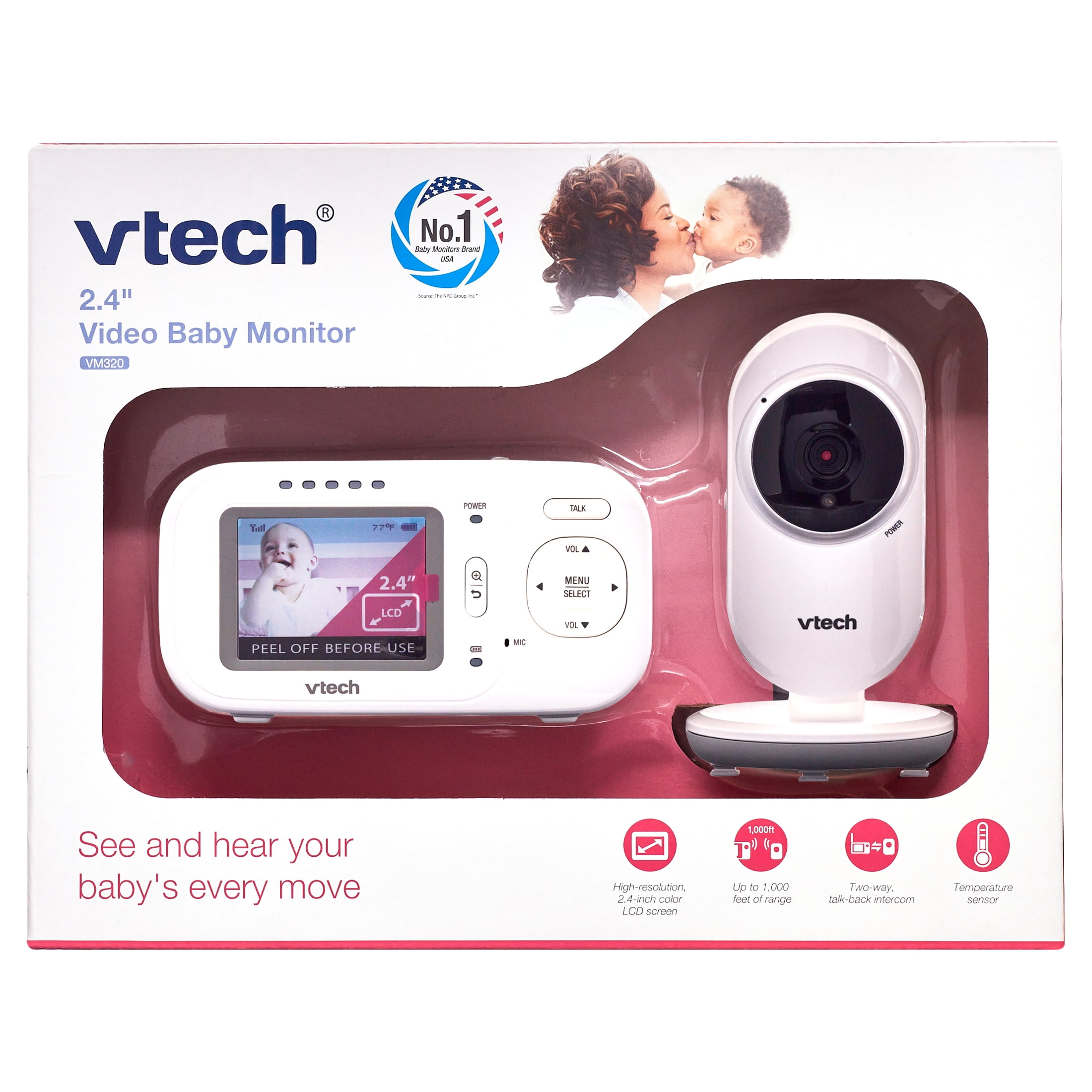 The VTech VM320 2.4″ Video Baby Monitor makes it easy to keep an eye and ear on your little one from anywhere in the house. The high-resolution, 2.4-inch color LCD screen on this monitor ensures you can see every giggle and smile with full-motion video. Plus, up to 800 feet of range means you can check in from almost anywhere in the house. Extra features like the temperature sensor on the VTech VM320 2.4″ Video Baby monitor keep the baby cozy. A two-way, talk-back intercom lets you soothe your child without entering the room. Automatic infrared night vision gives you a clear view of the nursery even with the lights out, so you can check in without disturbing your little one.