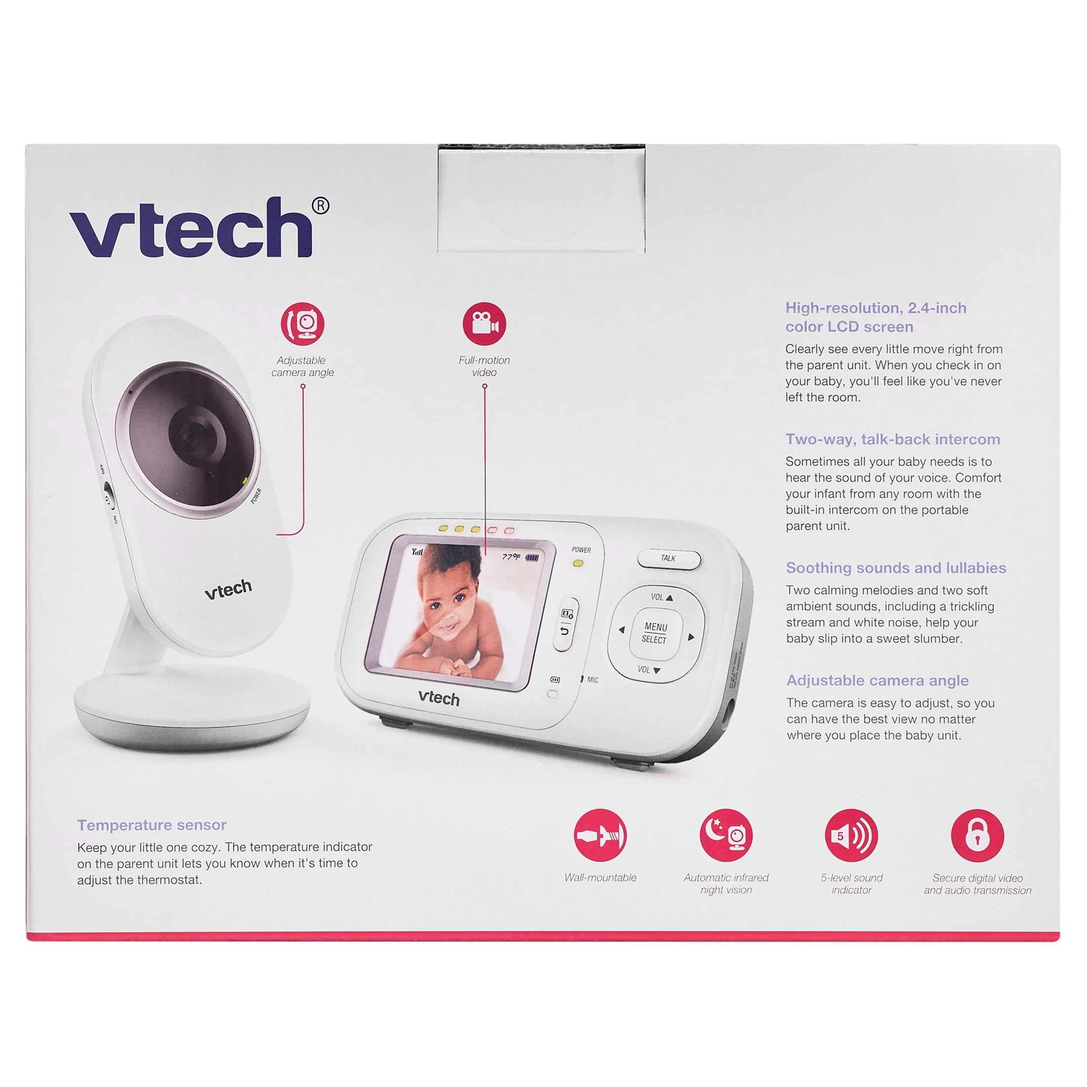 Two-way, talk-back intercom Temperature sensor 5-level sound indicator Secure video and audio transmission 2X zoom Wall-mountable Volume control Rechargeable battery with low-battery alert on the parent unit