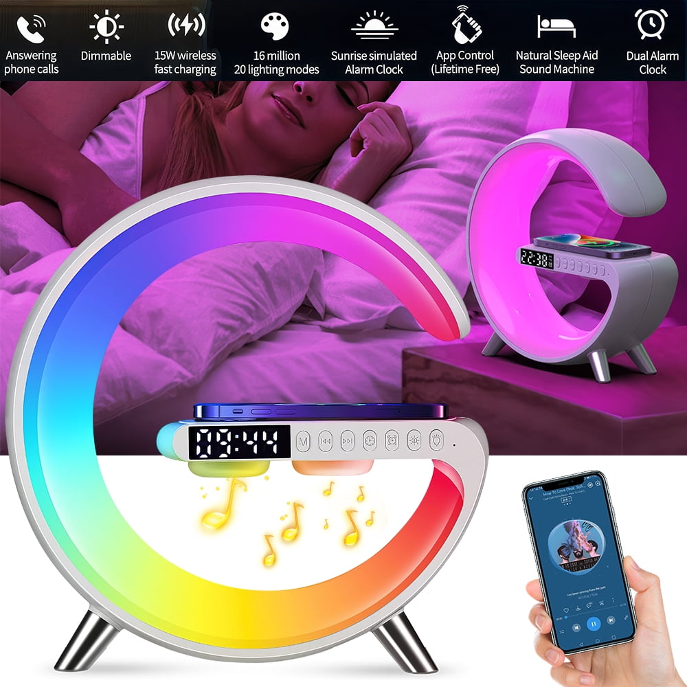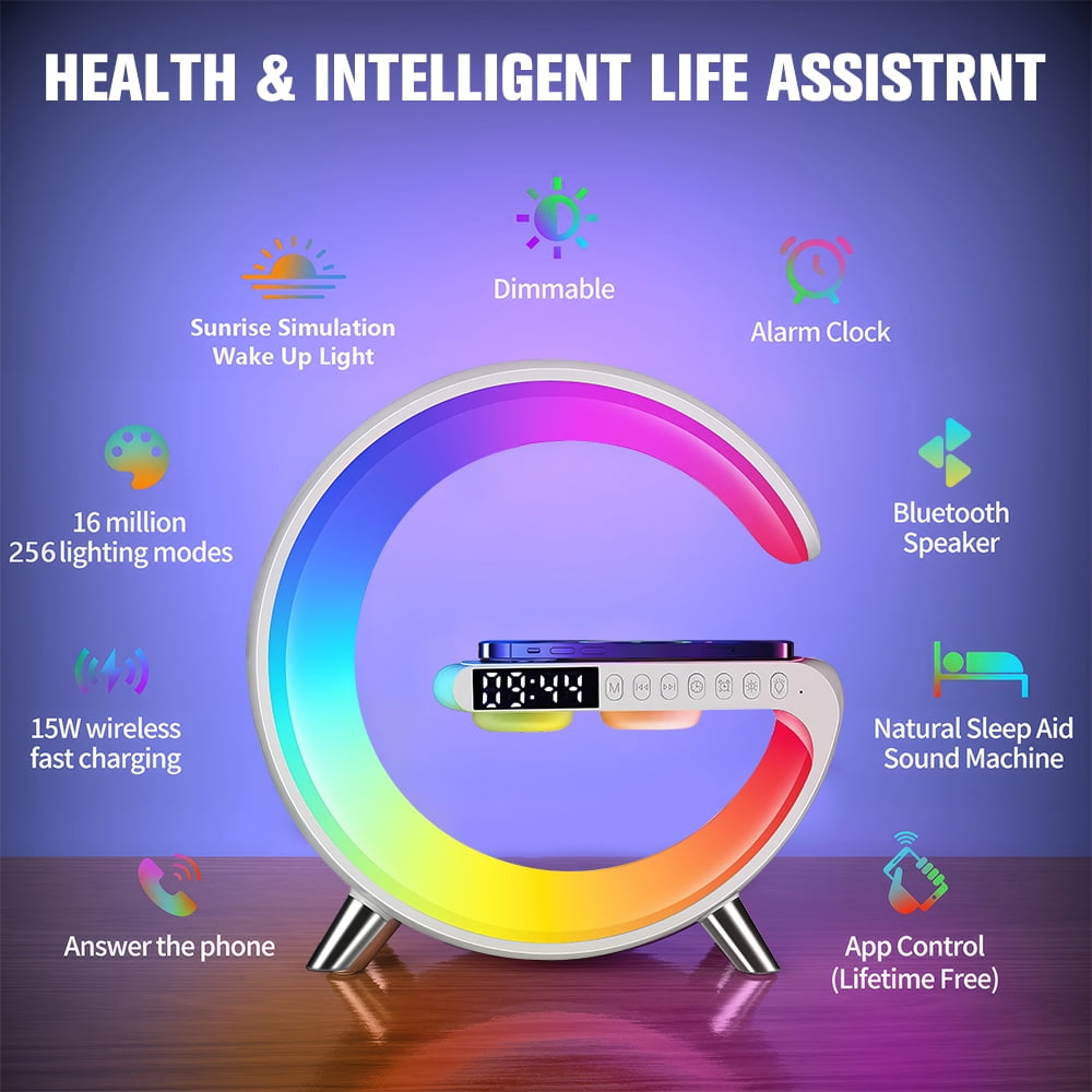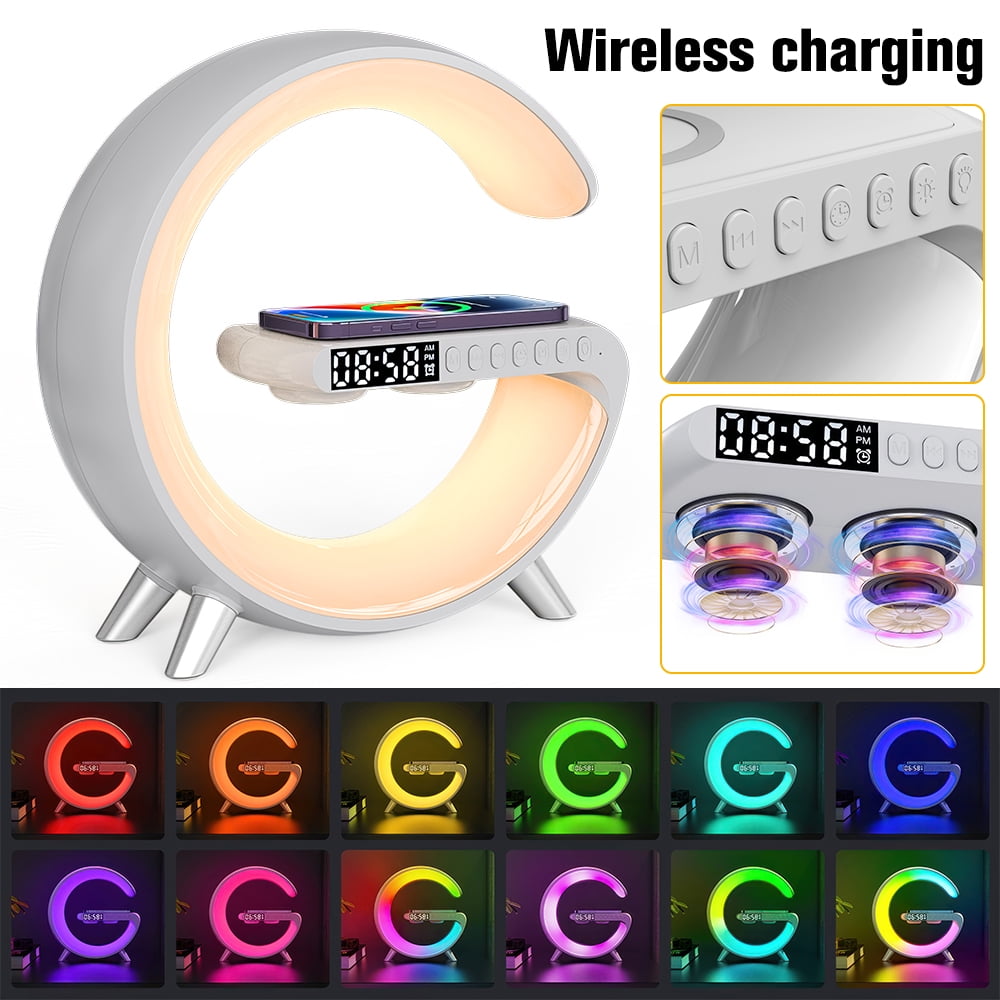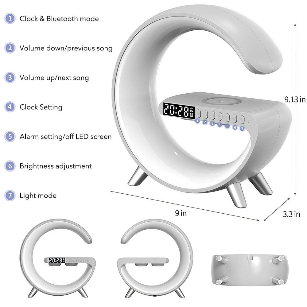 Features: 1.Multifunctional Wireless Charging Atmosphere Light: The lamp is not only an atmosphere light, but also has 15W fast wireless charging, Bluetooth speaker, music, sleep light, atmosphere light, bedside light, glare effect, Bluetooth audio, clock, alarm clock and other functions . You can use this great light while working, studying, reading and sleeping. 2.Comfortable Wake-up Mode: You can customize sound, volume, light color and brightness through APP, personalize healthy sleep and wake-up routine. The snooze alarm clock sounds gentle and peaceful, helping your body wake up gradually. 3.Smart Light Control: The smart table lamp supports APP control, voice control, remote control and button control. Dimmable (1-100% brightness), easily adjust the light color to suit different moods. It can also be used to turn on/off the light bar and set timing functions. 4.Dimmable Mood Light: Click the bulb button to switch between 10 light color modes. Other 256 modes and 16 million light colors can be adjusted through APP. The brightness of the light can be adjusted continuously, and the light will gradually brighten or dim. Meet your lighting needs in any scene. 5.Clock With Fast Charging Station: This wireless charging alarm clock is also a 15W wireless fast charger. It can charge any electronic device that supports wireless charging. It has multiple protections such as overcurrent, overvoltage, overtemperature, and short circuit, making charging safe. 6.Perfect Decoration and Gift: The mood light can help you create any mood you want, perfect for bed, bedroom, living room, home, office decoration, it is an ideal gift for birthday, Christmas, New Year, Thanksgiving and more. Specification: Material: ABS+PC Input Voltage: 12V/2.5A Wireless Power: 5W-7.5W-10W-15W LED output: 10W Bluetooth Audio Power: 3W Lighting modes: 256 kinds Transmission Distance: 2-6mm Charging efficiency: 75% Button battery capacity: 40mAh Net weight: 466g Product size: 228*82*230mm NOTE: 1.Please use QC3.0 power adapter (charger),Otherwise the LED light will not ON. 2.It works for ALL Phones that support wireless charging !!! 3.For fast charging experience and Use all function at the same time, please use QC 3.0 power adapter Package Included: 1*wireless charging 1*Charging cable 1*User Manual