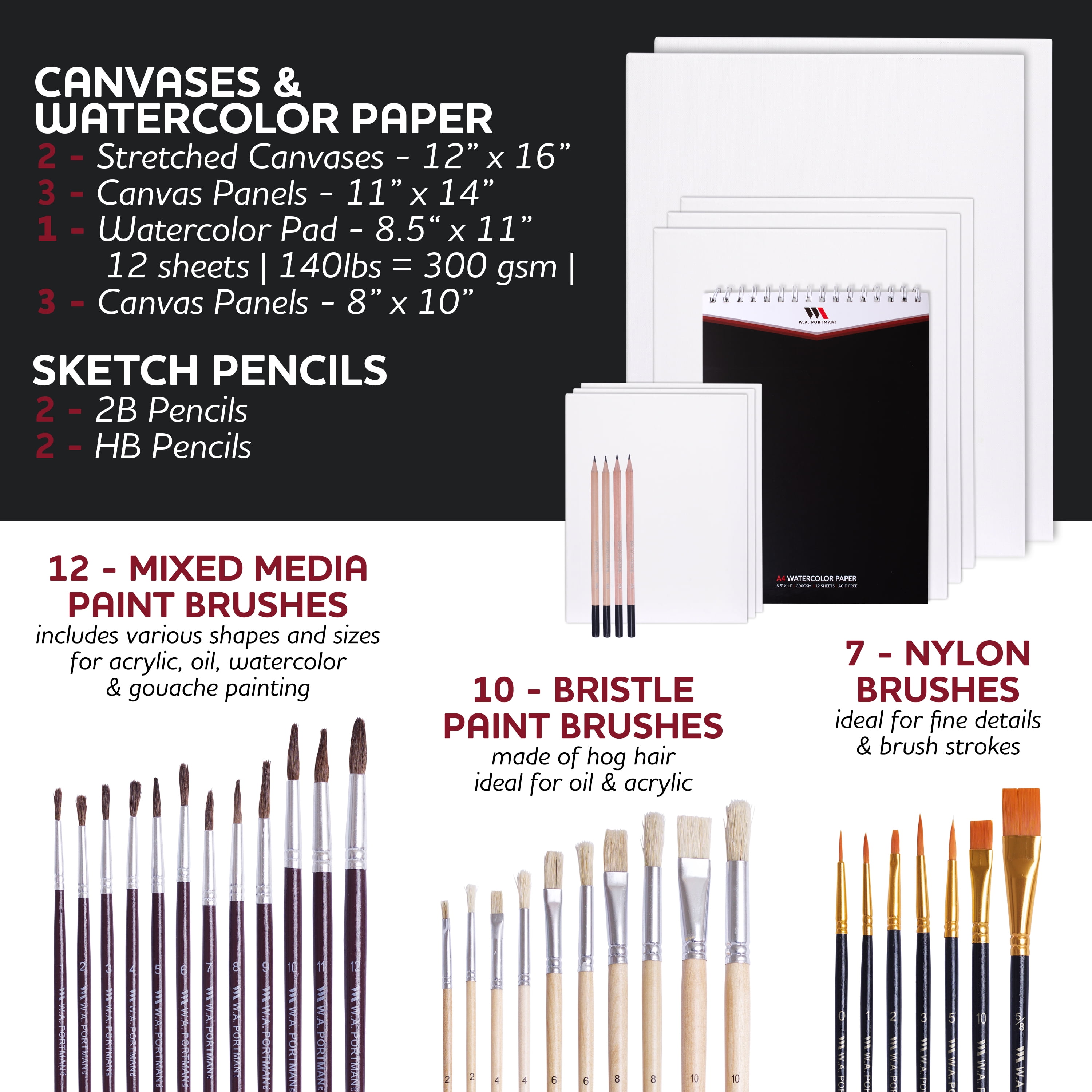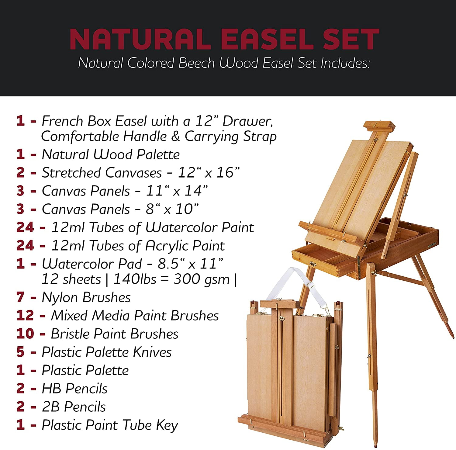 French easel set with 12″ drawer, comfortable handle, and carrying strap 24 12ml tubes each of watercolor & acrylic artist paint 7-piece nylon brush set, 10-piece boar bristle brush set, 12-piece mixed media brush set 2 12″x16″ stretched canvases, 3 11″x14″ canvas panels, 1 8.5″x11″ watercolor art paper sketch pad 2 HB & 2 2B pencils, 2 paint palettes, 5 palette knives, and a paint tube key