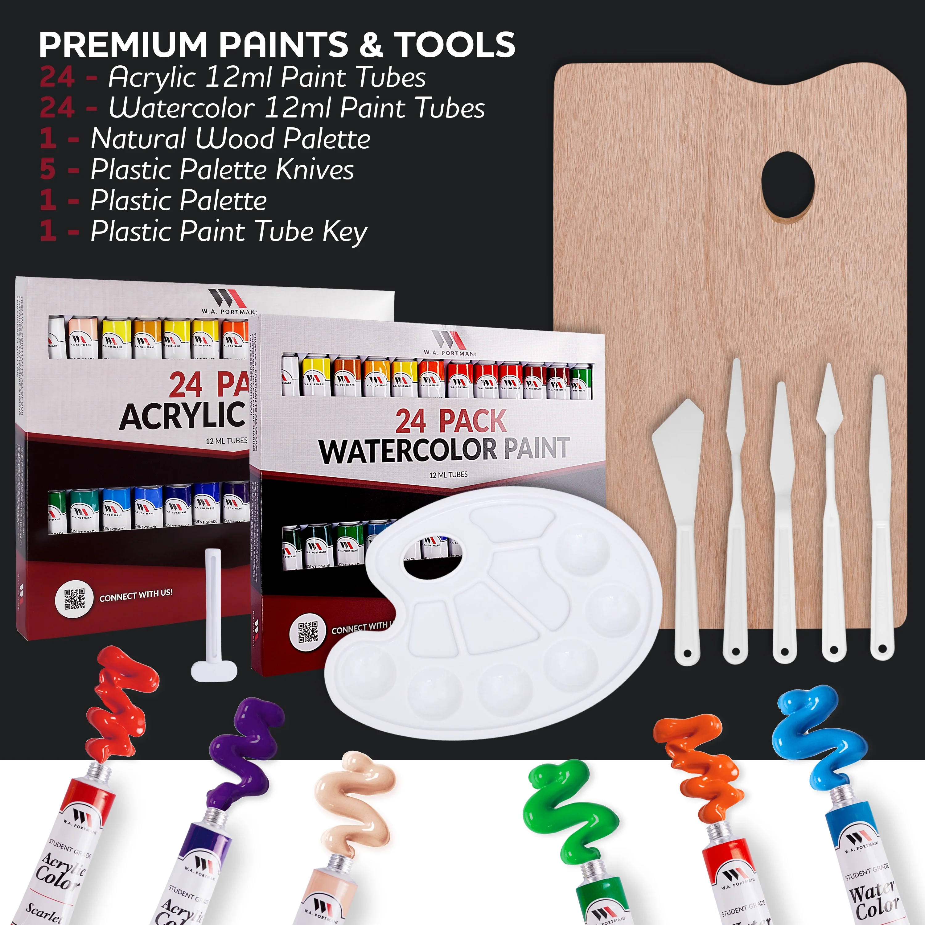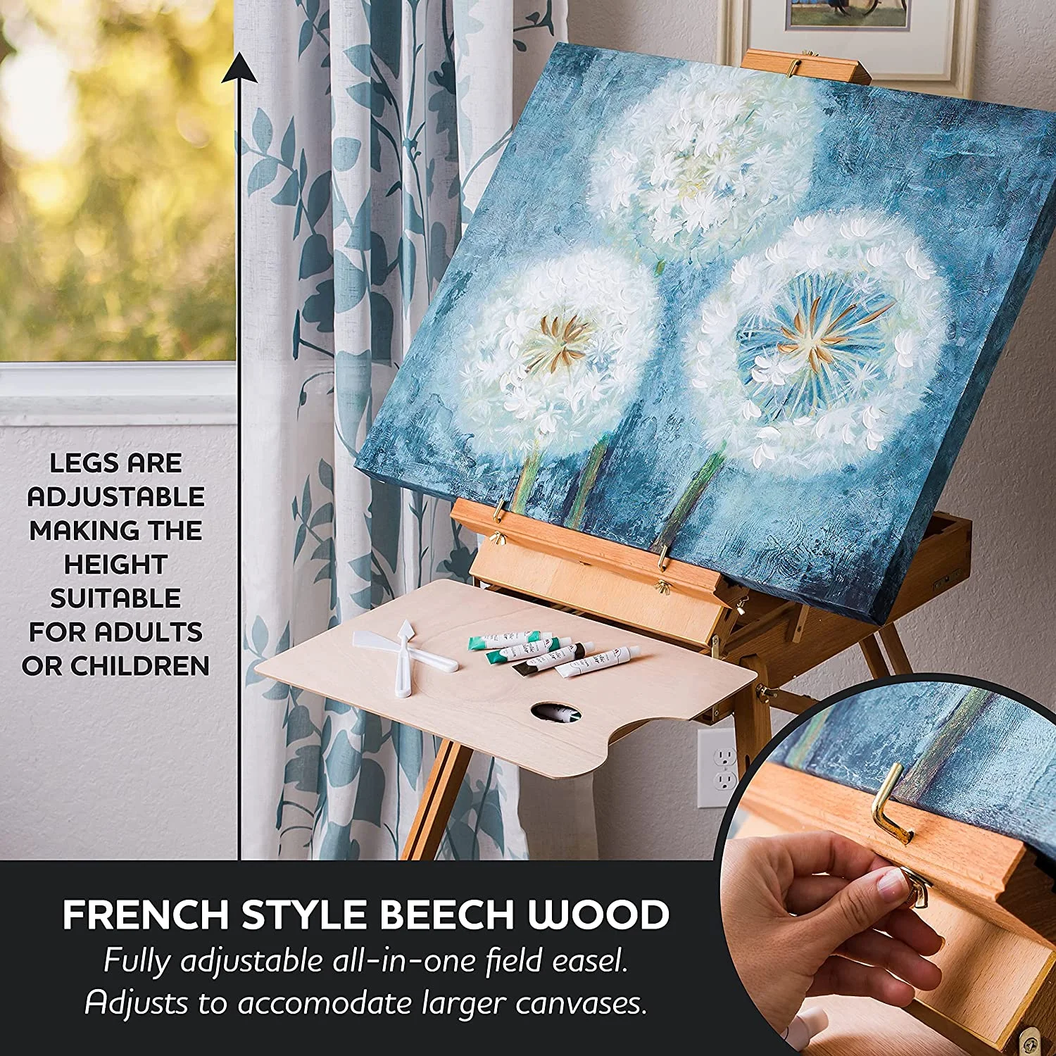 Made for artists of all ages, the W.A. Portman 99-piece Natural Easel Set contains essential painting supplies for artists and students alike. Great indoors or out, the beautiful French box painting easel holds all of the included artist’s painting supplies in its convenient drawer and has adjustable legs to suit your needs. Easily unfold the legs to allow you to stand while painting, or leave them folded to use as a tabletop easel. When done, the legs fold into the sides of this portable easel to allow you to take your art on the go. This set includes a wide variety of acrylic painting supplies such as a 24-pack of acrylic paint tubes, 2 12″x16″ stretched canvases, 3 11″x14″ canvas panels and brushes for acrylic painting. Watercolor supplies include a 24-pack of watercolor paint tubes, an 8.5″x11″ watercolor paper pad and brushes for watercolor painting. Use the 5 palette knives to mix and apply paint to your chosen surface, and the 4 drawing pencils to sketch out the details of your painting before you get started. Slide the paint tube key over your paint tube and roll up to get every last drop of paint out.
