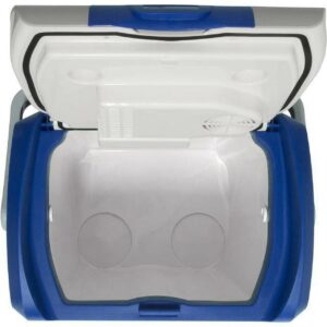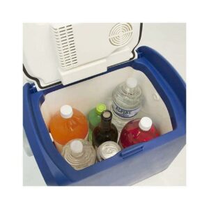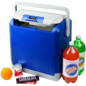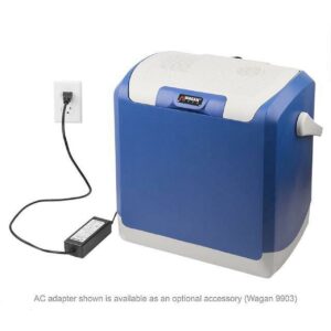 Wagan EL6224 24L 12v cooler/warmer is an essential item for anyone who gets hungry or thirsty as they drive in their vehicle; perfect for family road trips or anyone who drives frequently. Keep food and beverages cool to a maximum of 32 degrees F – 36 degrees F below room temperature (without messy ice), plus there is an option to keep them warm up to a maximum of 140 degrees F instead. Its 24L capacity holds up to 27 soda cans or four 2L water bottles. Interior dimensions: 10.5 x 8.5 x 12 ; exterior dimensions: 16.7 x 16.7 x 10.5 . Operates on 12v DC power in your vehicle; its 7.5 ft DC power cord extends for back seat use. An optional AC adapter accessory is available, Wagan item 9903, for additional use in the home, office or hotel (sold separately). Save money (and eat healthier, if you prefer) by bringing your own beverages and food from home, instead of dining out at a restaurant or fast food joint when you are on the go. A carrying handle allows for easy transport.