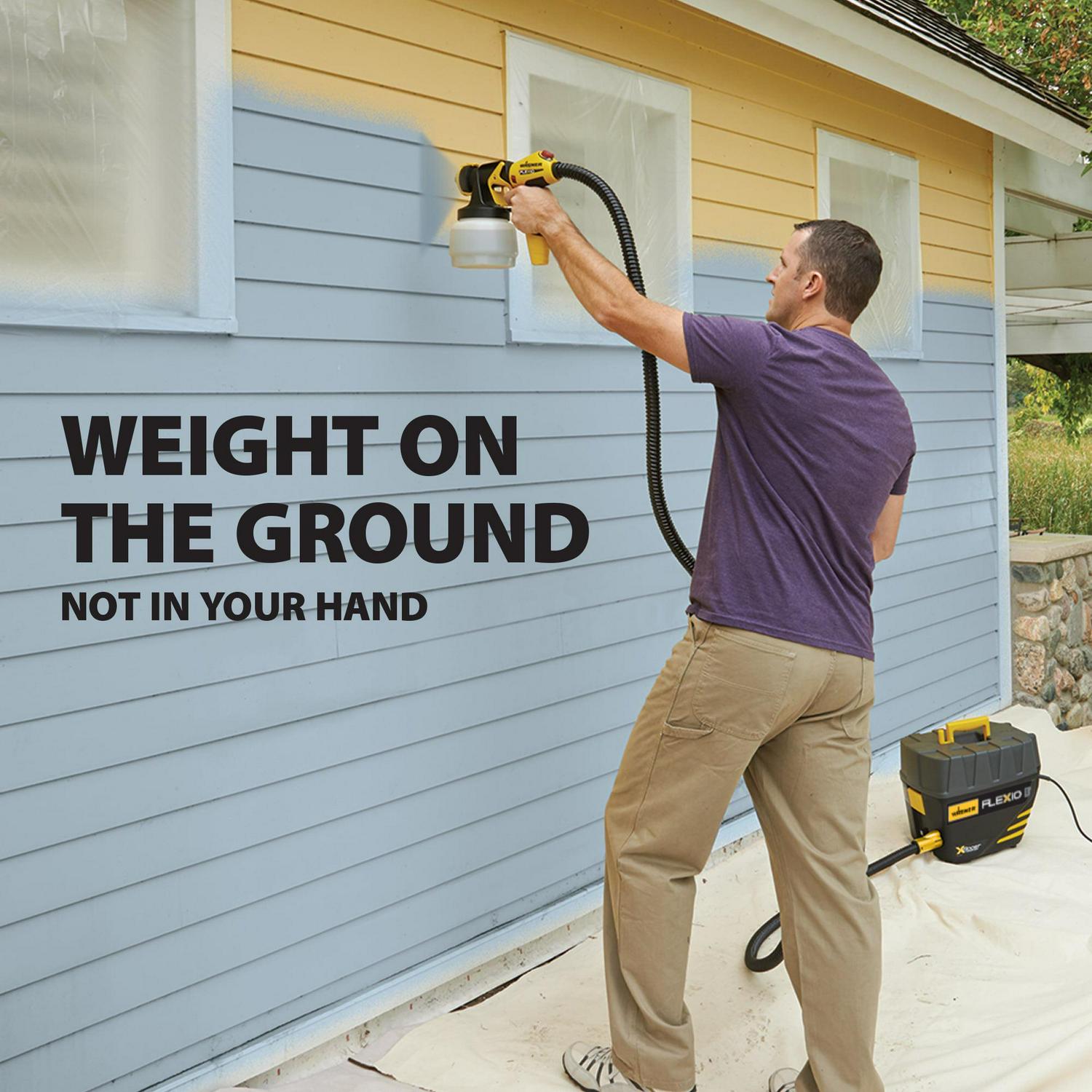 The Wagner FLEXiO 5000 paint sprayer is great for applying paint or stain on a variety of indoor and outdoor projects such as walls, ceilings, cabinets, trim, furniture and more. The sprayer includes two nozzles for added versatility. The innovative iSpray nozzle is ideal for spraying broad surfaces while the Detail Finish nozzle is ideal for fine finishing on cabinets and trim. The sprayer also features several adjustable settings to suit your project needs including an adjustable spray pattern, spray width, air power, and material flow control. The FLEXiO 5000 can also be used with a wide variety of paint and stains and even produces the power to spray unthinned materials right from the can, including paint and primer in one. The turbine base keeps the weight on the ground, not in your hand, to reduce user fatigue on big projects. The nozzles, 11.5 ft. hose and handle all fit into the X-Boost Power Box for organized storage after use.