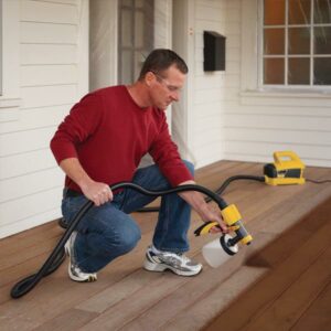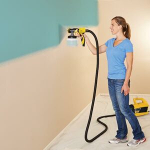The Wagner Spraytech Flexio 690 is a lightweight, portable spray system for painting and fine finishing. A combination of the X-Boost Turbine with the iSpray and detail finish nozzles provides a flexible painting solution. It offers adjustable control, full coverage and low overspray. The patented X-Boost Turbine delivers 3X more air power through the hose to the gun. It leaves the weight of the turbine on the ground, reducing user fatigue. The iSpray nozzle sprays unthinned residential paints for broad surfaces indoor and outdoor. The detail finish nozzle is ideal for small projects and fine finishing.