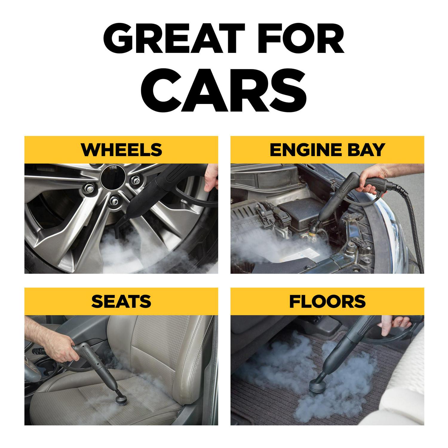– Uses pressurized, 212°F high-temperature steam to loosen and dissolve dirt, cut grease, and grime, expel stains, and clean your vehicle