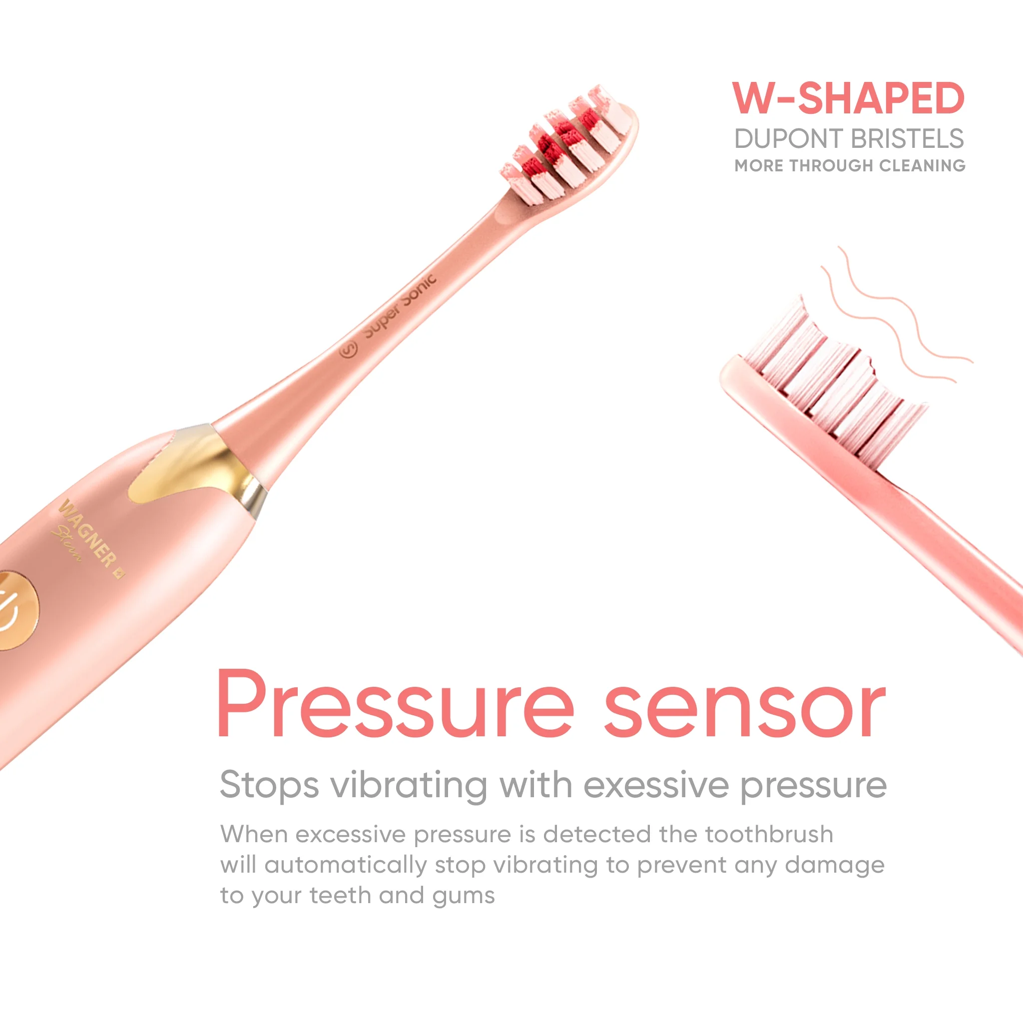 MOST ADVANCED TOOTHBRUSH WITH PRESSURE SENSOR: This Wagner electric toothbrush comes with a high frequency vibration 48,000 VPM levitating motor to ensure a deep, thorough, and effective tooth brushing experience. Toothbrush has 5 cleaning modes and 4 levels of intensity. This combination allows you to choose from any one of 20 cleaning options. In addition, it has a built-in PRESSURE SENSOR to protect your teeth and gums from damage. PRESSURE SENSOR AND 3D SLIDING CONTROL: In order to keep teeth and gums protected and soothed, a SMART vibration mechanism with PRESSURE SENSOR has been built into the toothbrush to ensure the proper gum health protective measures are being taken. As a result, this brush has been proven to improve gum health when compared to competitors. ✅ NOTE! To change intensity level, slide your finger multiple times UP or DOWN over intended area with LED lights on toothbrush. DO NOT PRESS JUST SLIDE. MADE TO COMFORTABLY CLEAN: We include 8 soft DuPont brush heads. In order to keep teeth and gums protected and soothed. SMART timer has been built into the toothbrush. Professional dental recommendations of 2 minutes brushing time with 30 seconds interval reminders are included to ensure the proper gum health We recommend changing the brush head every 3 month. ULTRA WHITENING, IMPROVES GUM HEALTH: As a 100% Dentist-approved vibrating electric toothbrush, the Wagner toothbrush removes up to 10 times more plaque than manual toothbrushes. As a result, it improves gum health in less than 2-weeks, and begins to whiten teeth in less than 1-week. LONG BATTERY LIFE, WIRELESS CHARGING: This soft-touch and non-slip electric toothbrush can be taken with you on-the-go, or left it at home. Our advanced Lithium-Ion battery is known for its long lifetime and will hold a charge for up to 30+ days. 1 YEAR REPLACEMENT WARRANTY.