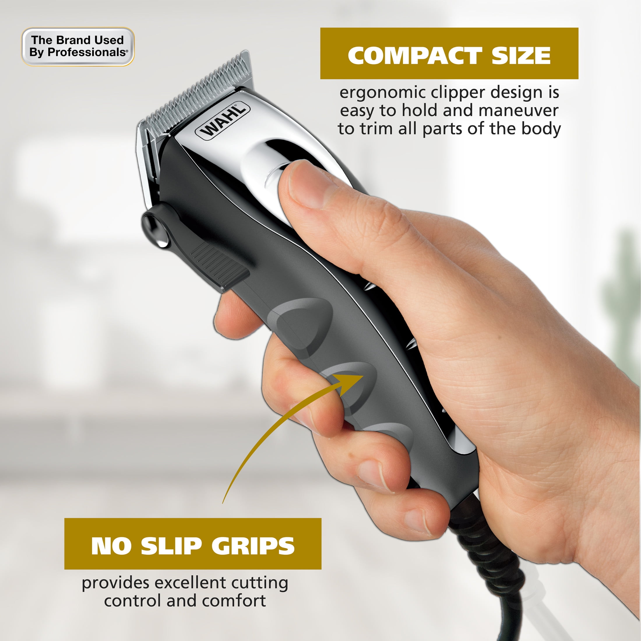 25% smaller design vs standard Wahl clipper provides increased comfort and cutting control Full size self-sharpening blades, premium self-sharpening precision ground blades provide wider cutting coverage than an average body trimmer for men or women Adjustable taper lever allows you to achieve in-between cutting lengths, ideal for blending and fading Ultra powerful, ultra quiet, cuts through the thickest hair without snags and pulling Secure-fit guards with easy to see comb sizes and smooth easy-glide teeth. Up to 12 cutting lengths No slip grip provides excellent cutting control and comfort with compact size and ergonomic clipper design Body grooming, man or woman