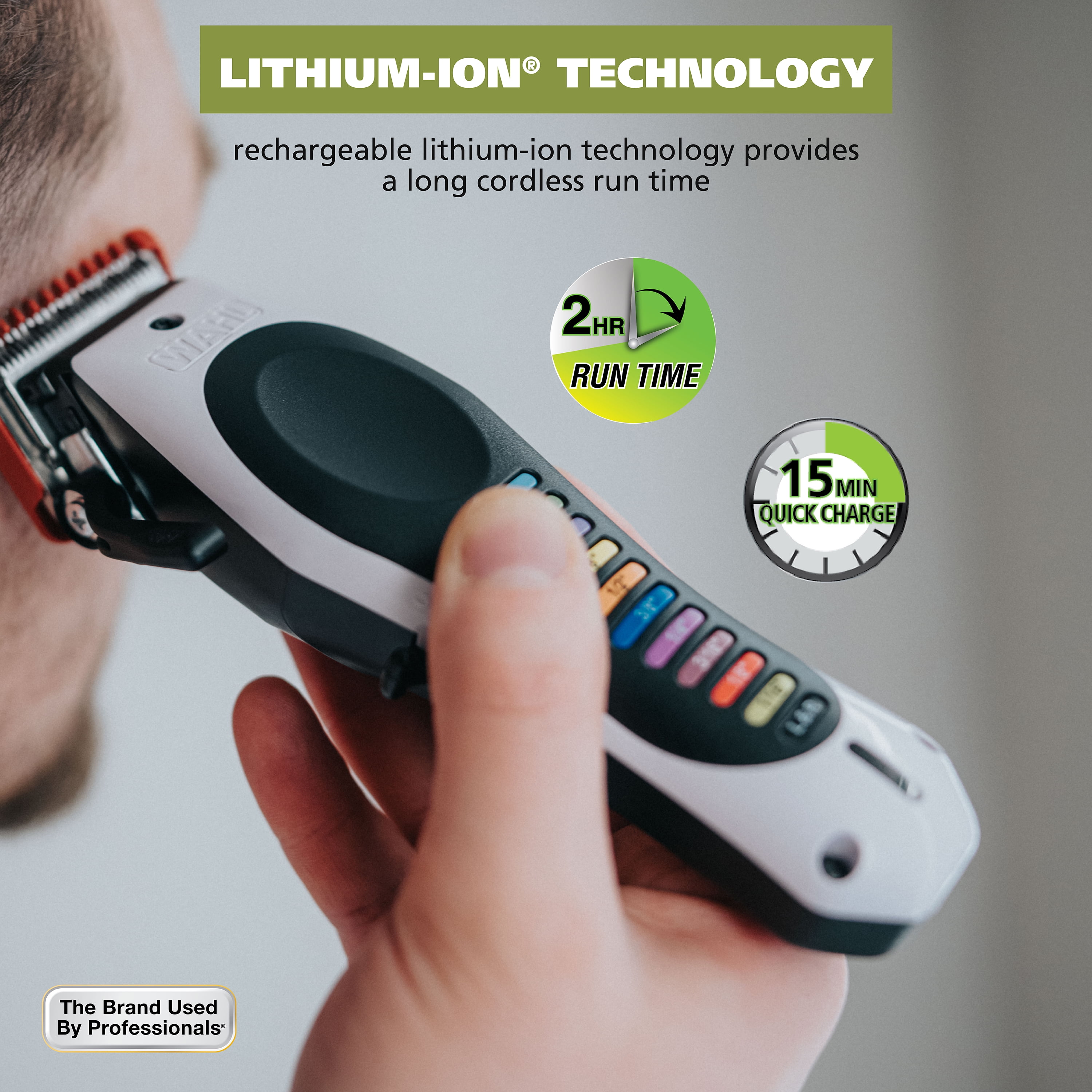 Lithium Ion 2 hour run time Snap-n-lock attachment guards for goof proof haircuts Self-sharpening blades Easy-match color guards with clipper color key Smart Power Indicator Light, Flashing RED (low Power), RED (power charging), BLUE (Fully charged) Worldwide voltage 100-240V for home or international use Adjustable taper lever for blending & fading Multi-purpose use, ideal for men, women, whole family