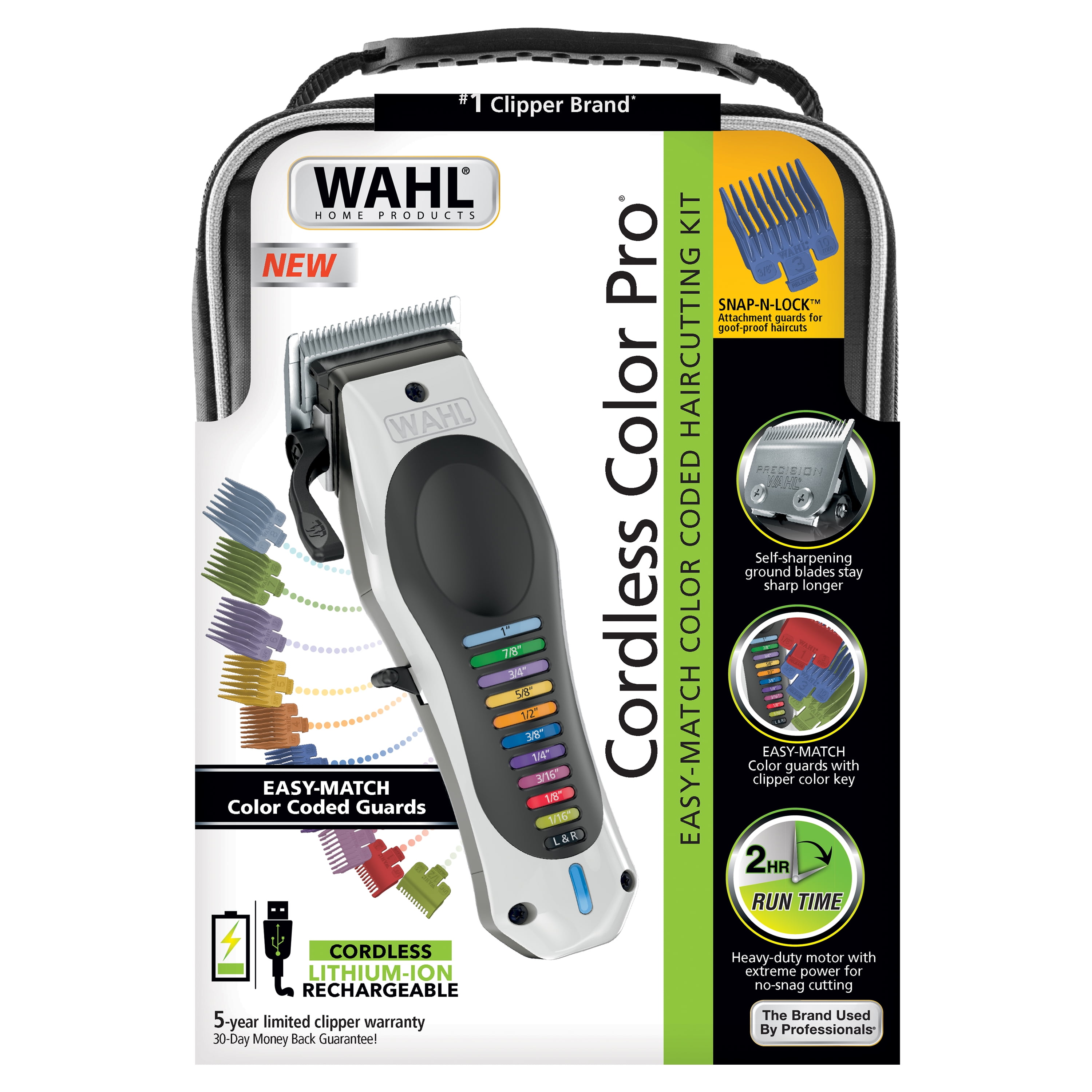 Wahl Cordless Color Pro Hair clipper for men, woman and children. Color coded guards for the perfect cut every time. Our Snap-N-Lock, goof-proof attachments guards have easy glide teeth for superior comfort and cut quality. The Cordless Color Pro provides long-lasting power with a Lithium-Ion rechargeable battery, holding a charge for up to 9 months. Cordless convenience with 2 hour run time, 15 minutes quick charge for 5 minutes of run time. Wahl Cordless Color Pro has an adjustable taper lever for blending and fading, along with self-sharpening blades that stay sharp longer.