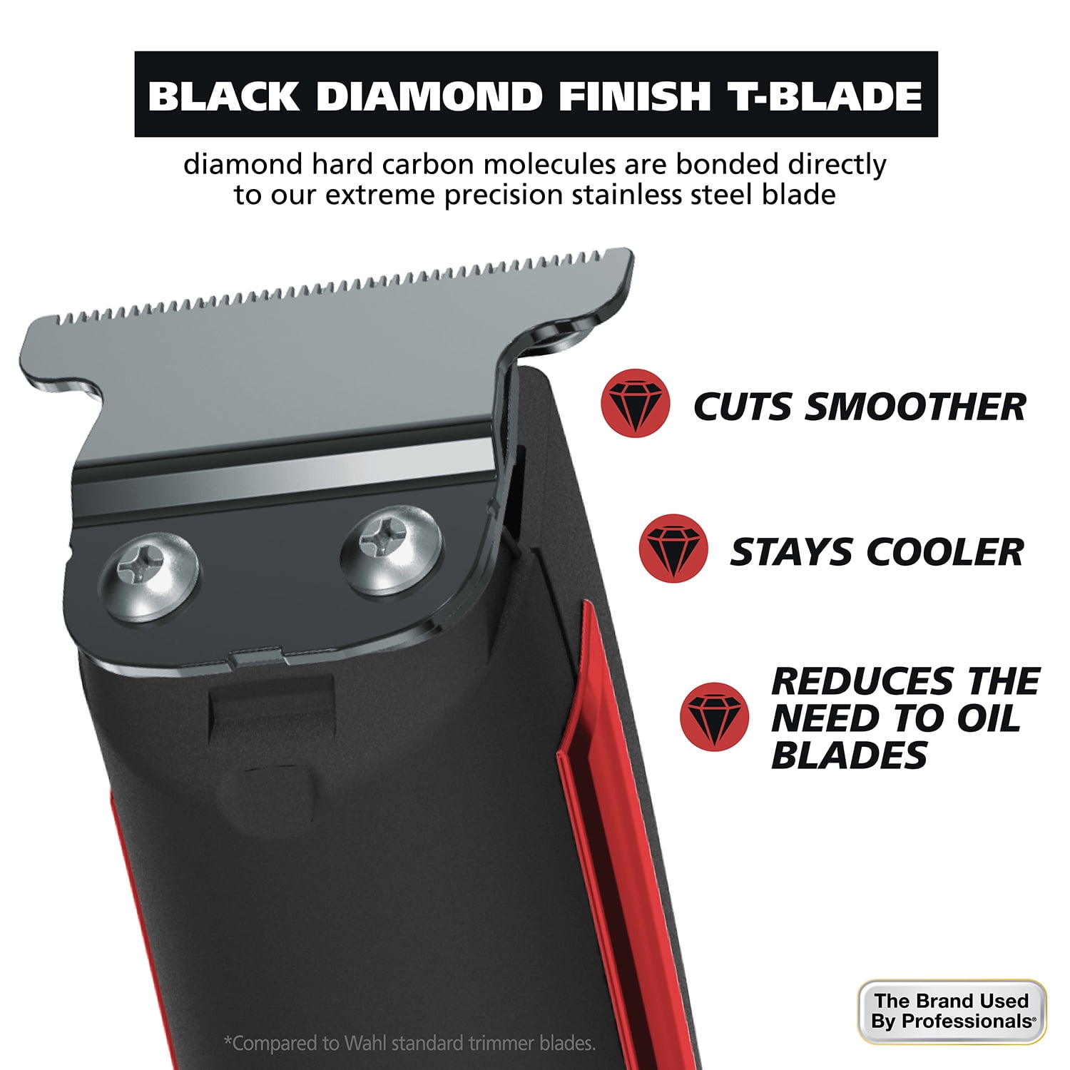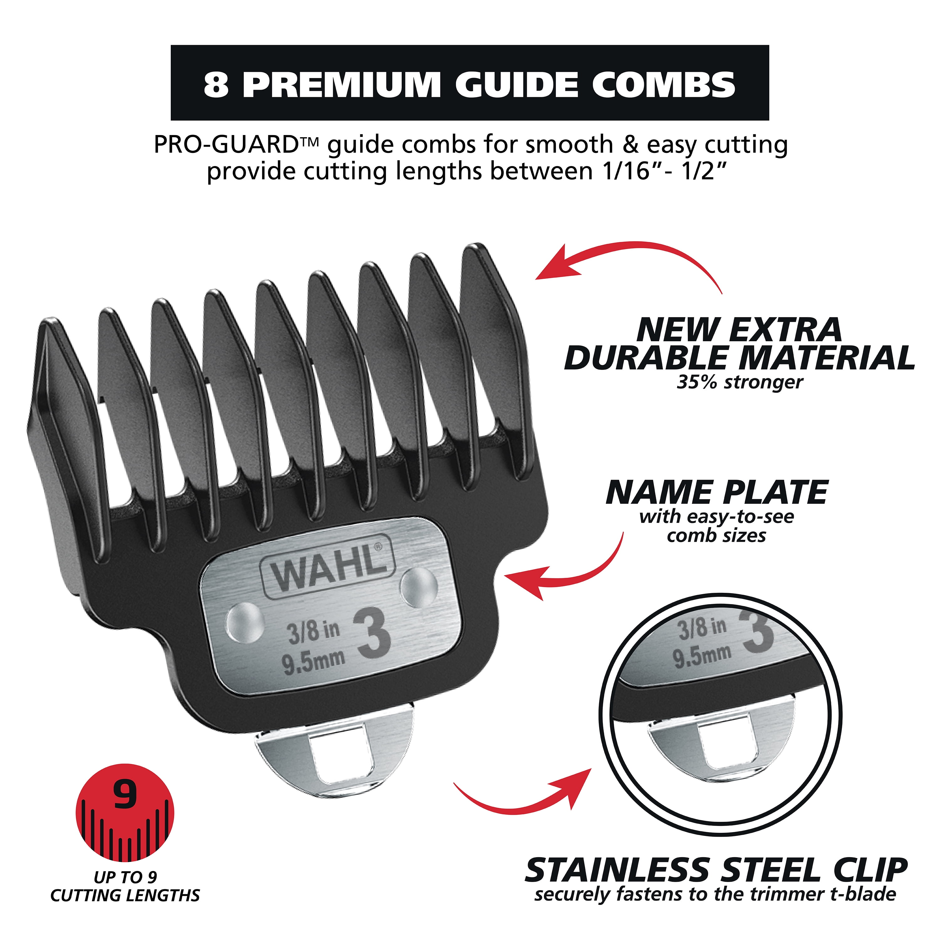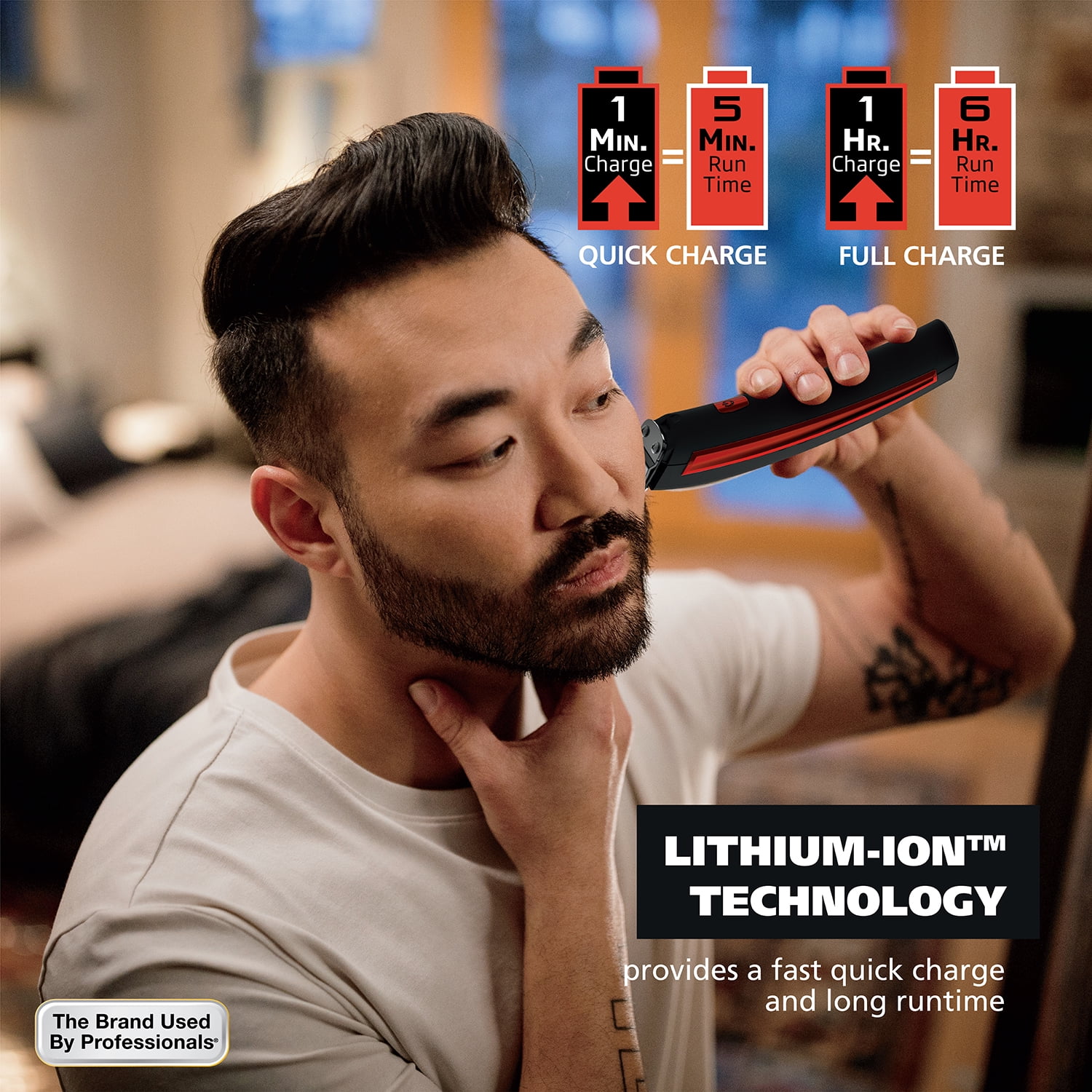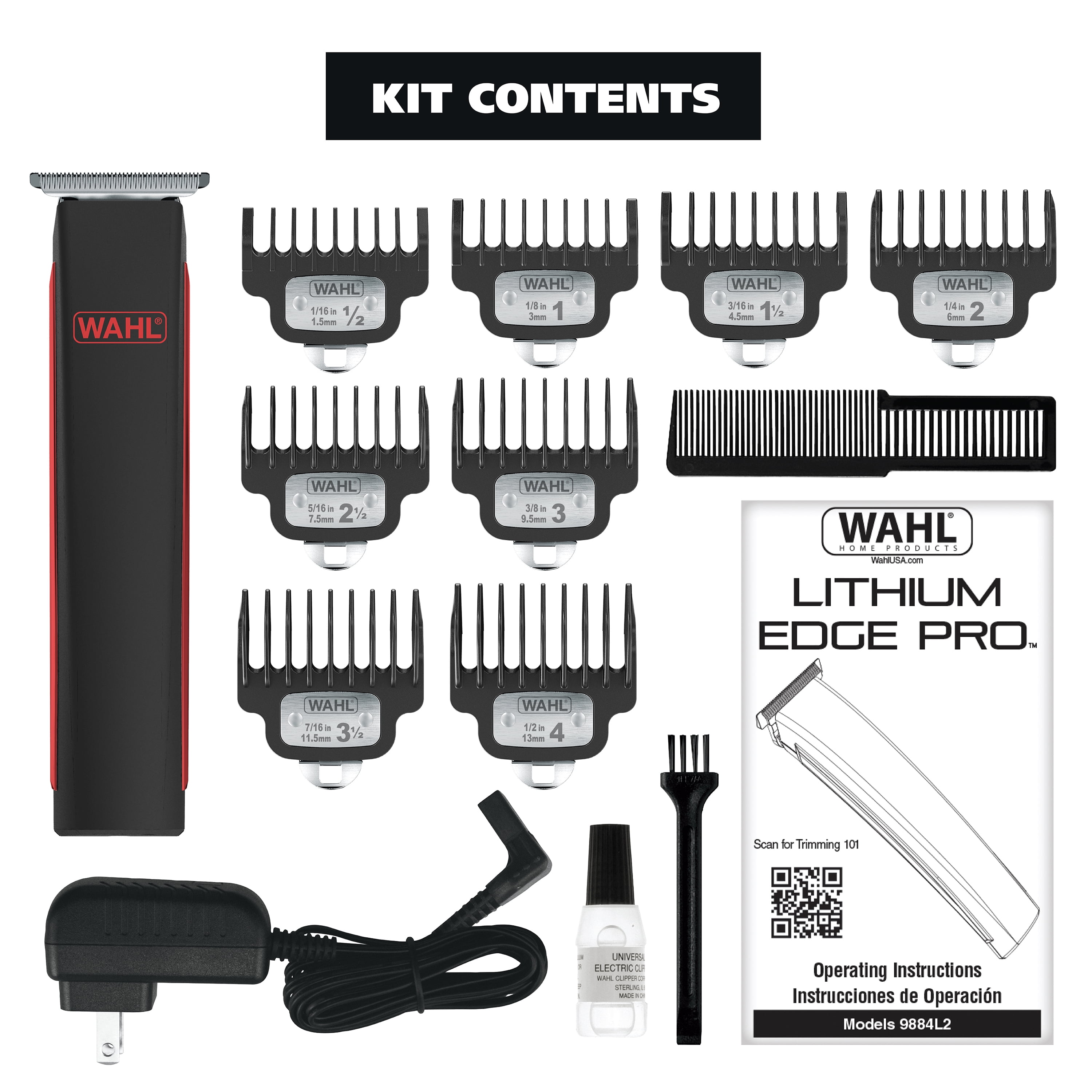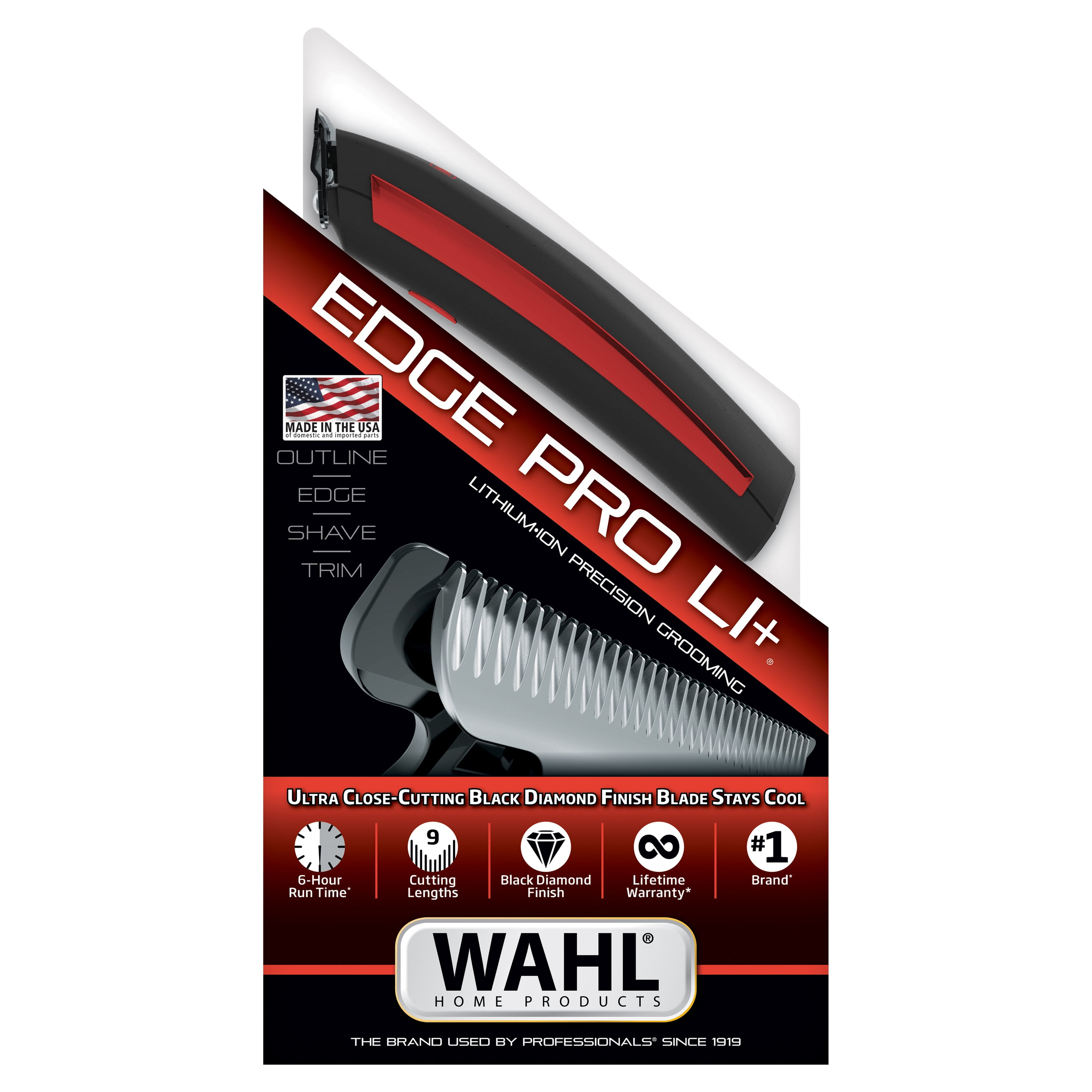 Wahl Clipper Edge Pro Lithium Ion Plus Precision Beard Trimming Kit for Men, 9895. The Wahl Clipper Edge Pro Lithium Ion Plus precision beard trimmer features everything needed for at-home beard trimming and grooming. The ultra-close cutting black diamond finish blade stays cool during long trimming sessions. Perfect for outlining and edging hairlines, as well as achieving close shaves and rimming facial hair. In addition, the diamond finish T-blade allows for four-times closer cutting than a traditional blade. The lithium ion+ battery technology allows for up to six hours of run time from a single charge. This fourteen-piece beard trimming kit features the trimmer, black diamond finish T-blade, eight beard guards from 1/16″ to 1/2″, beard comb, blade oil, cleaning brush, worldwide charger, and English and Spanish instructions. Add the Wahl Edge Pro to your cart today to start giving professional quality beard trimming at home!