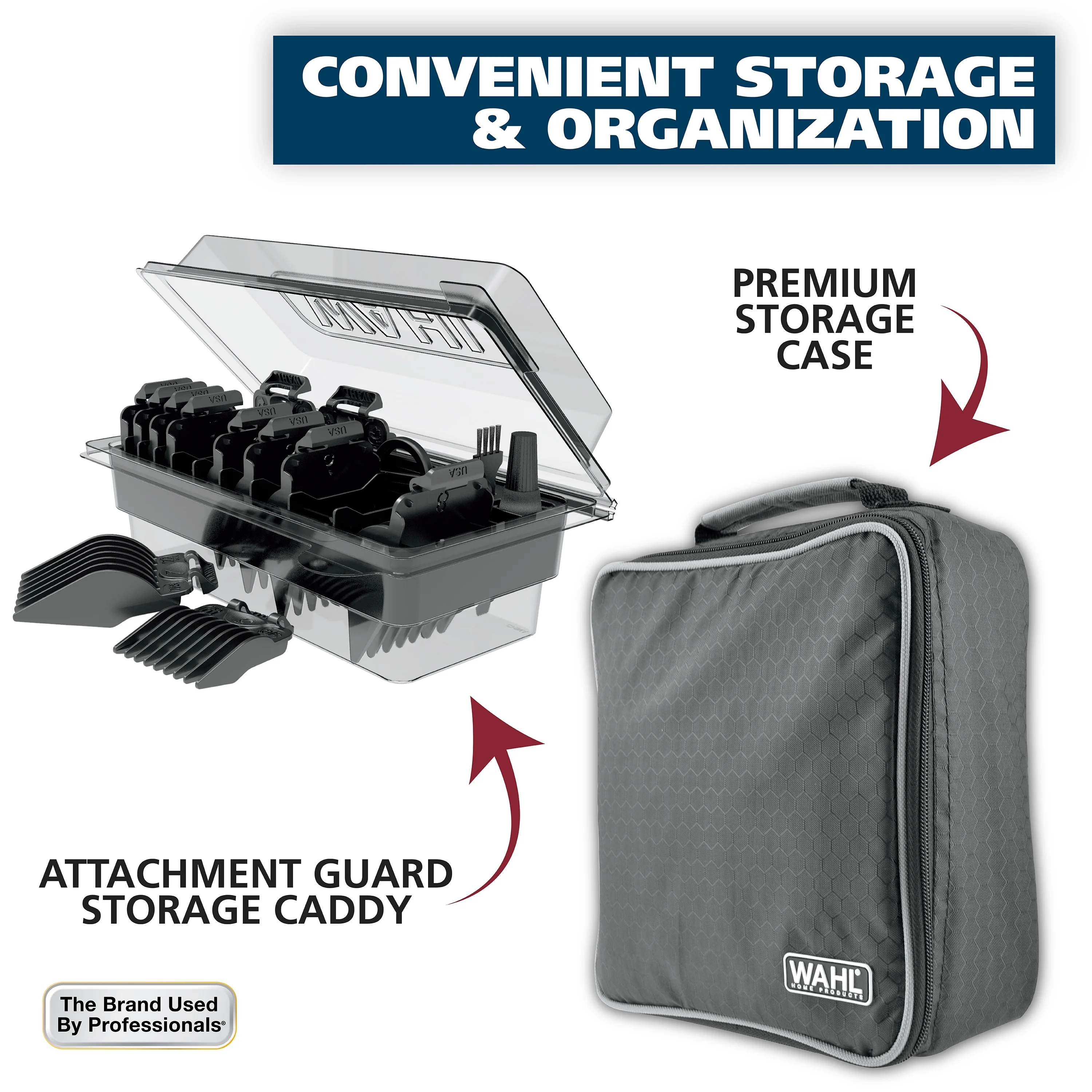 Rechargeable lithium power with a heavy-duty motor for powerful, long-lasting cutting performance 2-hour run time, 15-minute quick charge and 50% more power Complete set of guide combs with bonus organizer Advanced technology with superior power and performance Lithium-ion hair clipper and a full-size detail trimmer for touch ups Wahl’s best self-sharpening blades are precision ground for snag-free cutting Cordless hair clipper is convenient to use at home or to pack up for travel Comes with a large case for storage Items included: 23-Piece Haircutting Kit, Left Ear Taper, Right Ear Taper, No. ½ 1/16″ (1.5mm), No. 1 1/8″ (3mm), No. 1½ 3/16″ (4.5mm), No. 2 1/4″ (6mm), No. 3 3/8″ (10mm), No. 4 1/2″ (13mm), No. 5 5/8″ (16mm), No. 6 3/4″ (19mm), No. 7 7/8″ (22mm), No. 8 1″ (25mm), Scissors, Blade Oil & Cleaning Brush, Trimmer Blade Guard, Battery Trimmer (2 AA Batteries Required, not Included), Clipper Blade Guard, Multi-cut® Clipper, Clipper charger, Styling Comb, Soft Storage Case, Full Color English & Spanish Instructions/Styling Guide