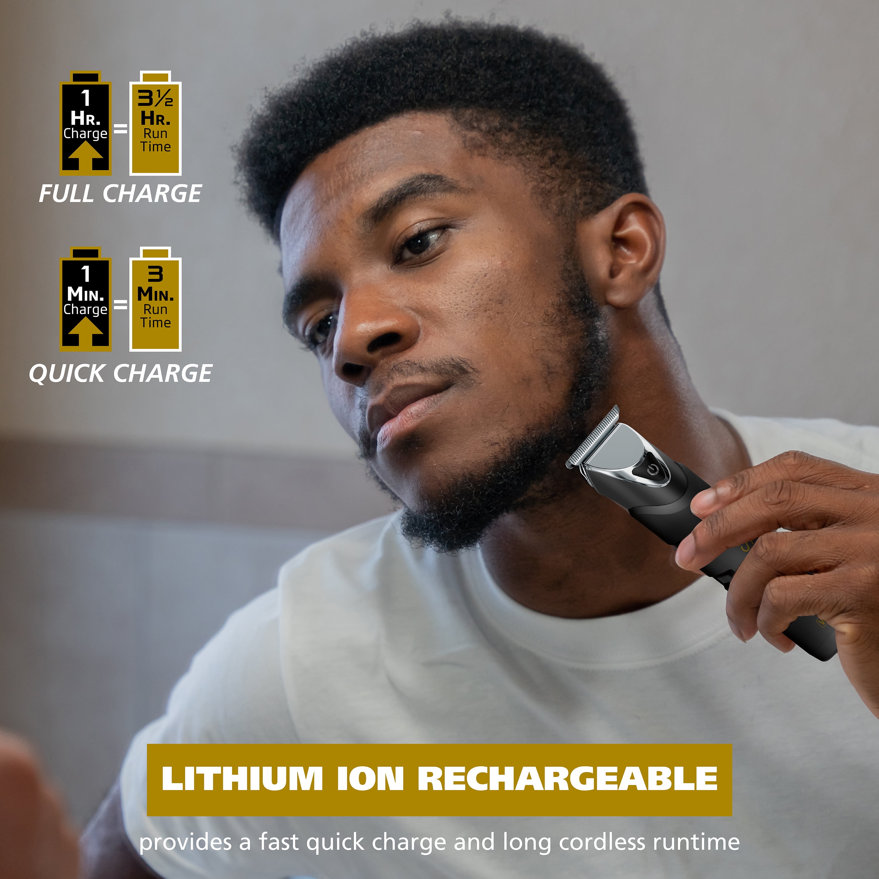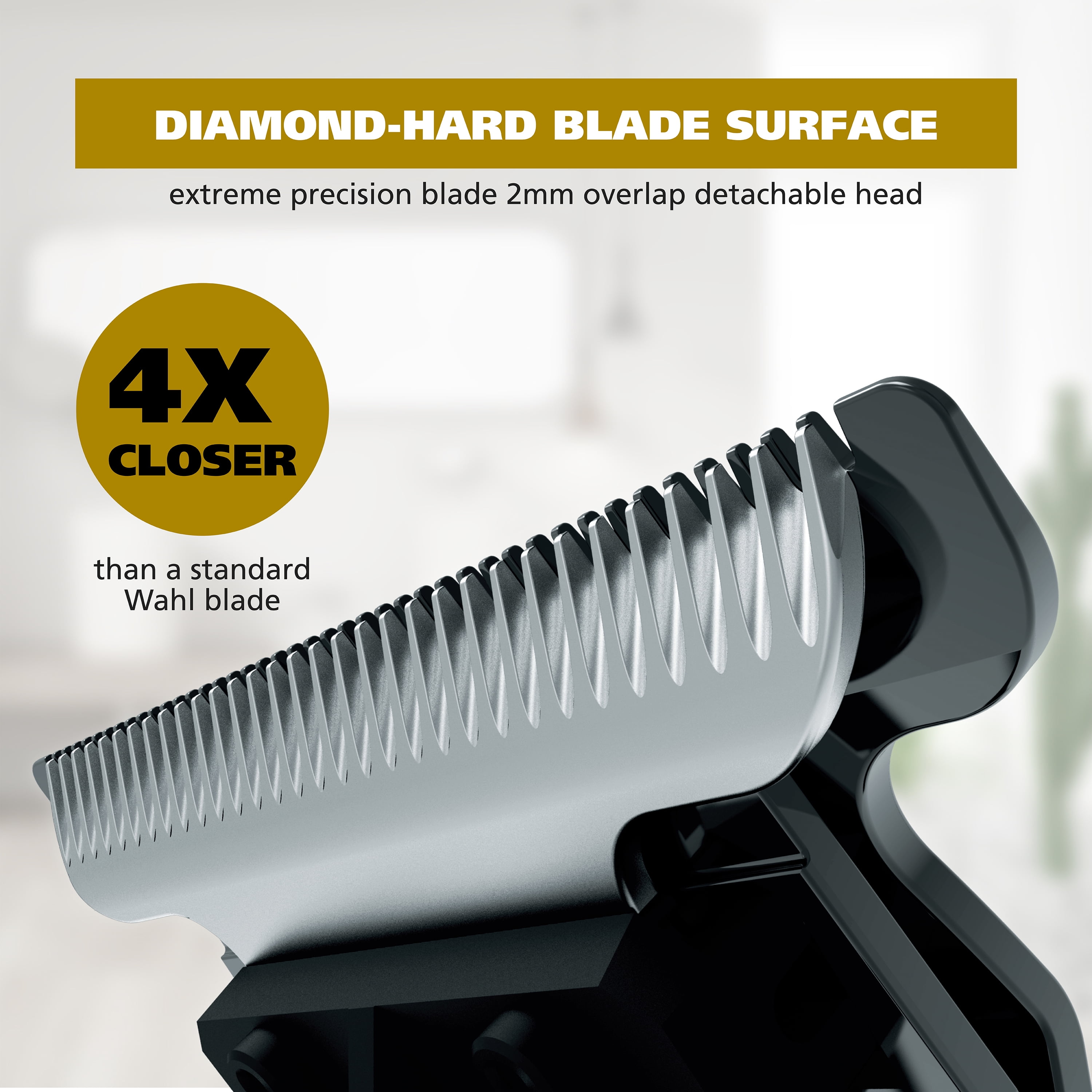 Precision Diamond Hard blade, 4x closer than traditional blade Storage case Lithium Ion technology, 1min quick charge 3 min use or 1hr charge for 3.5 hour run time LED charge indicator 9 Premium Protection Guards securely fasten with Stainless Steel Clip Adjustable Guard for safe male grooming Full Waterproof with a Stainless Steel body and No-Slip Rubber Grip