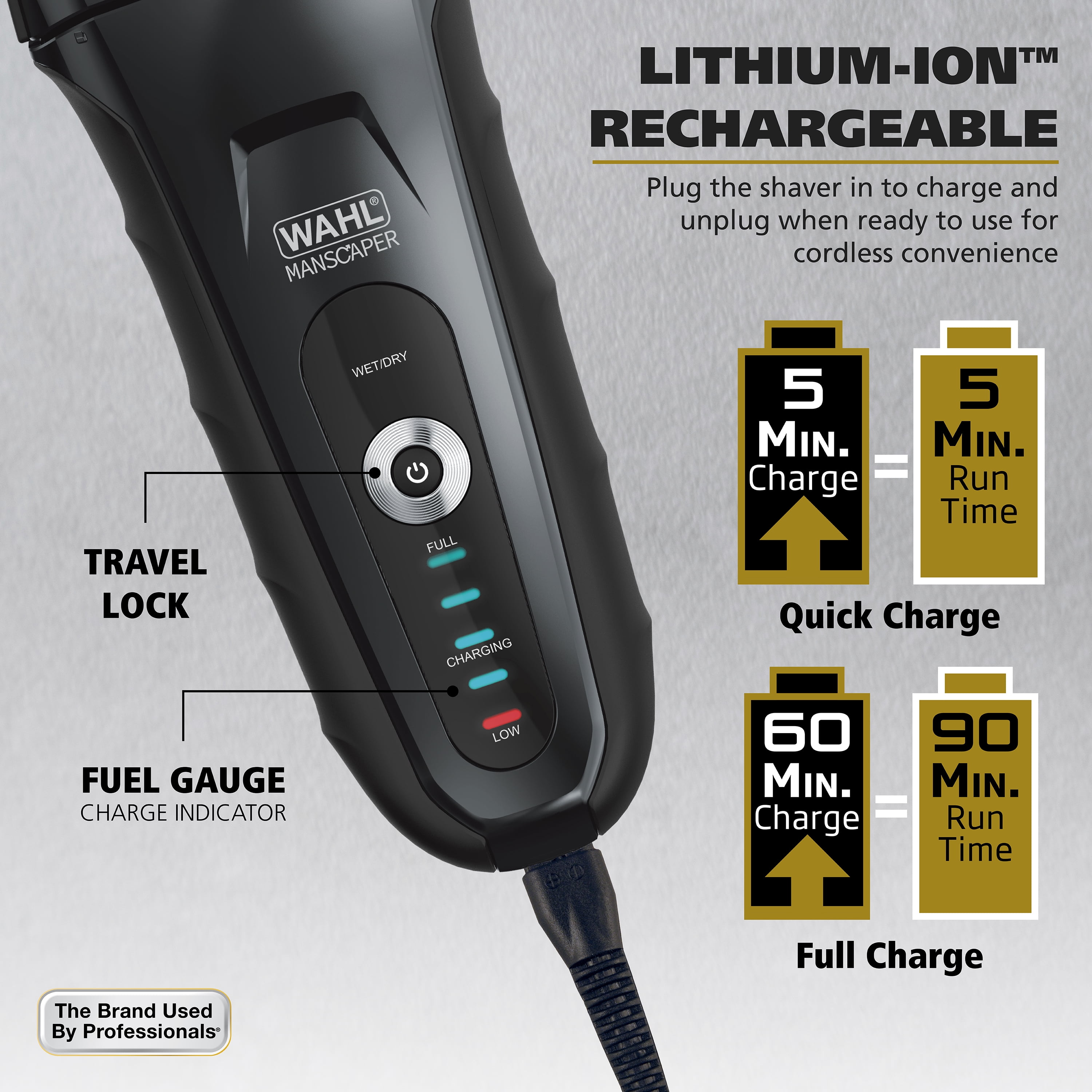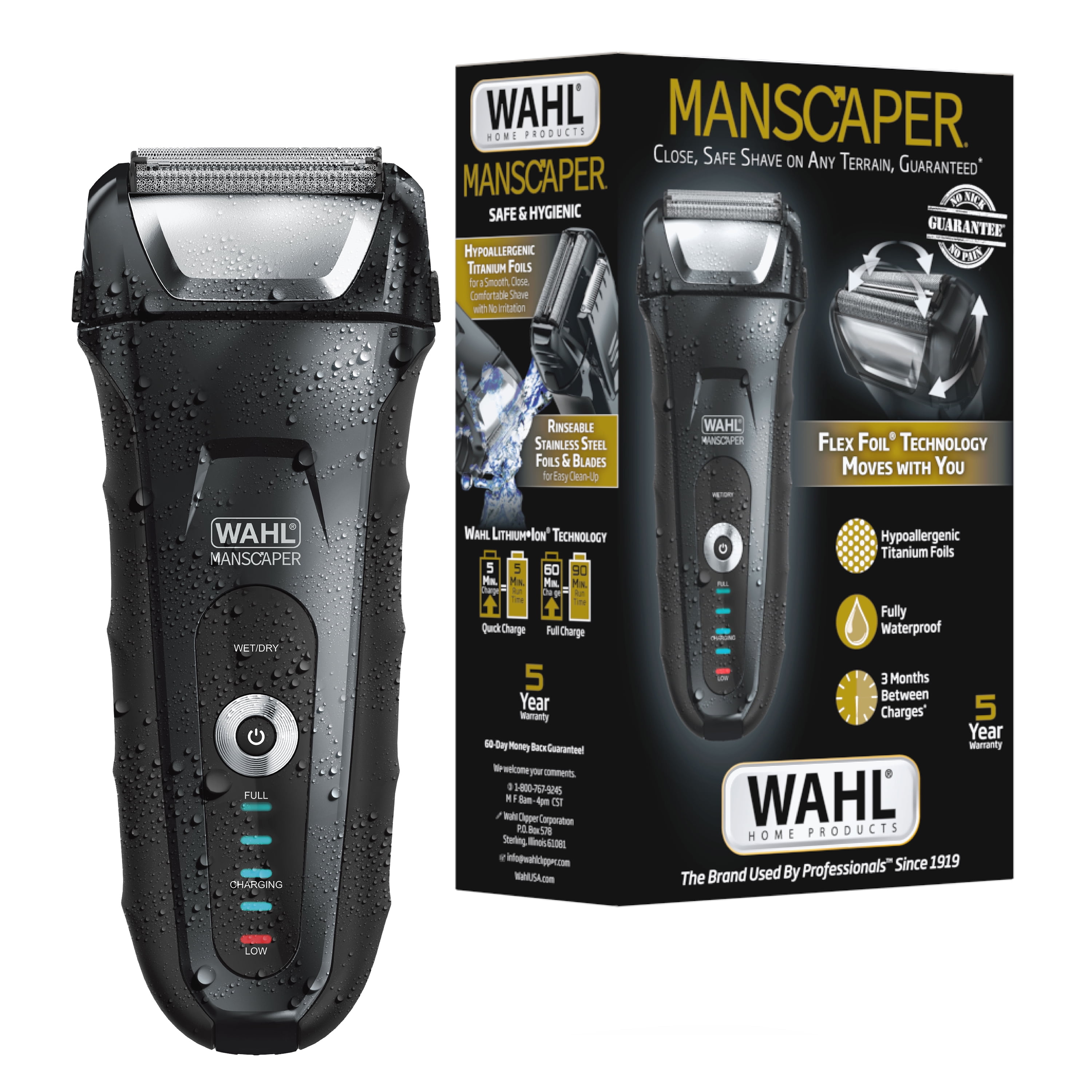 Lithium Ion Power – Manscaper Shaver for men, features a 90-minute run time from a 1 hour charge as well as quick charging with 5 minutes of run time from 5 minutes of charging; The battery and can go up to one year between charges with no ‘memory’ issues Hypoallergenic Foils – Our titanium foils are hypoallergenic which helps to prevent skin irritation and shaver bumps by achieving a smooth, close shave Pop-up trimmer, built in pop-up trimmer for quick touch-up trims on the face, head and body Power & Convenience – This travel-friendly rechargeable wet/dry electric shaver is showerproof and features flexible foil cutters & a pivoting head for a comfortable shave, a non-slip grip & travel lock, & Battery Fuel Gauge Advanced Foil Technology – Flexible foils move with you, providing a more comfortable shave, our advanced foil pattern provides smooth shaves & features a long hair cutter bar as well as a full-size pop-up precision trimmer The Brand Used by Professionals – Wahl clippers and trimmers have been used by professionals in the salon & barber industry since 1919; Featuring self-sharpening precision blades & quality construction