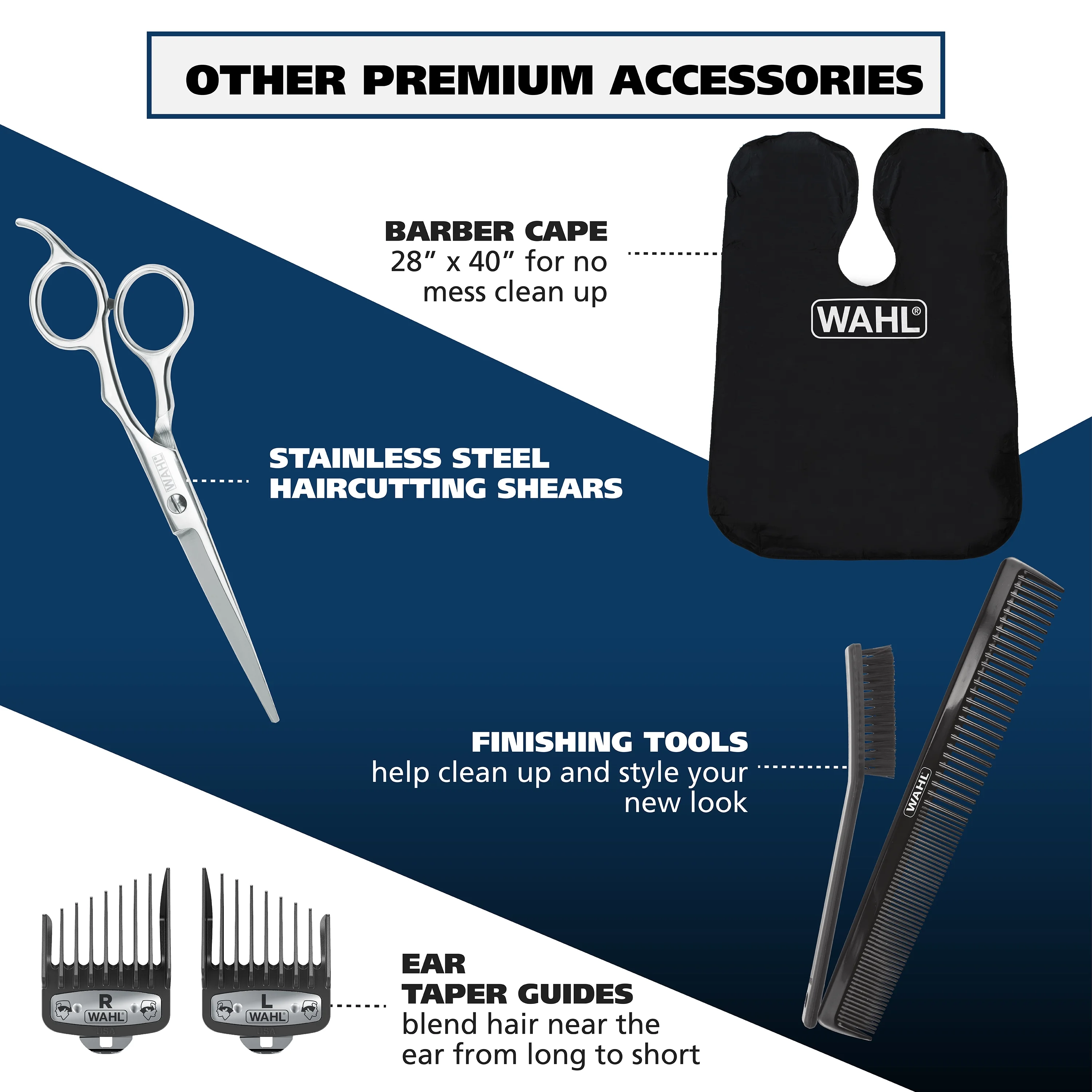 Wahl Pro Series Premier Combo Clipper kit for Hair clipping and beard trimming with free barber shears, Model 79804. Wahl’s Pro Series Premium has our Ultra Power with our best motor giving you a high performance and no-snag cutting. The premium stainless steel attachment guards have a secure snap, easy to read name plate and achieve cutting lengths between 1/16″ to 1″. The tangle free XL 8 foot power cord is braided for for ultimate durability and flexibility. Beard and body Grooming or clean up your neckline and around the ears with the convenient cord/cordless touch up trimmer and the 6 individual trimmer guards with cutting lengths between 1/16″ to 3/8″. The Pro Series Premium kit also has self-sharpening blades and adjustable taper level for easy blending and fading. For a complete kit, premium accessories include barber cape 28 x 40 for no mess clean up, Stainless Steel haircutting shears, Finishing tools, Ear Taper Guides to blend hair near the ear. Neatly organize your clipper attachment guards in the accessory storage caddy that will fit inside the Premium soft storage case.