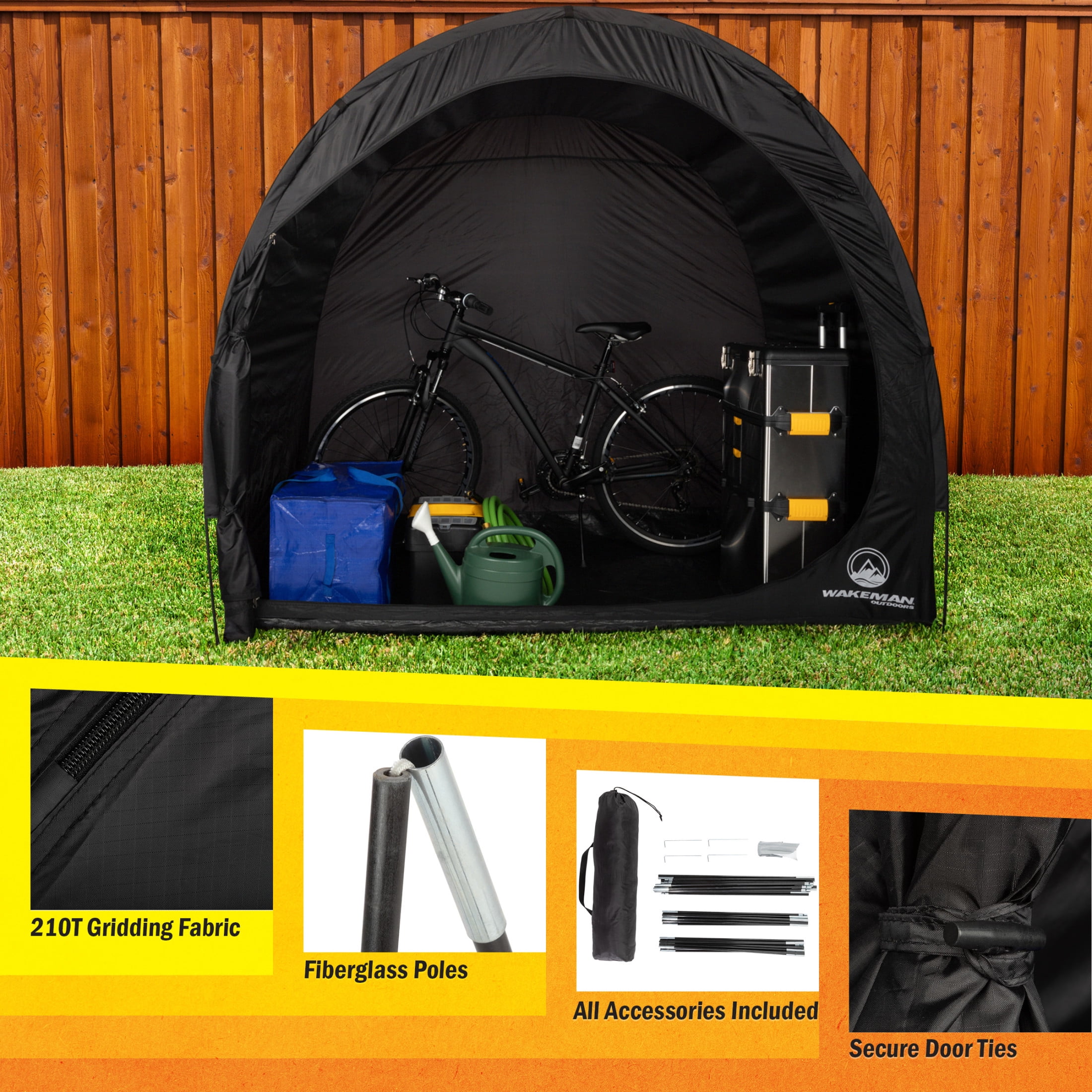 BIKE STORAGE TENT – With a large 6.5×5.3×5.3-foot size, this bike tent provides protection from the outdoor elements for up to 4 mountain, road, BMX, or kids bikes. DURABLE MATERIALS – Made of 210T gridding fabric and fiberglass poles, the outdoor storage shed is rust, water, and UV-resistant and comes with tent stakes to withstand outdoor conditions. CARRY BAG INCLUDED – When you’re done using this bike shed, simply take out the poles and place it in the included carrying bag for compact storage and convenient portability. MULTIPURPOSE USE – Not only is the portable shed great for bike storage, but it can also be used for outdoor storage, gardening tools, sports equipment, outdoor toys, and pool accessories. DIMENSIONS – (L) 82” x (W) 65.7” x (H) 70”; Opening: (L) 78.7” x (W) 62.99” x (H) 65.7”; Collapsed: (L) 26.7” x (W) 6.7” x (H) 6.7”; Product Weight: 7.05lbs. MATERIALS – 210T Gridding Fabric and Fiberglass Poles. COLOR – Black.
