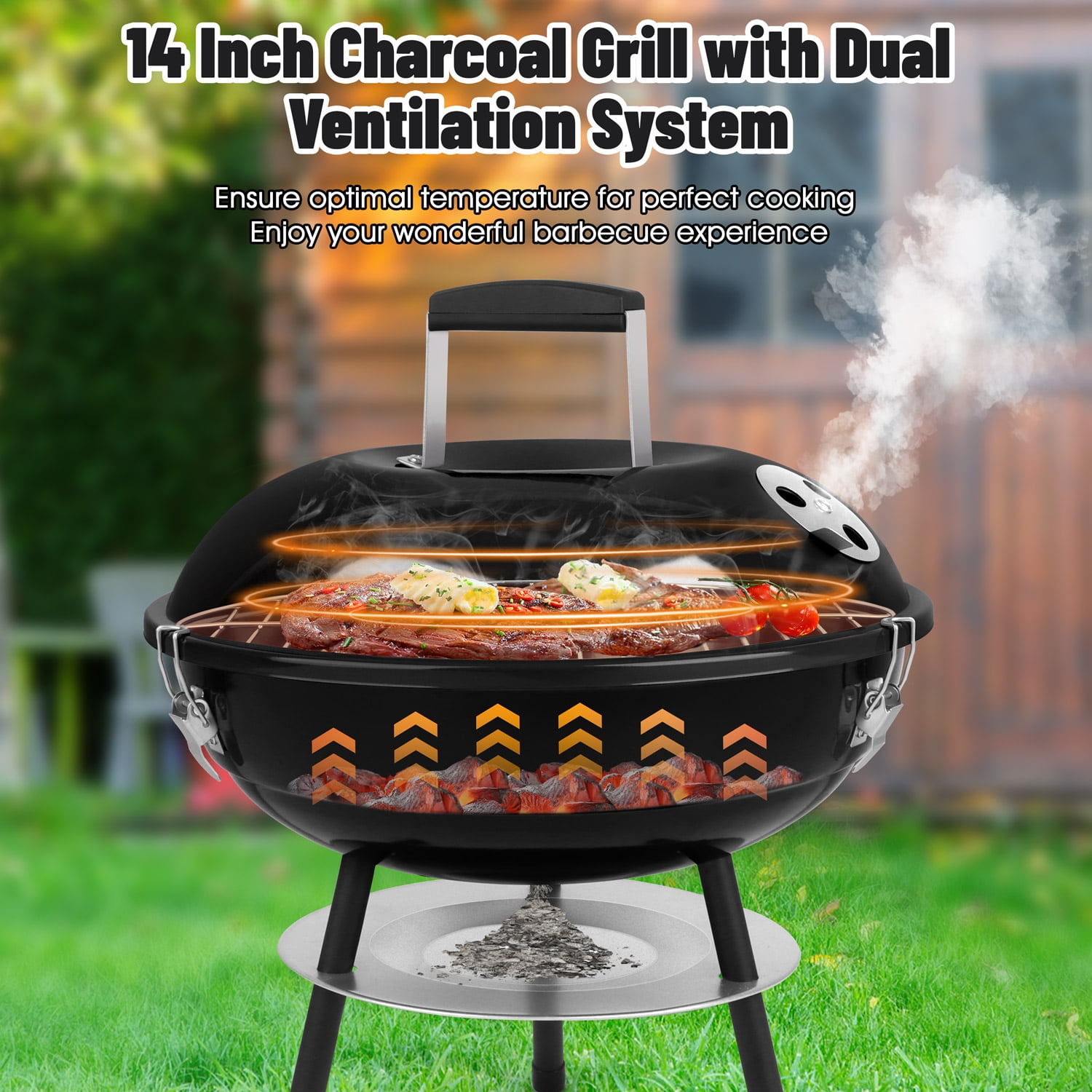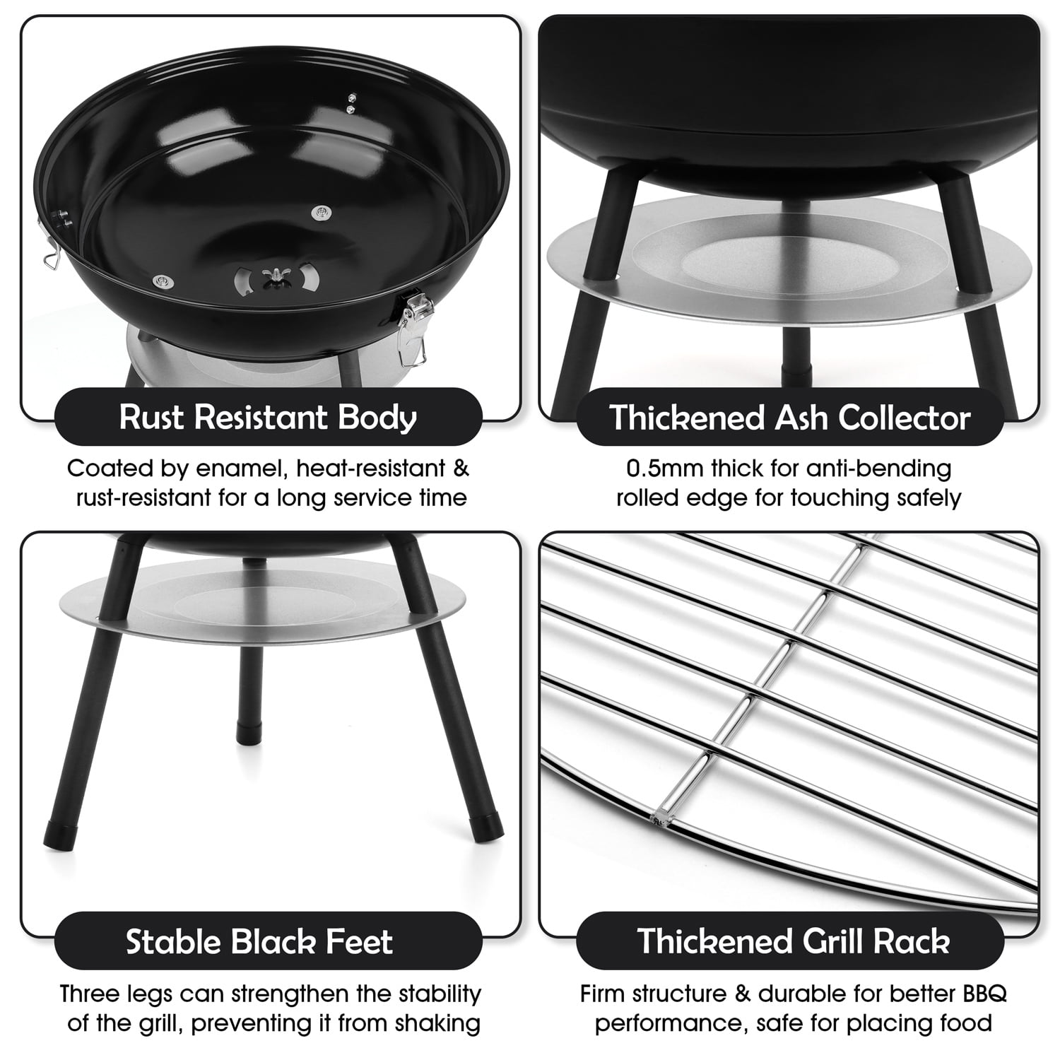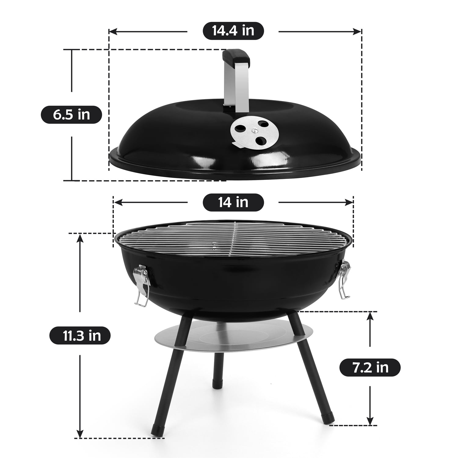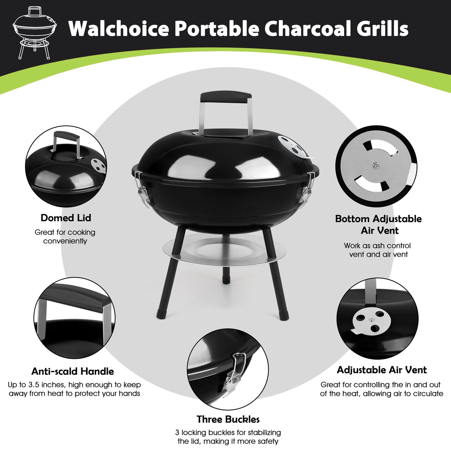 PREMIUM QUALITY – Walchoice charcoal grill is made of high-quality iron steel, Surface of lid and grill bowl are coated by enamel, Heat resistance up to 400°, No worry about peeling off any toxic substances at the high temperature, safe for daily use, Good abrasion resistance and rust resistance for a long service time WELL DESIGN – PP plastic handle up to 3.5 inches, high enough to keep away from heat for protecting your hands, Non-toxic grill rack with firm structure for better barbecue performance, 0.5 mm thick ash collector for collecting fallen ash to avoid mess, 3 black legs for strengthening the stability of grill without wobbling EXCELLENT VENTILATION – Portable charcoal grill features a dual ventilation system, Great for regulating the airflow conveniently to keep the charcoal burning, Help to ensure optimal temperature for perfect cooking, Or close the air vent to quickly extinguish the fire, Bring you a wonderful barbecue experience COMPACT & PORTABLE – 14 inch charcoal grill with a light-weight structure is portable, Compact design for easily placing in the trunk of the car, 3 locking buckles are great for securing the lid to make it easy to move around and carry to patio, backyard, porch, camping, park, beach, garden or other outdoor locations GREAT GIFT – Barbecue grill with about 150 square inches of cooking area is versatile, Ideal for family member or several friends gathering, Perfect for dealing with bacon, steaks, sausages, vegetable, burgers, cheese, fish, kabobs, ribs, Easy to install by a screwdriver, A great BBQ gift on birthday, Thanksgiving Day, Christmas, etc