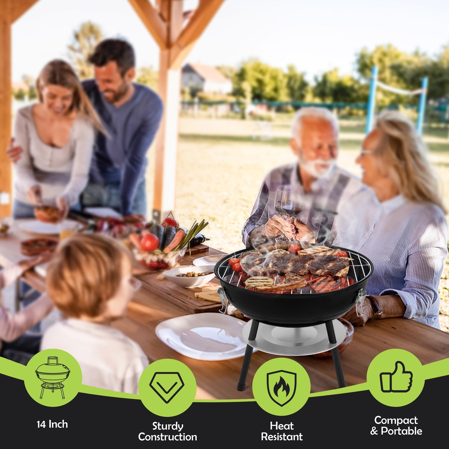 Walchoice charcoal grill is crafted from premium iron steel, and surface of lid and grill bowl are coated by enamel. It is characterized with heat resistance up to 400°, no worry about peeling off any toxic substances at the high temperature. Barbecue grill with compact design is portable, and features a dual ventilation system which is great for better BBQ performance. It can be carried to any outdoor locations and can deal with various food. Meet your different needs! Specification Name: 14 inch Portable Charcoal Grill Brand: Walchoice Material: Iron Steel Color: Black Dimension: 14.4 x 17.8 inch Package: 14 in Charcoal Grill x 1, Screwdriver x 1 Feature: Enamel surface, Dual ventilation system, Heat resistance, Anti-rust, Non-toxic, Exquisite design, Compact and portable, Firm structure Advantages High-quality Material – Made of premium iron steel, surface of lid and grill bowl finished with enamel, heat resistance up to 400° Dual Ventilation System – Great for regulating airflow to keep charcoal burning and ensuring optimal temperature for perfect cooking Firm Structure – 3 locking buckles help to secure the lid, and 3 reinforced legs can support the charcoal grill without wobbling Upgraded Design – Anti-scald handle is high enough to avoid scalding, thickened & durable grill rack is non-toxic for direct contact with food