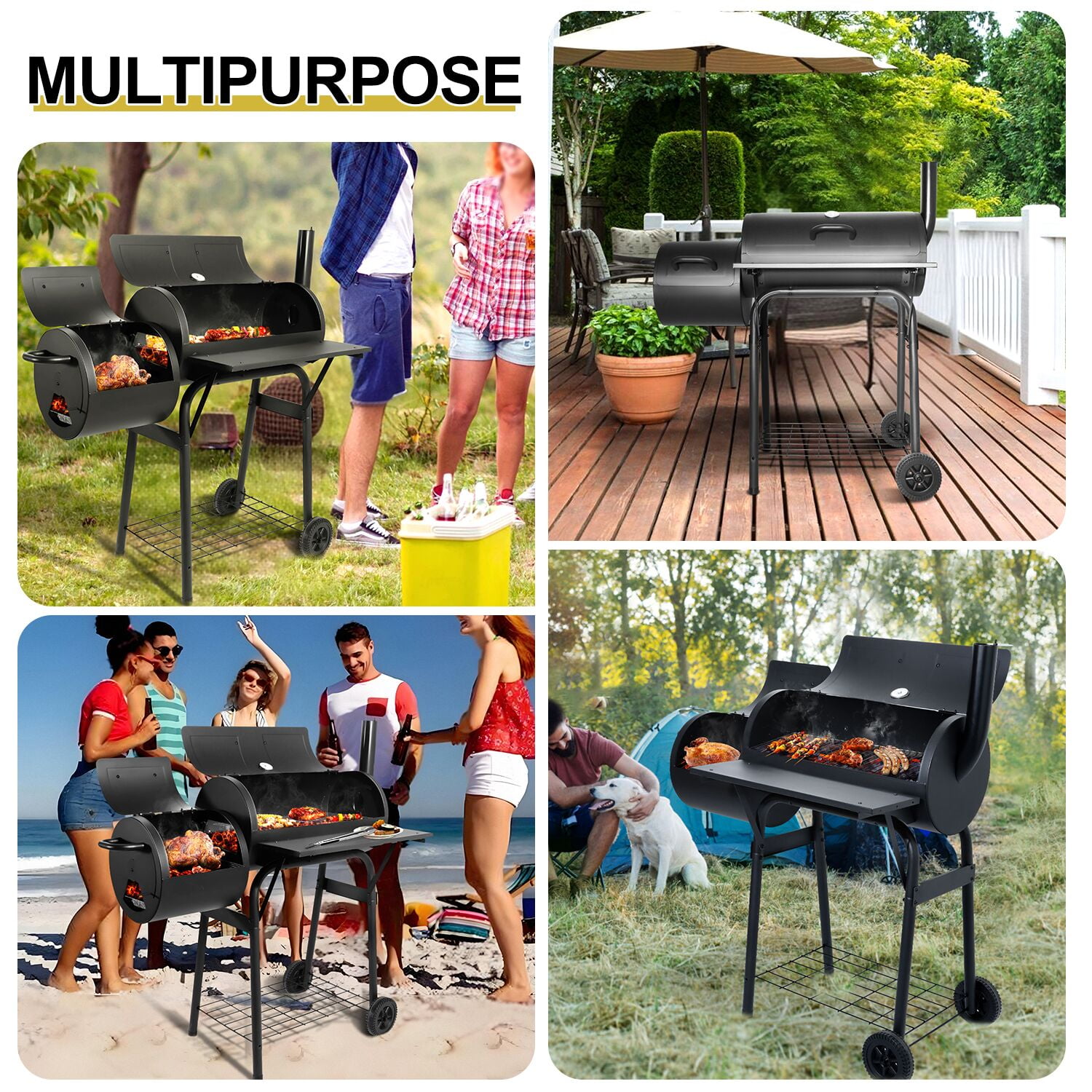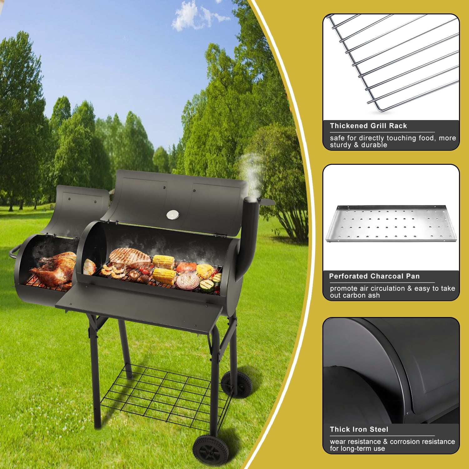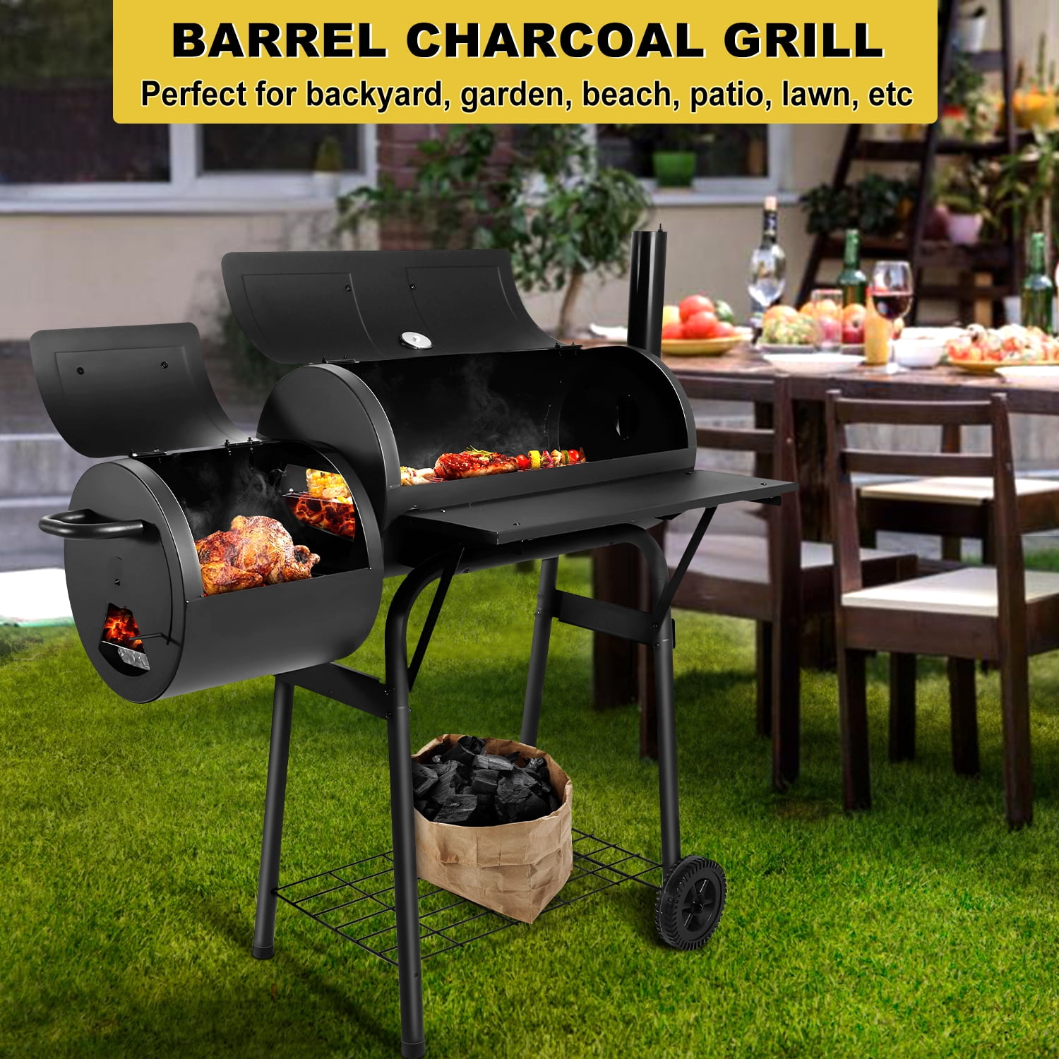 HIGH QUALITY – Walchoice barrel charcoal grill is made of premium iron steel, High-fired powder surface can withstand high temperature without deformation or coating peeling off, Healthy and safe for barbecue cooking, Good corrosion resistance and rust resistance for a long service time, U-shaped support legs and solid screws for enhancing grill’s stability without wobbling EXQUISITE DESIGN – One-piece design of the front table provides enough space for placing food, seasonings or other items without falling, With 3 holes on each side and 6 S-shaped hooks offered to hang barbecue tools, Bottom shelf offers additional storage area for holding more items up to 20 lbs without deformation, Wider heat-proof handles for protecting hands without scalding UPGRADED GRILL RACKS – Crafted from food-grade chrome-plated material, Safe enough for directly touching food, No worry about releasing any toxic substances, Thickened rust-free wires for ensuring sturdy and durable in daily use, About 129 square inches cooking area of offset smoker and 303 square inches of main chamber can hold a variety of delicious food for 5-6 people HEAT CONTROL SYSTEM – Built-in thermometer with precise scale is convenient for monitoring the real-time temperature to bring a better cooking taste, Adjustable side air vent and chimney with cover are great for regulating the airflow to keep charcoal burning continuously, Removable charcoal pan for easier to take out ash to avoid mess, Bring you a better barbecue experience MULTIFUNCTIONAL – Charcoal grill with upgraded wheels can be carried outdoors conveniently, Perfect for backyard party, outdoor camping, beach party, garden, patio, lawn barbecue, Ample space for cooking steaks, fishes, cheese burgers, sausages, onions, kabobs, mushrooms, chicken, capsicums, etc, A great gift for barbecue lovers, Also plus 2 screwdrivers to install the charcoal grill