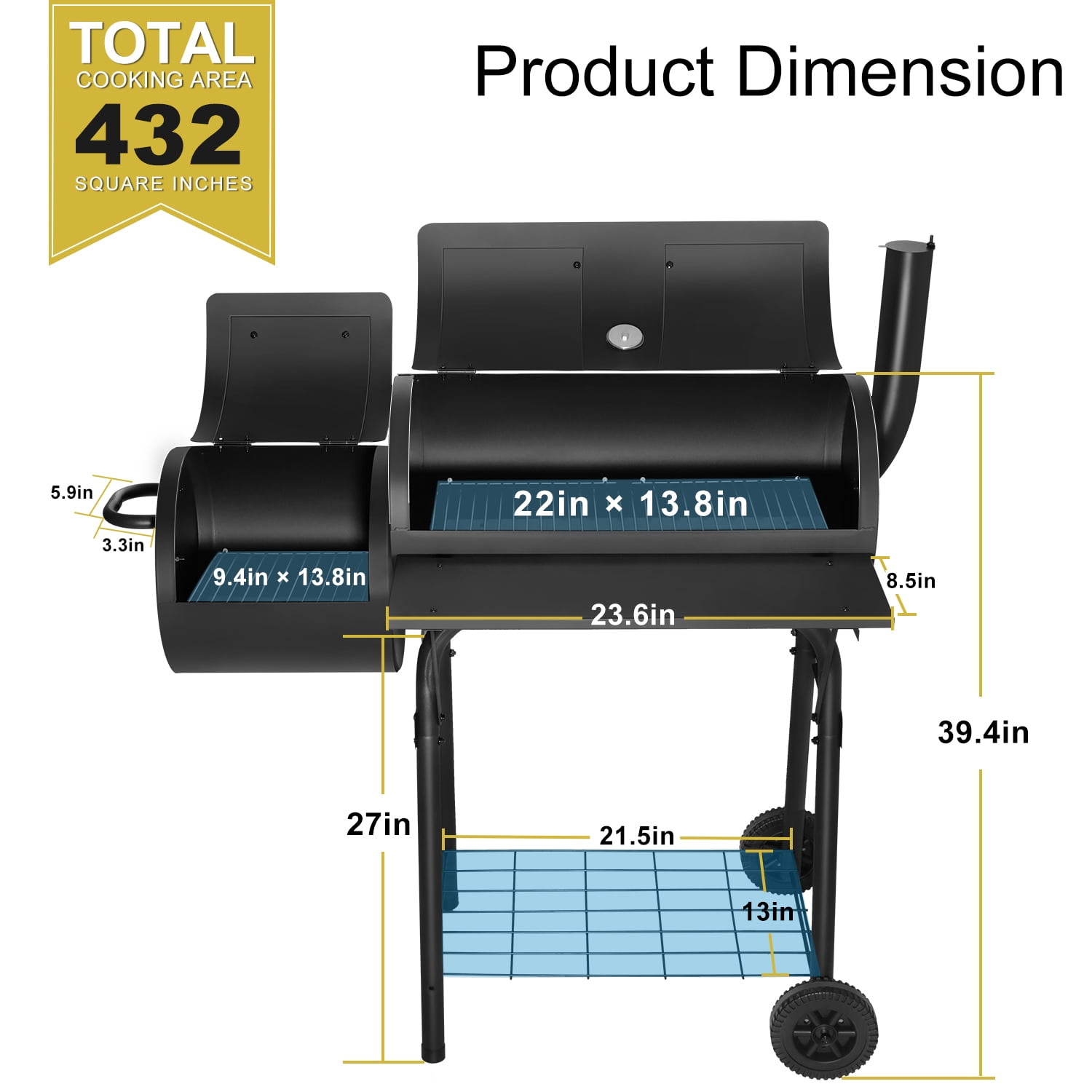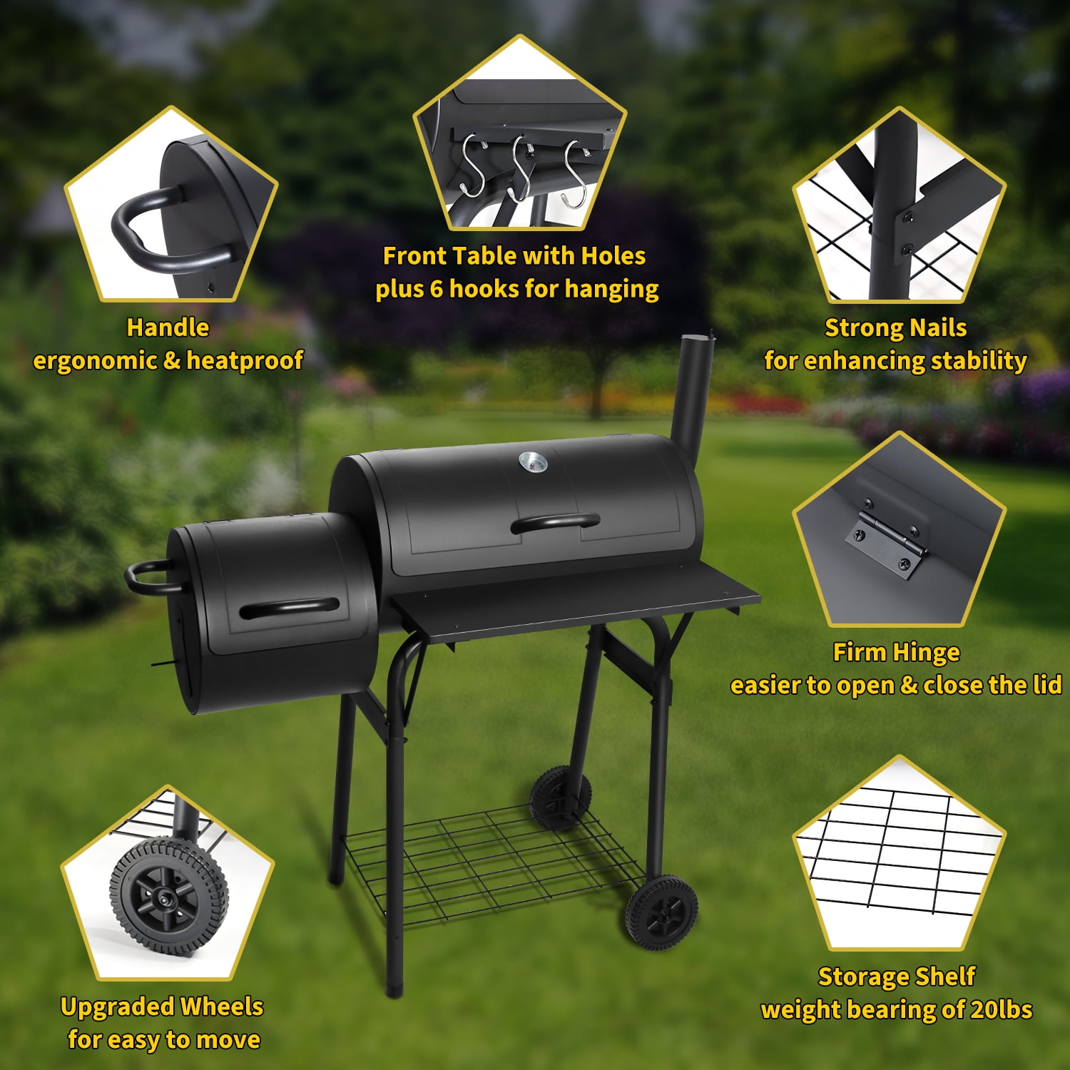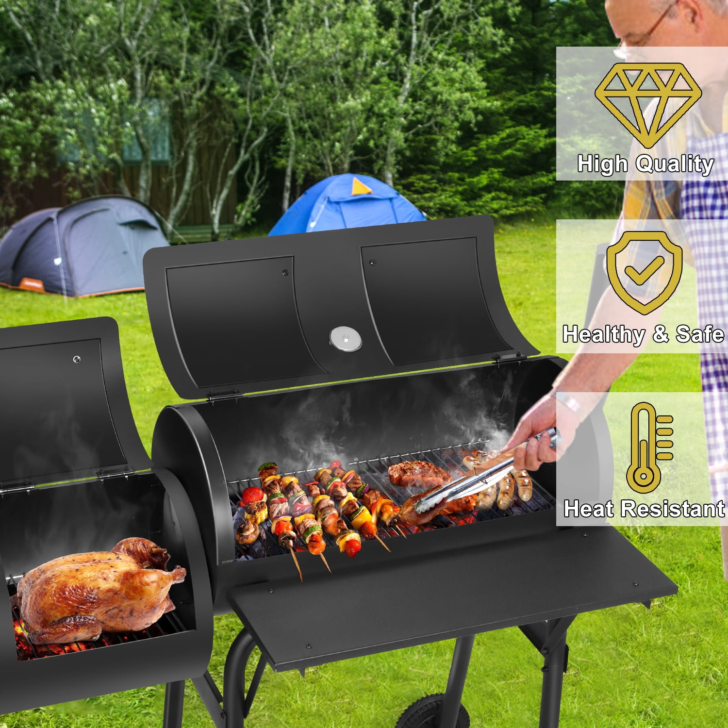 HIGH QUALITY – Walchoice barrel charcoal grill is made of premium iron steel, High-fired powder surface can withstand high temperature without deformation or coating peeling off, Healthy and safe for barbecue cooking, Good corrosion resistance and rust resistance for a long service time, U-shaped support legs and solid screws for enhancing grill’s stability without wobbling EXQUISITE DESIGN – One-piece design of the front table provides enough space for placing food, seasonings or other items without falling, With 3 holes on each side and 6 S-shaped hooks offered to hang barbecue tools, Bottom shelf offers additional storage area for holding more items up to 20 lbs without deformation, Wider heat-proof handles for protecting hands without scalding UPGRADED GRILL RACKS – Crafted from food-grade chrome-plated material, Safe enough for directly touching food, No worry about releasing any toxic substances, Thickened rust-free wires for ensuring sturdy and durable in daily use, About 129 square inches cooking area of offset smoker and 303 square inches of main chamber can hold a variety of delicious food for 5-6 people HEAT CONTROL SYSTEM – Built-in thermometer with precise scale is convenient for monitoring the real-time temperature to bring a better cooking taste, Adjustable side air vent and chimney with cover are great for regulating the airflow to keep charcoal burning continuously, Removable charcoal pan for easier to take out ash to avoid mess, Bring you a better barbecue experience MULTIFUNCTIONAL – Charcoal grill with upgraded wheels can be carried outdoors conveniently, Perfect for backyard party, outdoor camping, beach party, garden, patio, lawn barbecue, Ample space for cooking steaks, fishes, cheese burgers, sausages, onions, kabobs, mushrooms, chicken, capsicums, etc, A great gift for barbecue lovers, Also plus 2 screwdrivers to install the charcoal grill