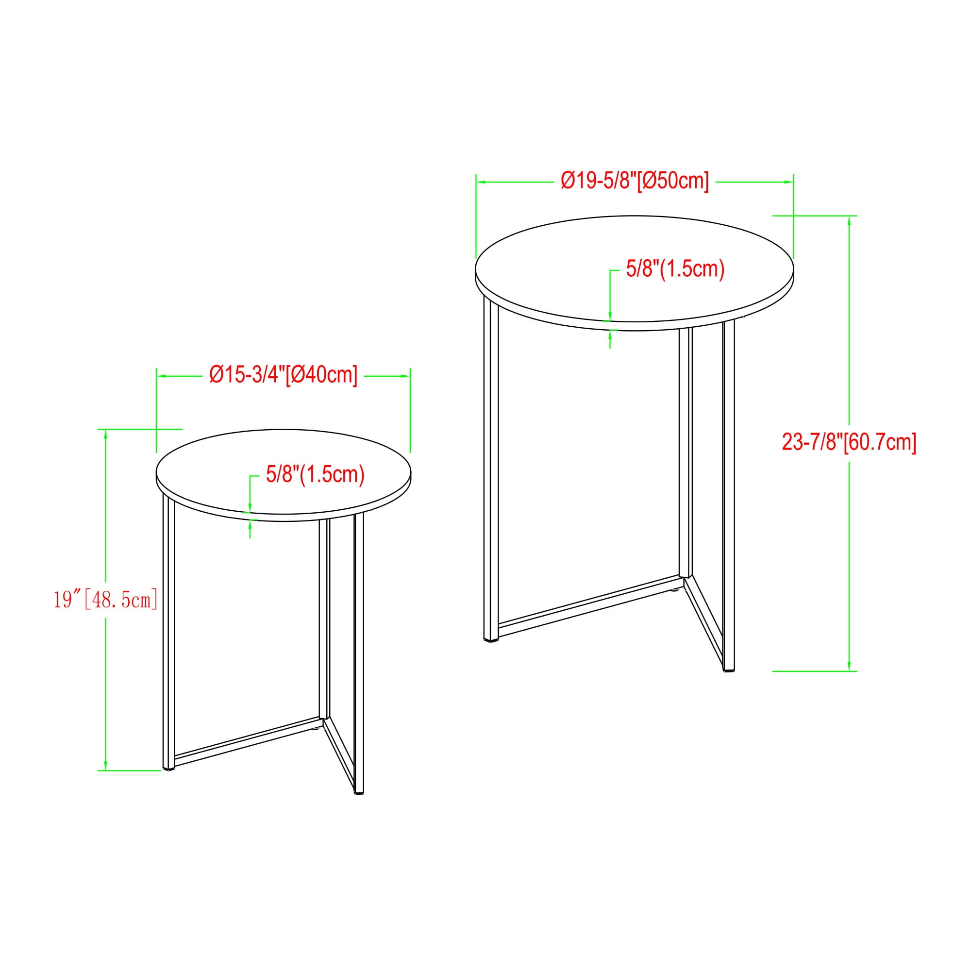 Large table: 19.75″ W x 19.75″ D x 24″ H Small table: 15.75″ W x 15.75″ D x 22.5″ H V-leg nesting end tables Ideal for small space living Set includes 2 tables Ships ready-to-assemble with step-by-step instructions