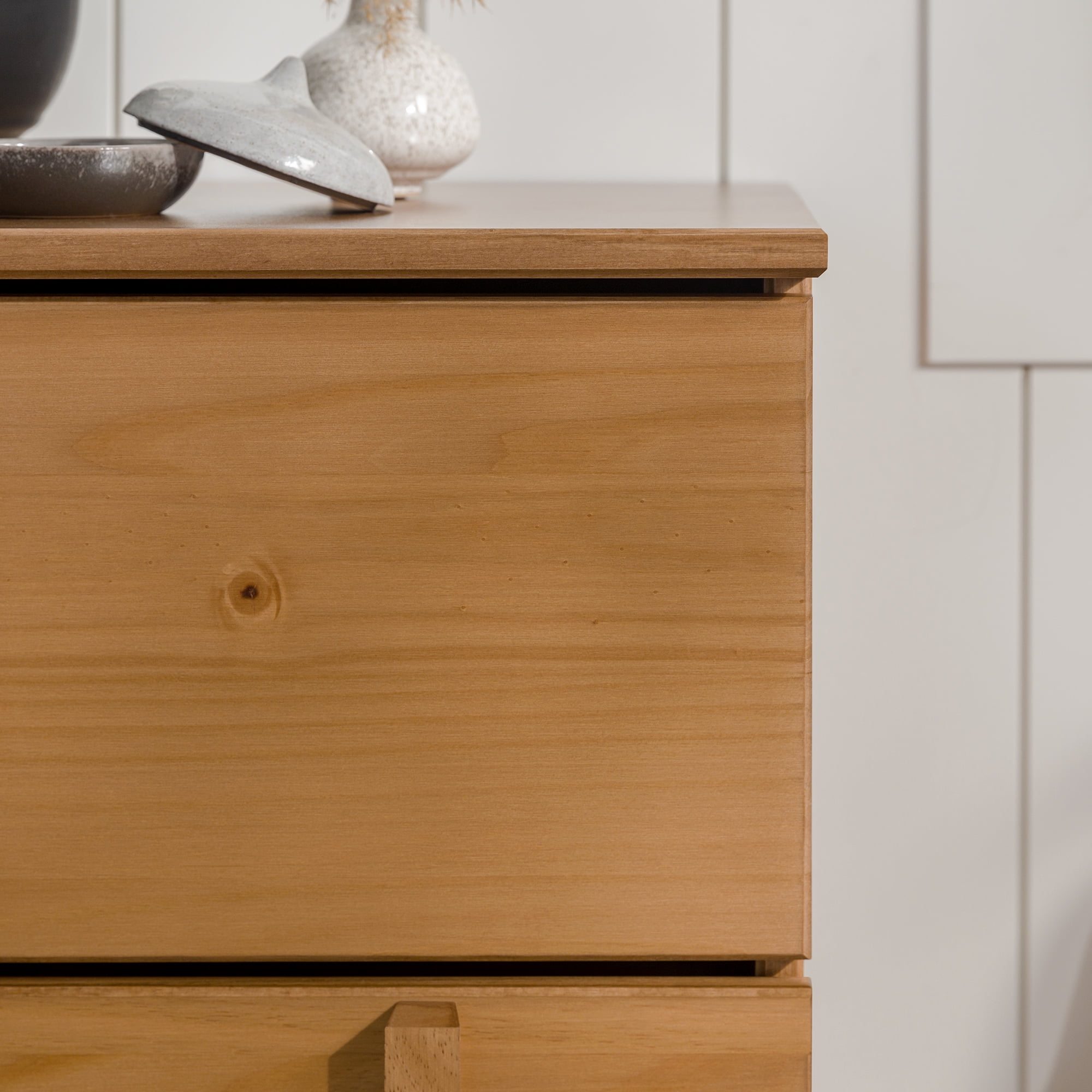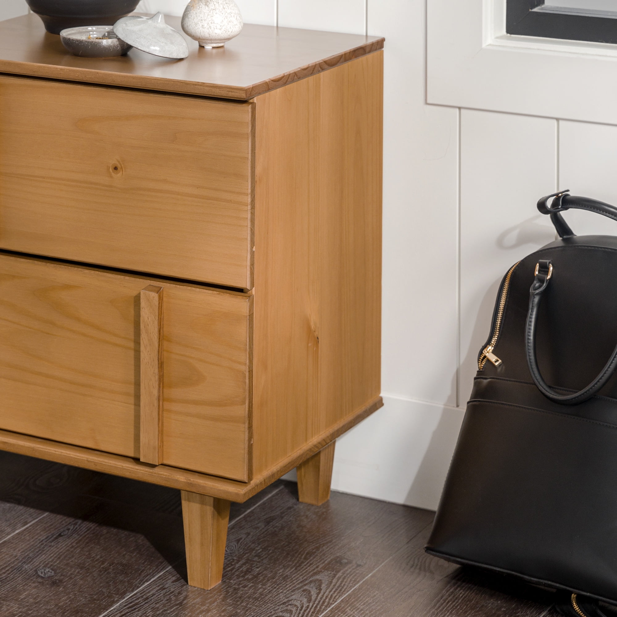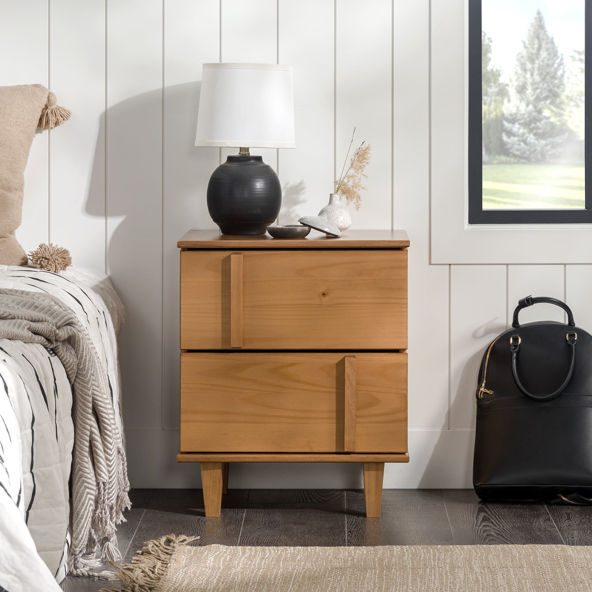 Introduce modern style with a fashion-forward twist with the Walker Edison Contemporary Vertical Drawer Pulls Solid Wood Nightstand. This sleek piece features unique, vertical drawer pulls that also act as contemporary detailing. The two drawers are perfect for storing nighttime essentials. This piece was designed with a contemporary silhouette that nods to mid-century modern design. The nightstand’s aesthetic is gender neutral, making it perfect for a wide range of bedroom style. Made from responsibly harvested solid pine wood, this piece will let you feel good knowing that your purchase is sustainable and sturdy.