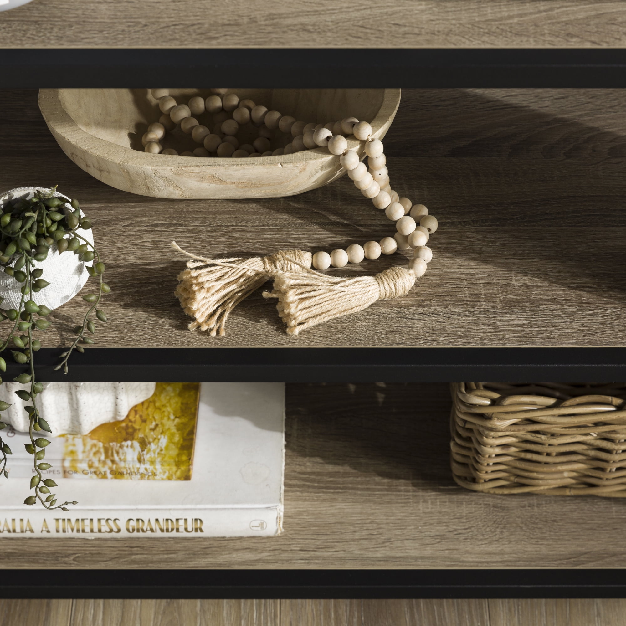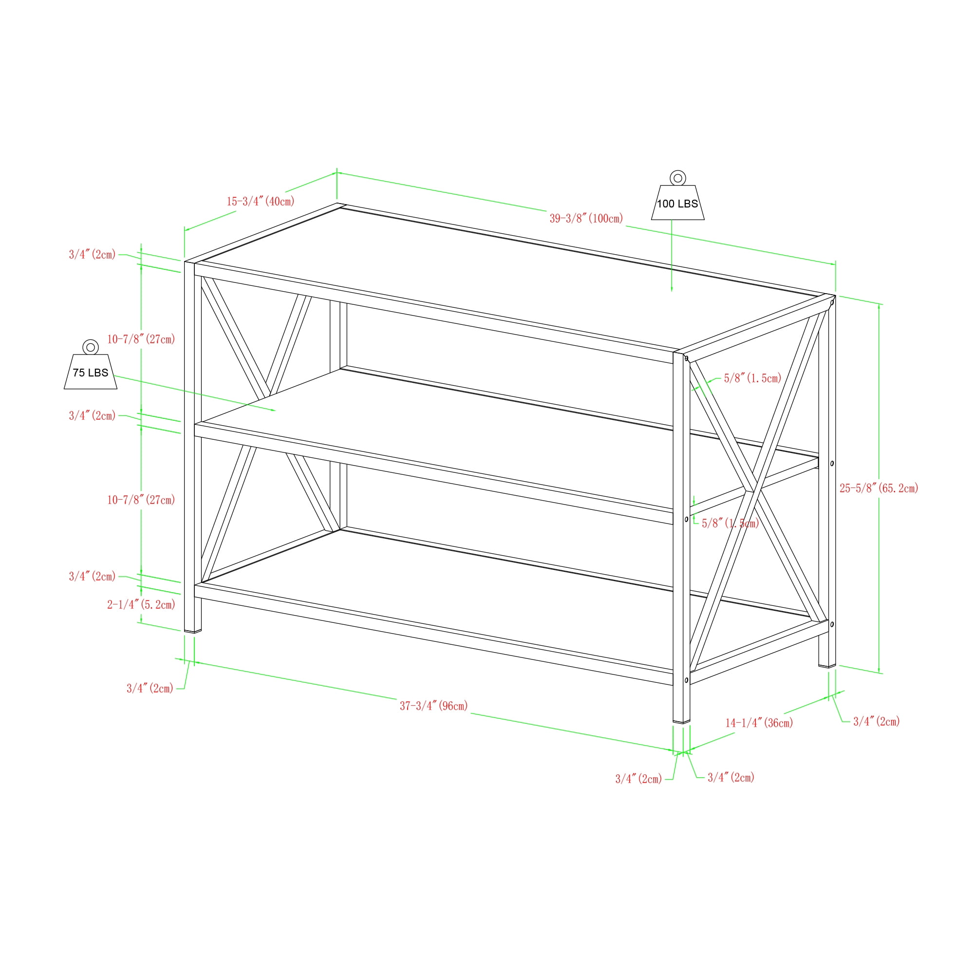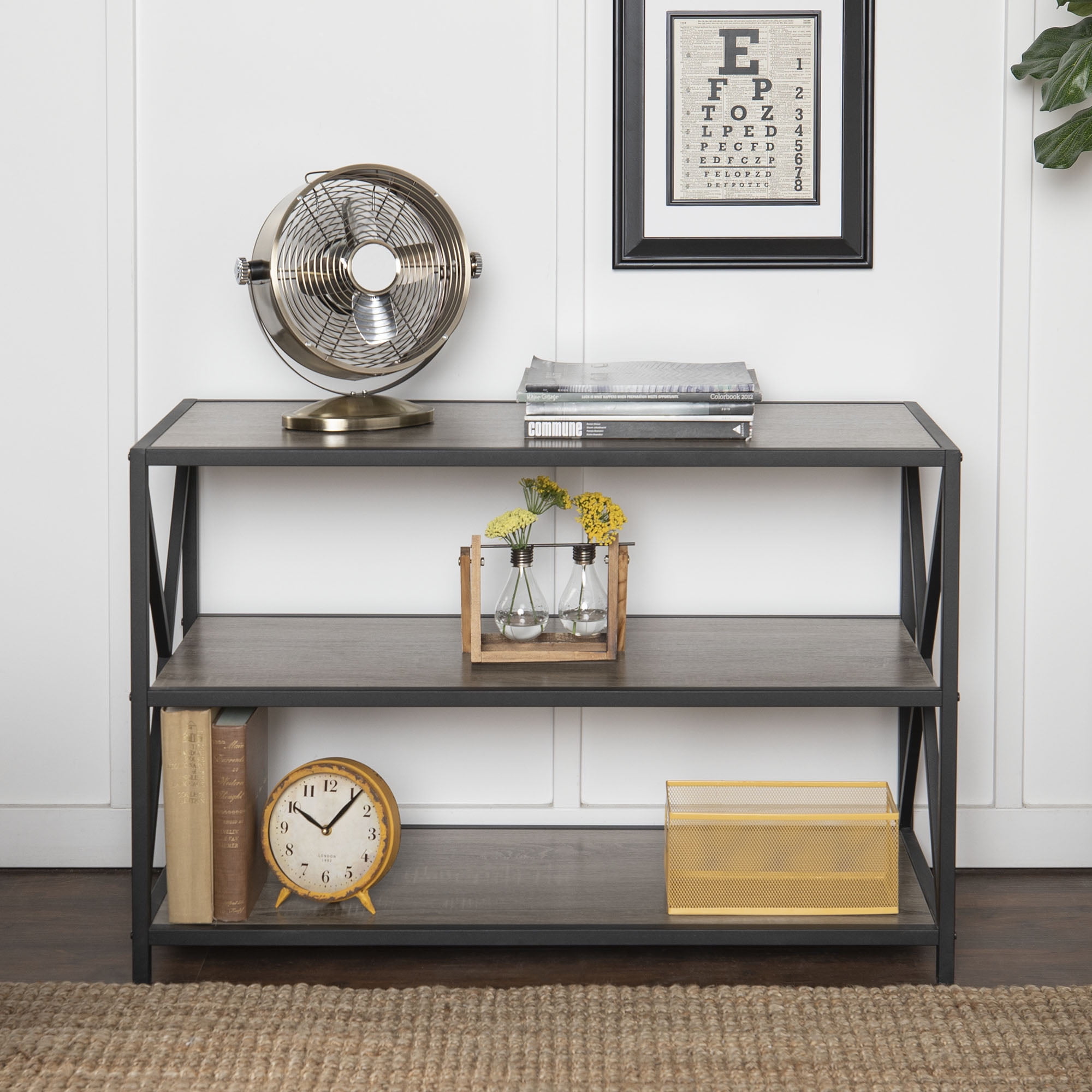 Industrial style design Mixed material console Three horizontal shelves Metal X-frame Versatile and multi-functional Fits TVs up to 44-inches Assembled Dimensions: 26″ H x 40” L x 16” W Packaged Dimensions: 7” H x 44” L x 20” W Assembly: Some assembly required Materials: High-grade MDF, premium laminate, powder-coated metal Ships in 1 box