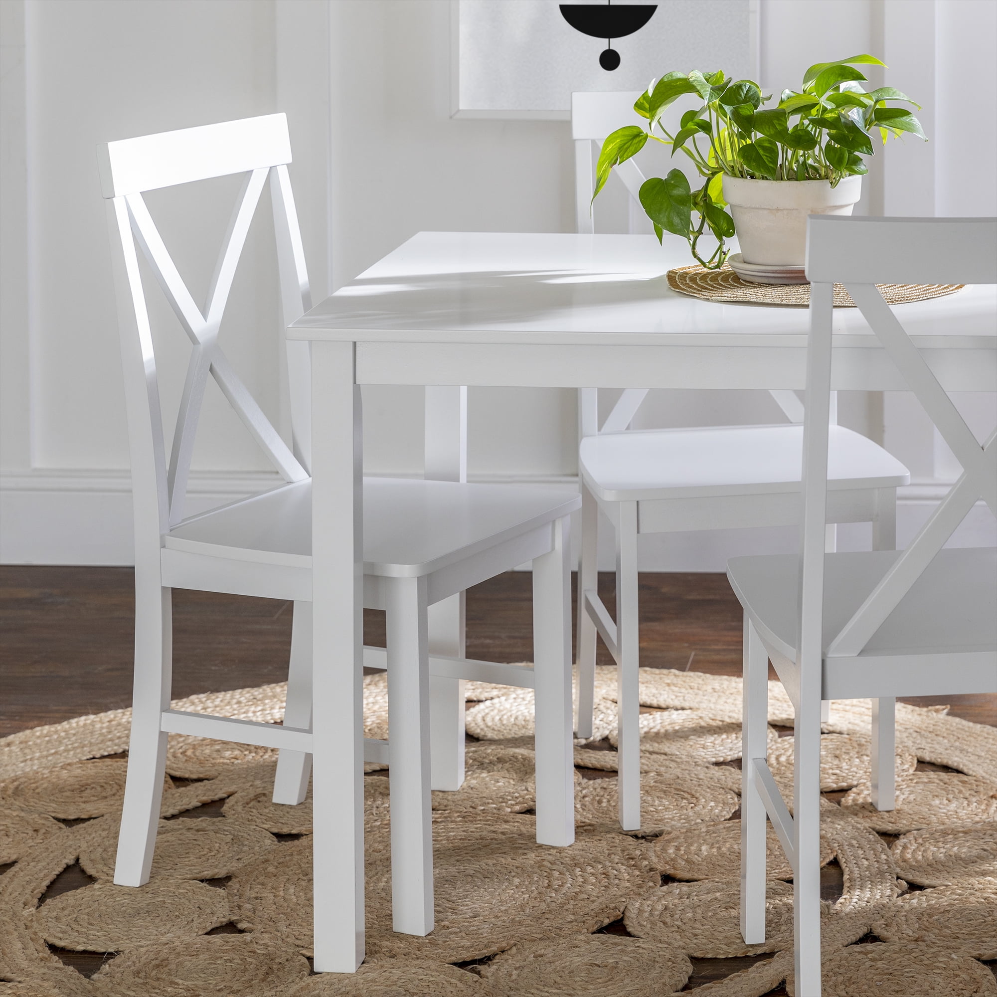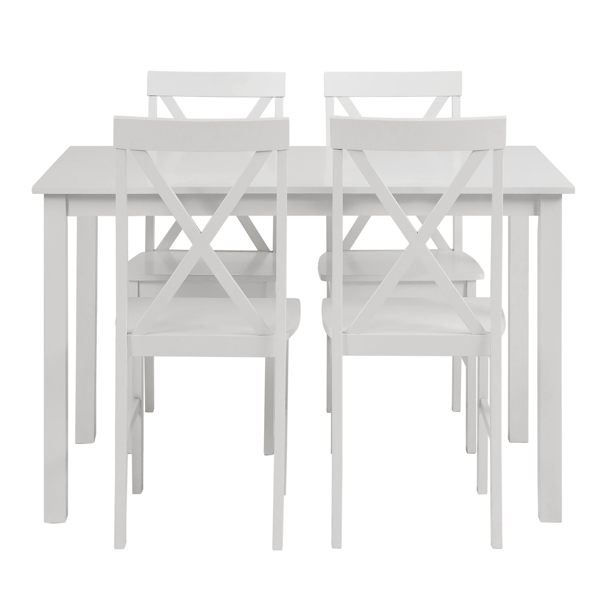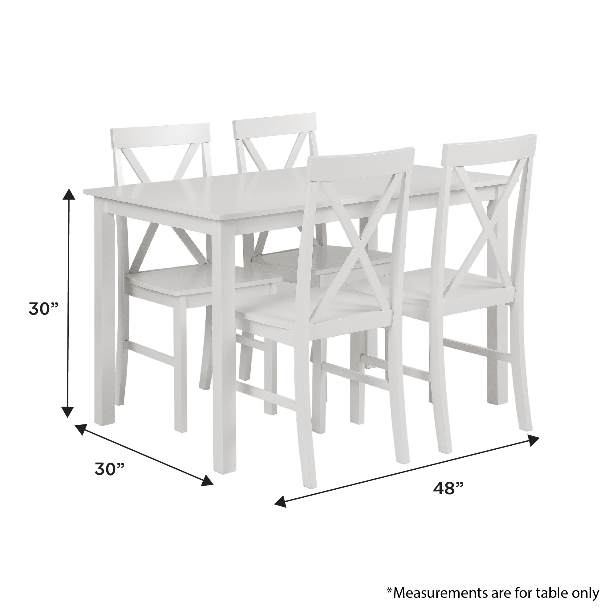 Modern farmhouse style Includes 4 dining chairs and a table Ideal for small space living X-back chair detail Solid rubberwood legs and table top Warp-resistant MDF wood seats Assembled Table Dimensions: 30″ H x 48″ L x 30″ W Chair Dimensions: 36” H x 19″ L x 16” W Ships ready-to-assemble with step-by-step instructions