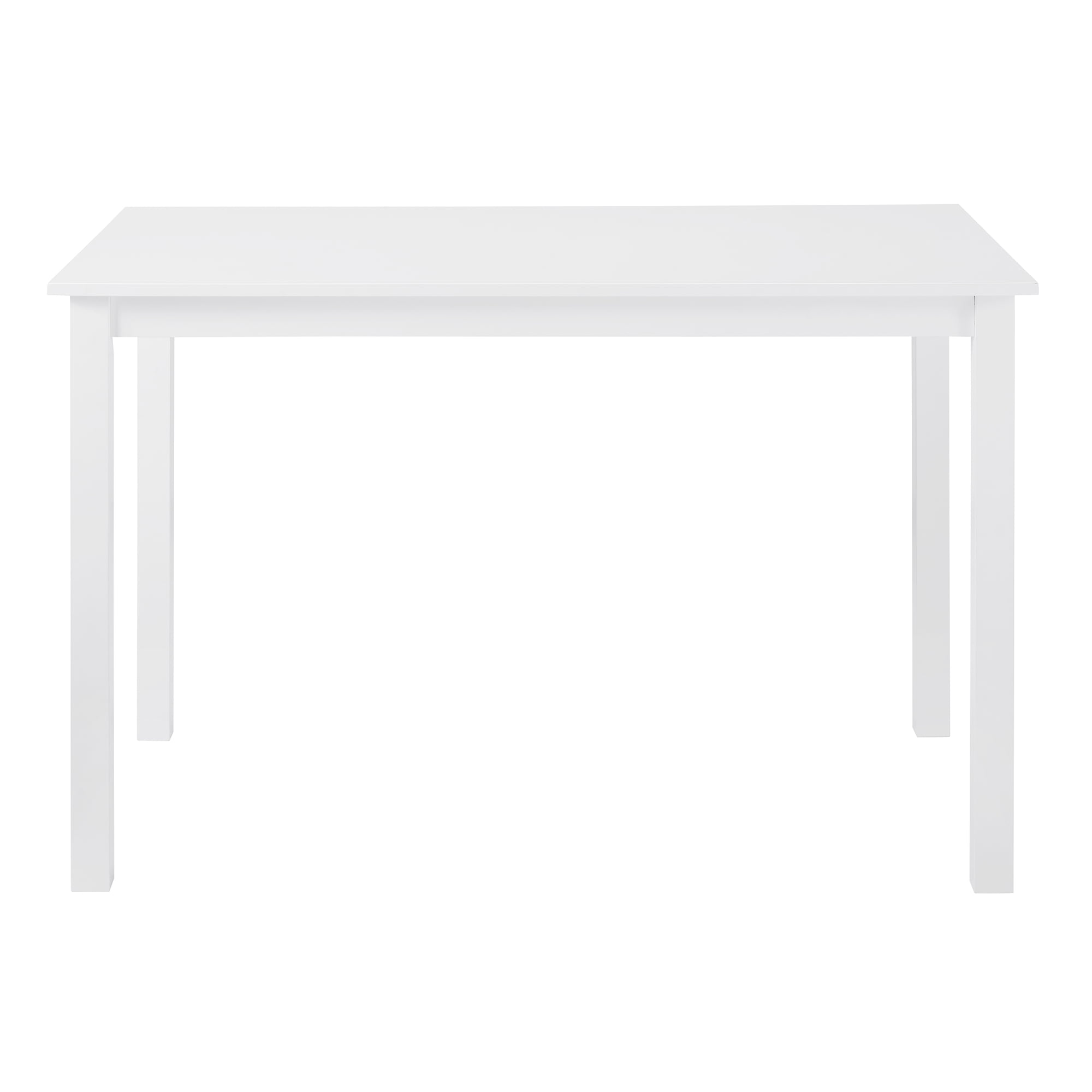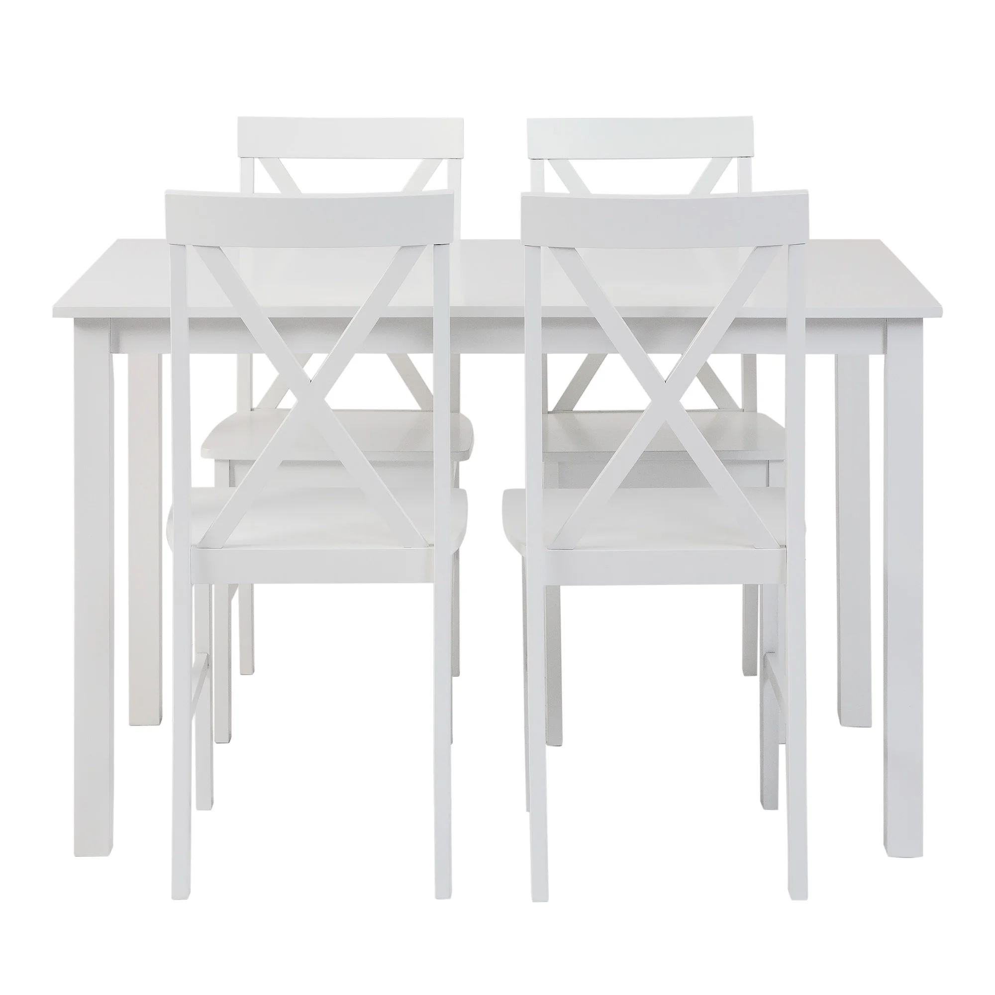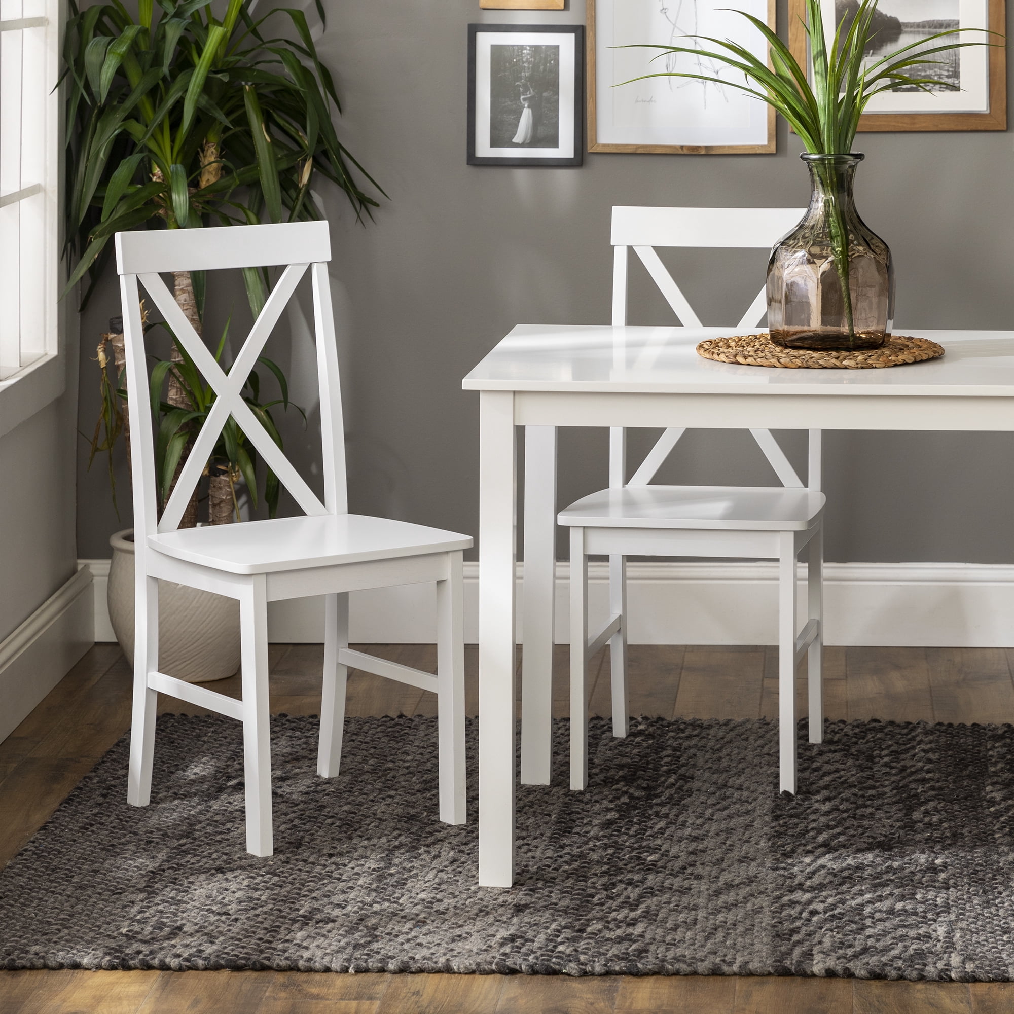 Modern farmhouse style Includes 4 dining chairs and a table Ideal for small space living X-back chair detail Solid rubberwood legs and table top Warp-resistant MDF wood seats Assembled Table Dimensions: 30″ H x 48″ L x 30″ W Chair Dimensions: 36” H x 19″ L x 16” W Ships ready-to-assemble with step-by-step instructions