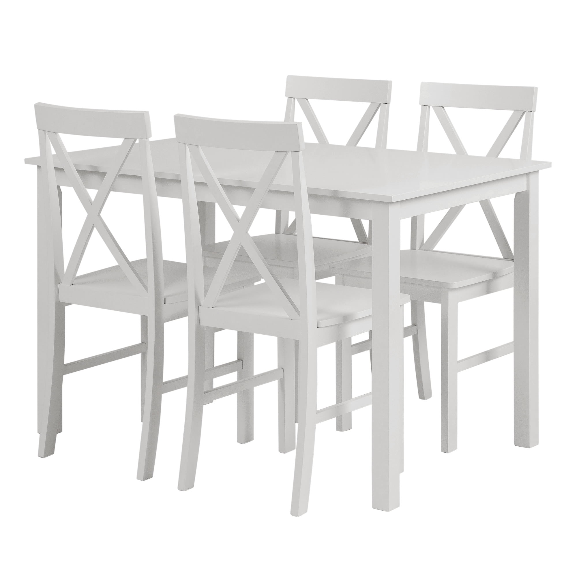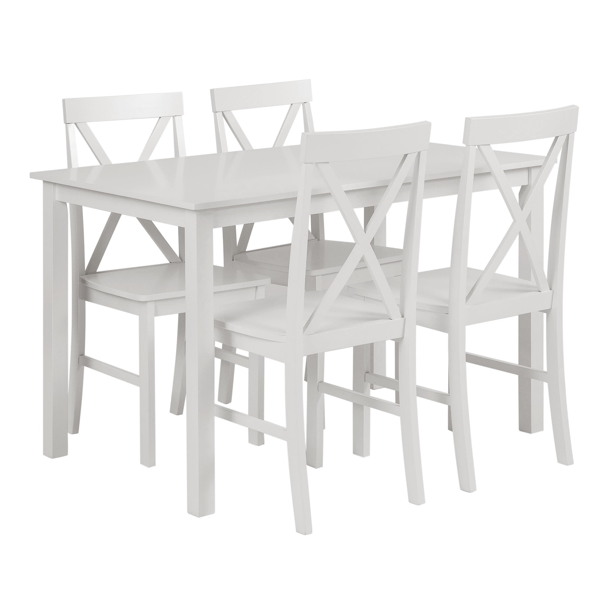 Simple with just the right amount of farmhouse flair, this 5-piece dining set is the best solution for a small space living situation. Its cozy dimensions make it a great fit for apartment kitchens as well as craft corners, game rooms, or breakfast nooks. The four solid wood chairs feature a dynamic X-back design with a slight curve for extra comfort while the solid wood table is clean, sturdy and stylistically versatile.