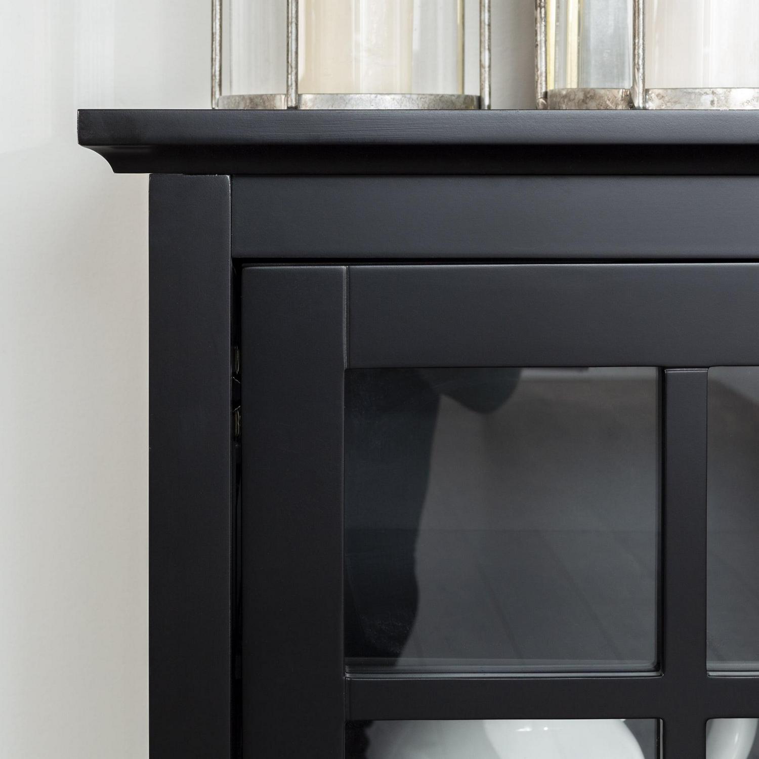 This highboy storage console from Walker Edison is ideal to store your items in any room. Whether in your bedroom as a storage console, in your living room as a TV stand, or in your kitchen as a buffet table, this highboy console is multifunctional. Featuring window paned side cabinets and two center drawers with a lower shelf, all for keeping your media, clothing, and more organized. For your electronics, books, DVDs, or decor, this entertainment center has plenty of space from its highboy style. The shelves behind the glass cabinet doors are adjustable to fit your items the way you like them. Made of high-grade MDF and painted finish for a transitional style to your home.