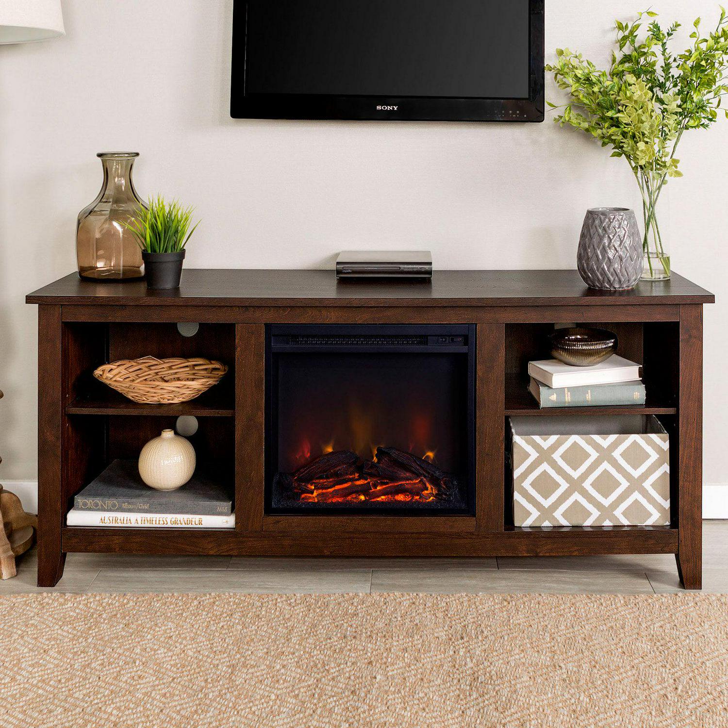 The charming and functional style of the Walker Edison 58-in. Wood Fireplace Media TV Stand Console makes it the perfect piece to center your family around. This rustic-inspired piece features a wide top for a flat-panel TV above an electric fireplace. This emission-free fireplace uses nothing more than a standard wall outlet to provide light. The ceramic interior has the look of crackling logs, but there’s no burning fuel, cinders, sparks, or ash to concern yourself with. The fireplace is flanked by two open storage compartments with adjustable shelves. The body of this console is crafted from high-grade engineered wood with a scratch-resistant laminate finish. The rustic brown tone of the finish gives it a classic feel that will make it right at home in your space.